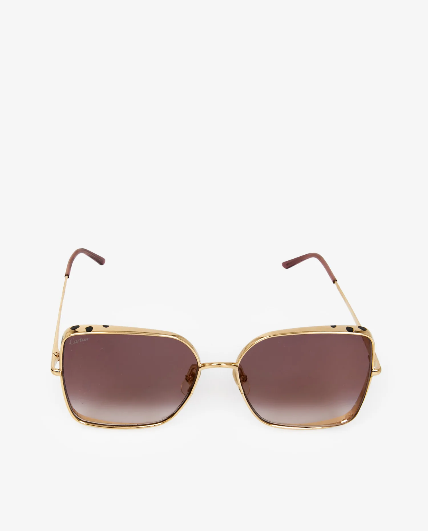 La face avant adopte une forme carrée légèrement papillon, avec des angles adoucis pour flatter la ligne du visage. Les verres, teintés d’un brun profond aux reflets rosés et violacés, sont mis en valeur par une monture métallique dorée brillante plaqué Or 24K. Sur les flancs, les inserts noirs laqués en forme de taches rappellent discrètement l’esthétique Panthère, emblème iconique de Cartier. Les plaquettes réglables et les charnières renforcées témoignent d’une conception haut de gamme pensée pour un usage quotidien.
