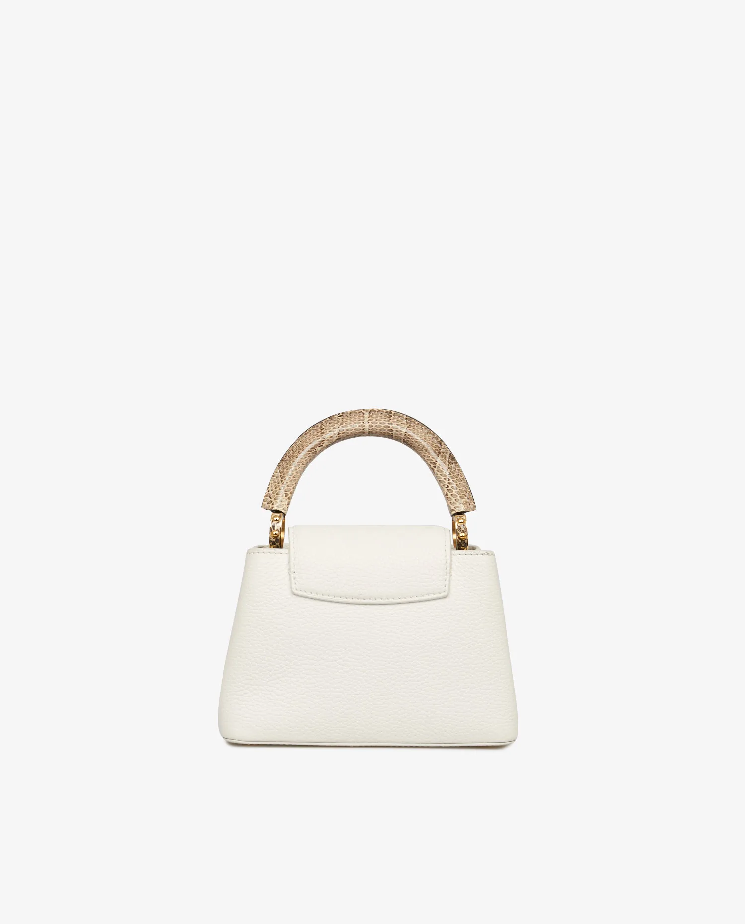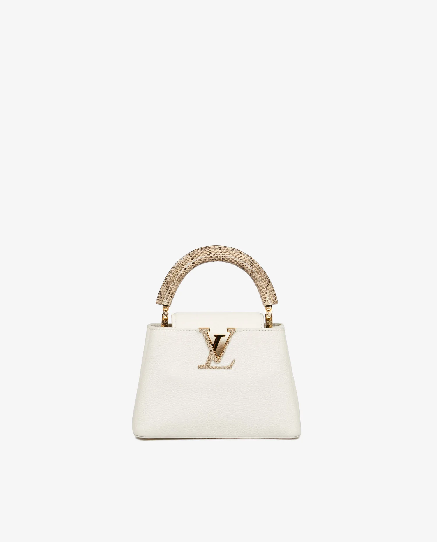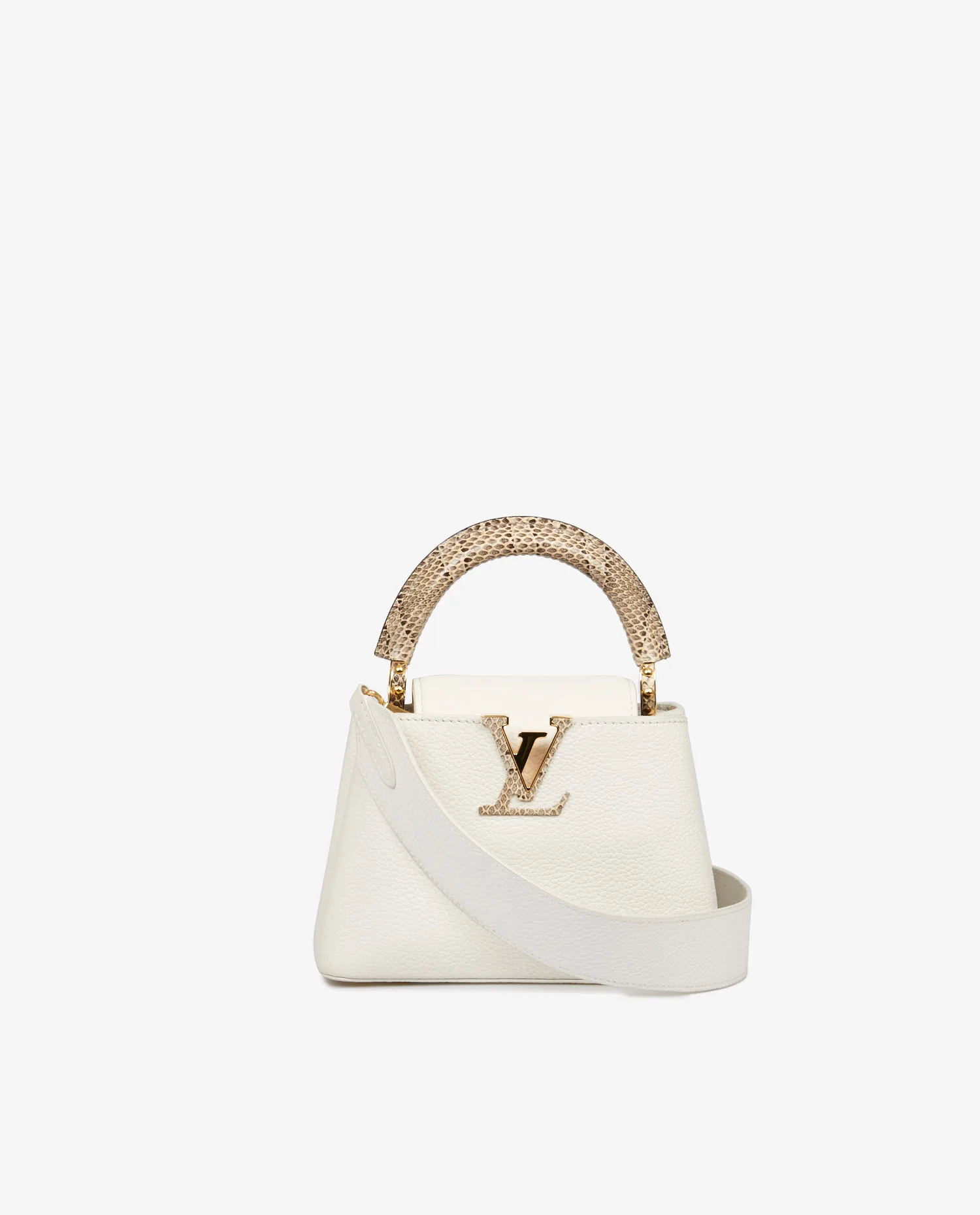 Sac Mini Capucine Louis Vuitton en cuir grainé blanc. Porté main ou à l’épaule (115cm). Finitions python. En très bon état. Prix public 2023 : 5300e.