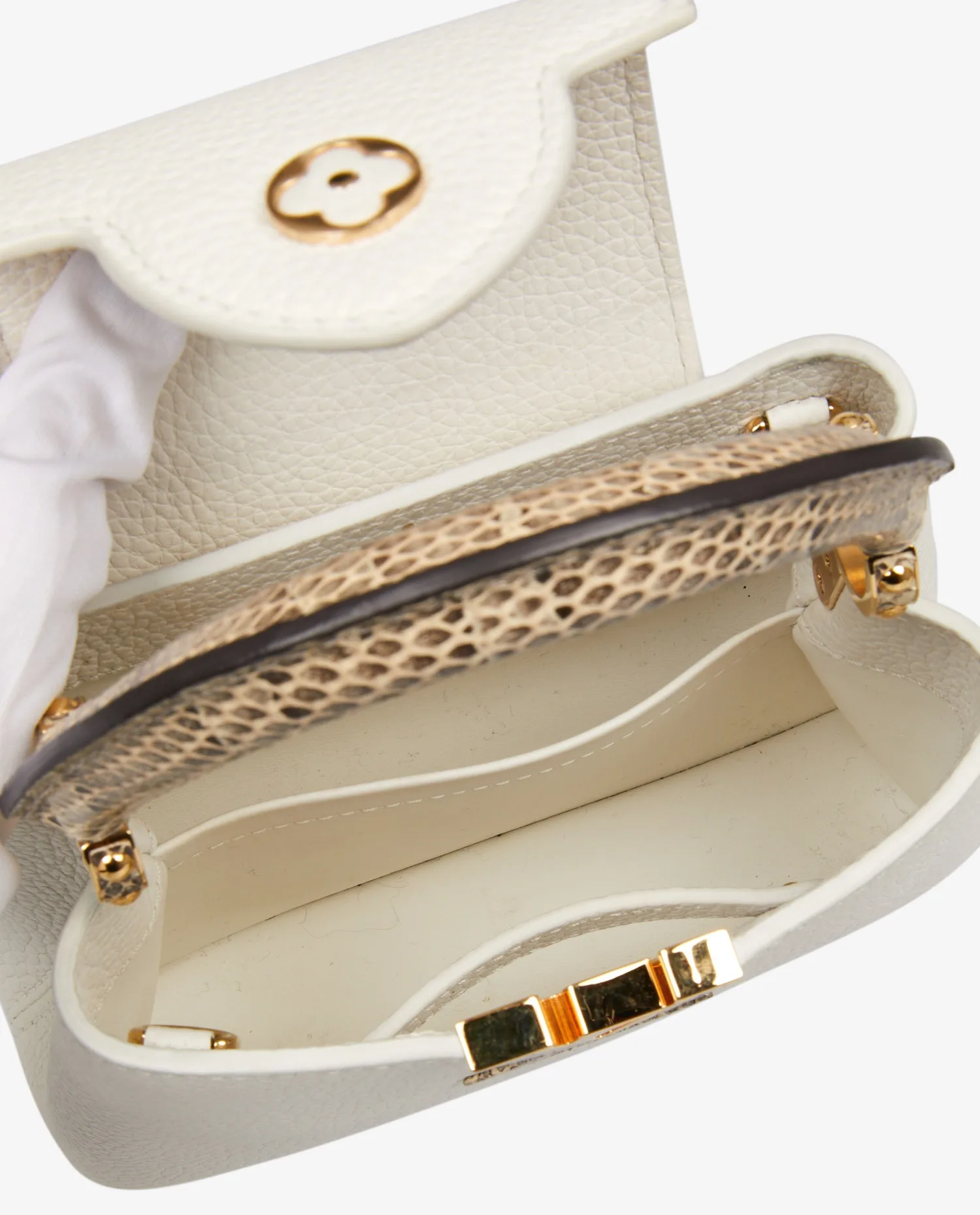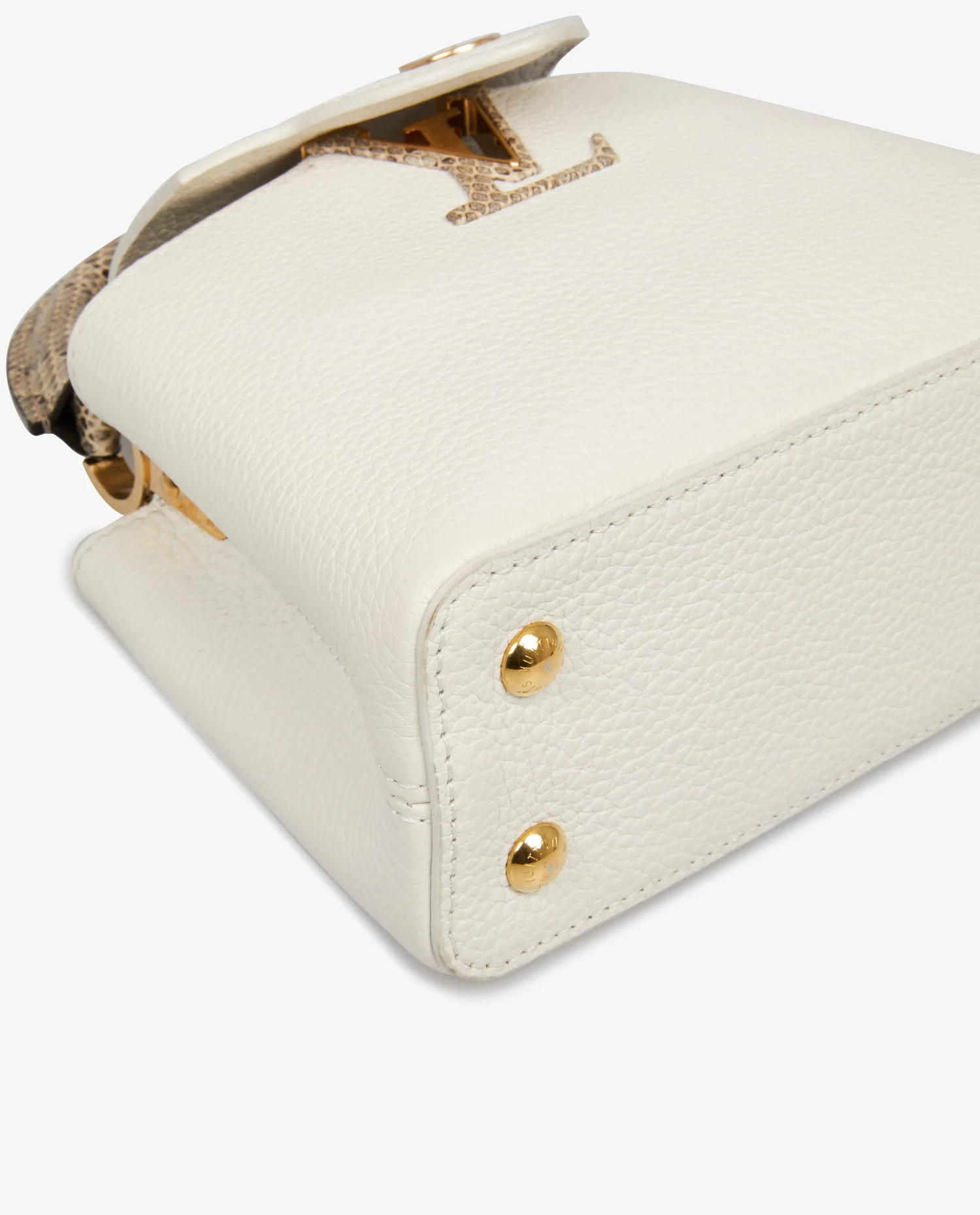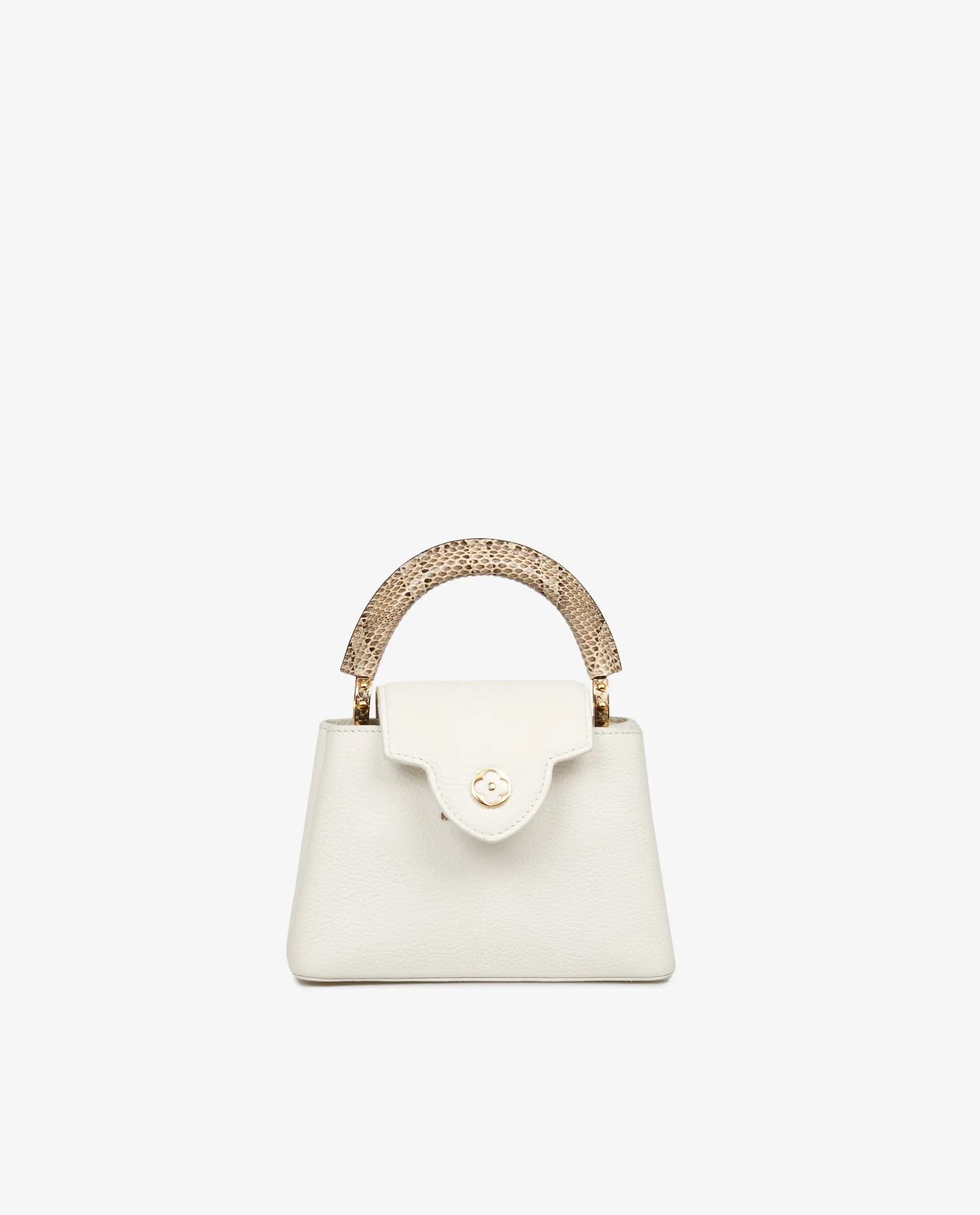 Sac Mini Capucine Louis Vuitton en cuir grainé blanc. Porté main ou à l’épaule (115cm). Finitions python. En très bon état. Prix public 2023 : 5300e.