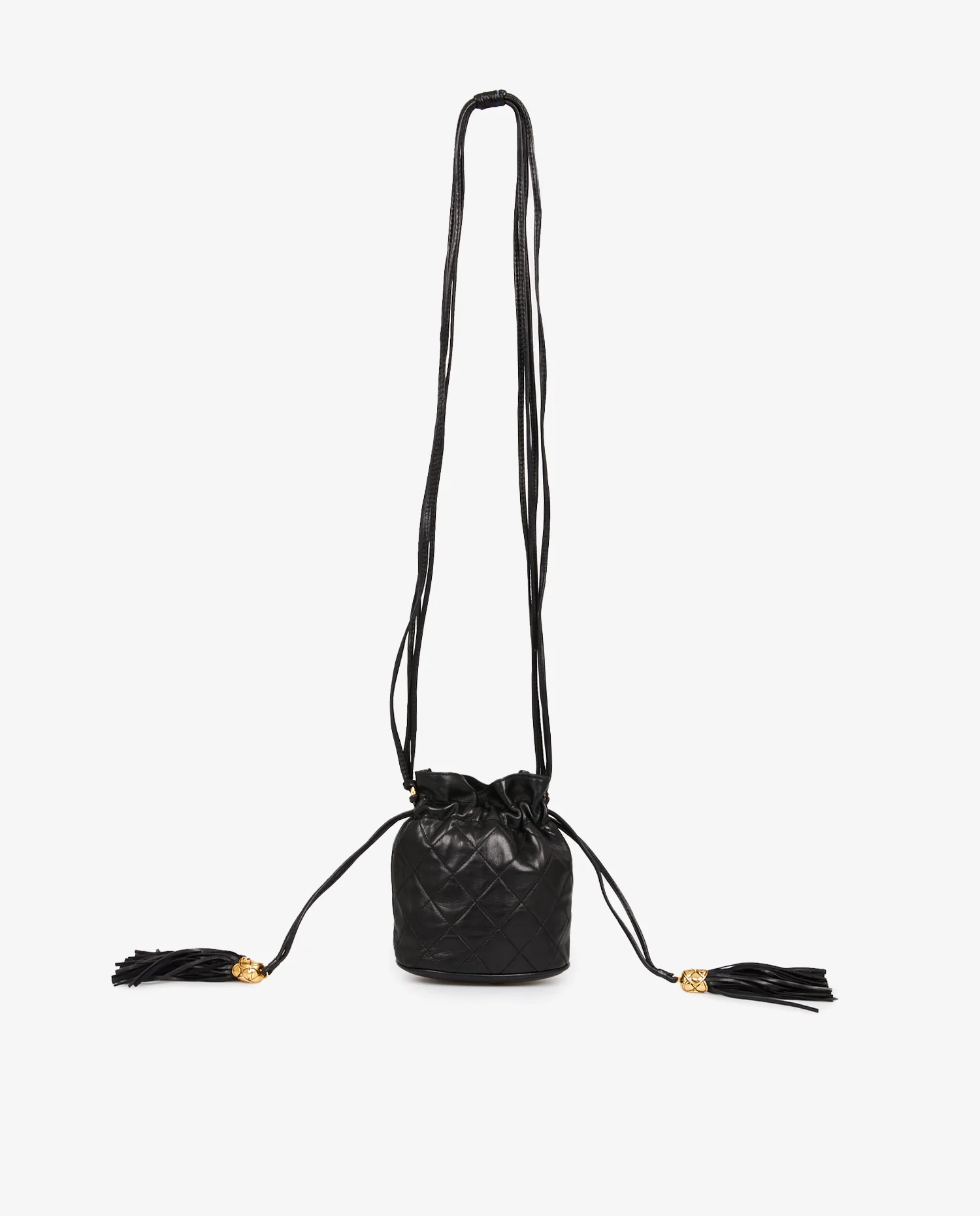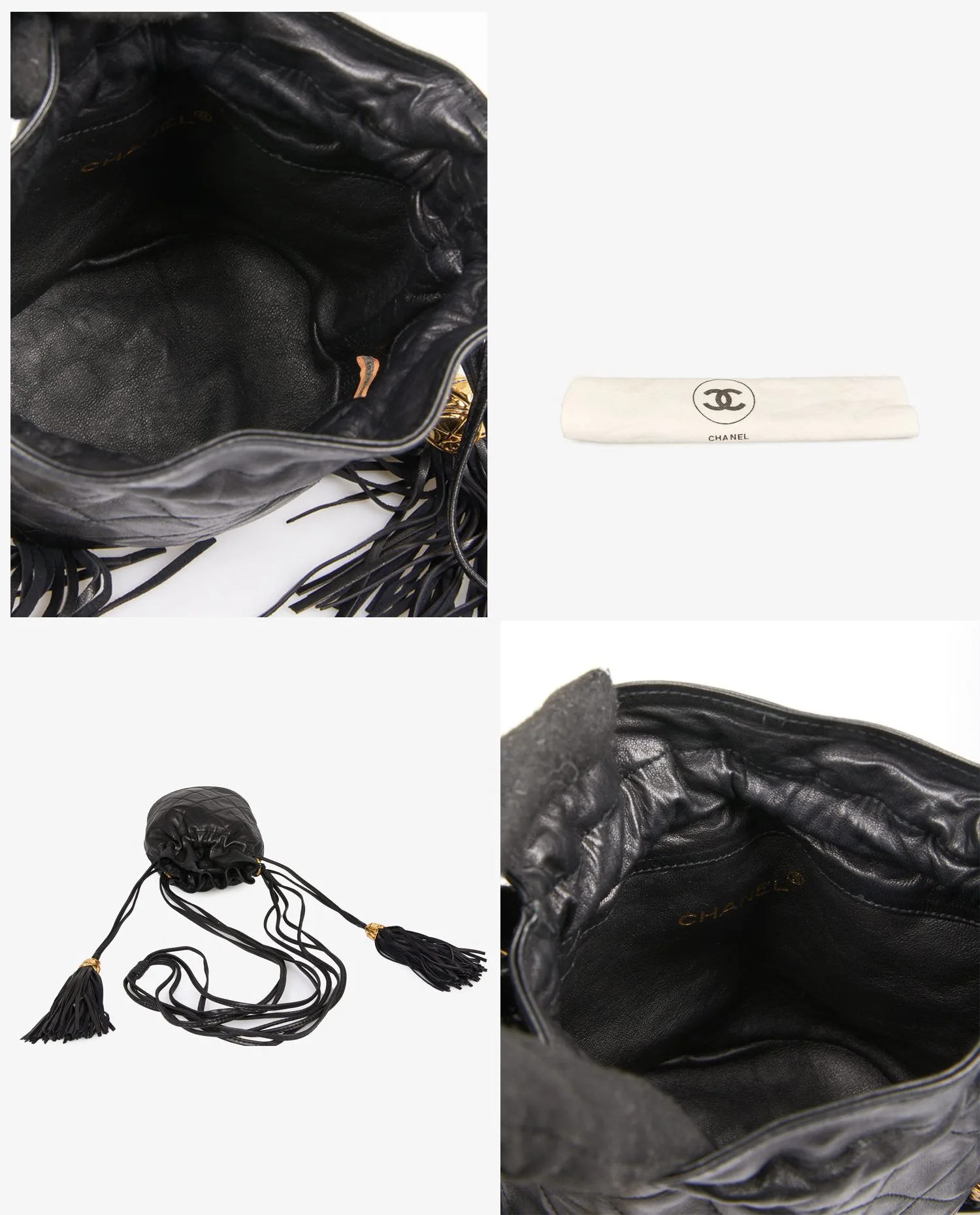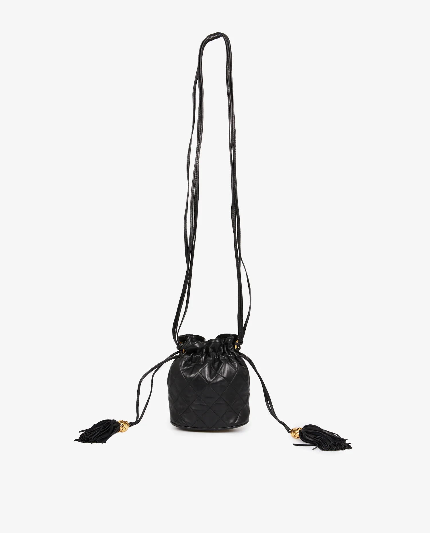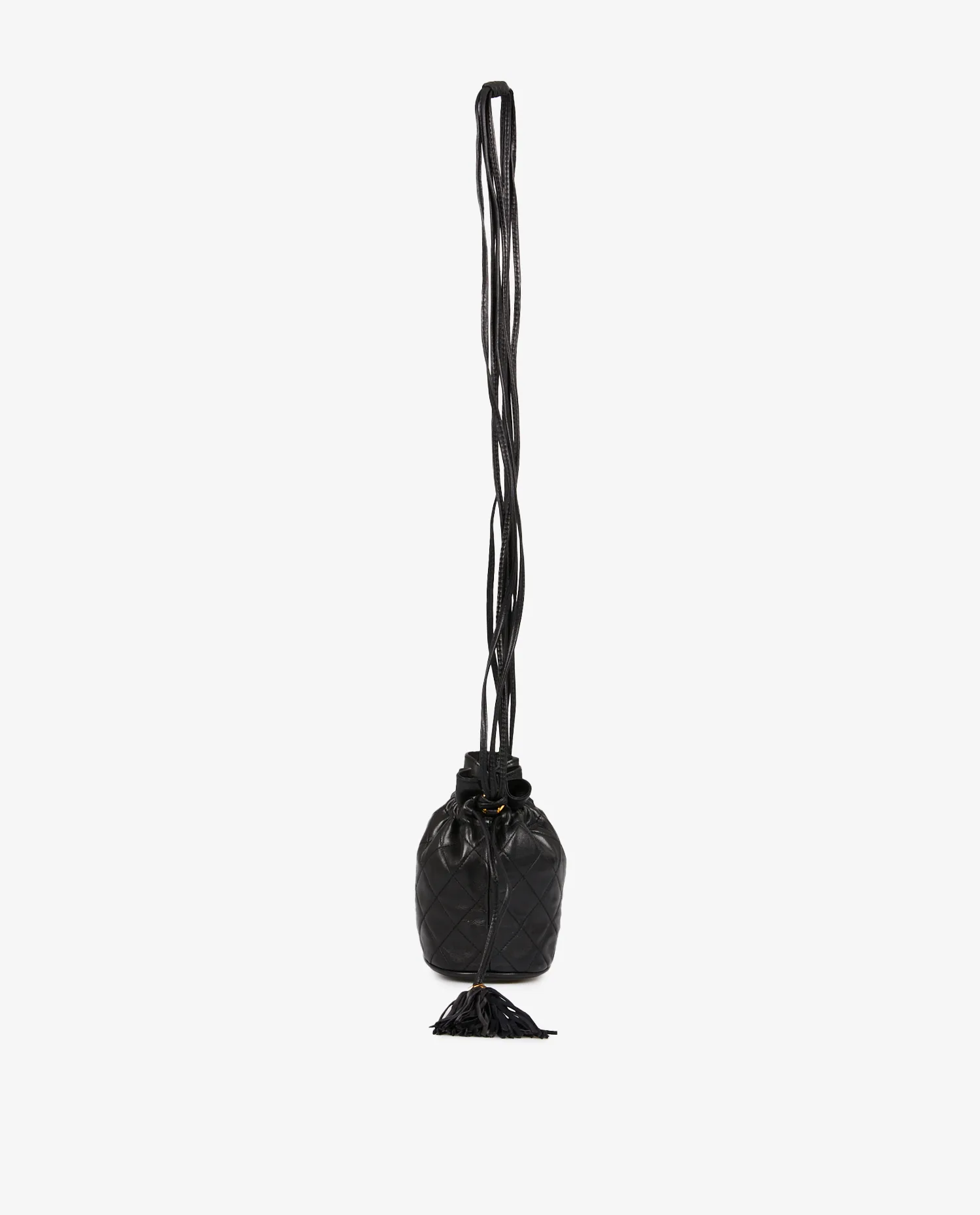 Mini sac Bourse vintage Chanel en cuir d’agneau noir matelassé. Porté épaule ou en bandoulière (113cm). En très bon état.