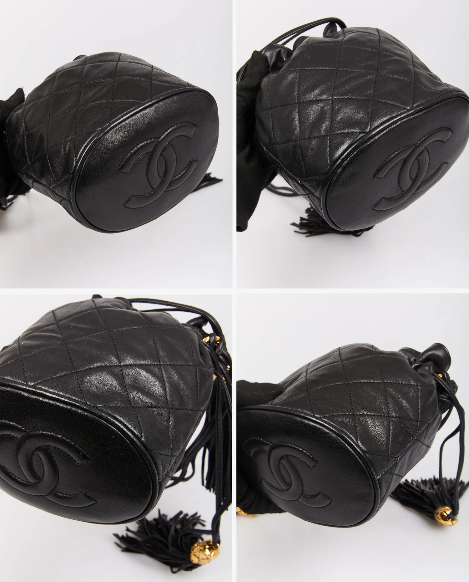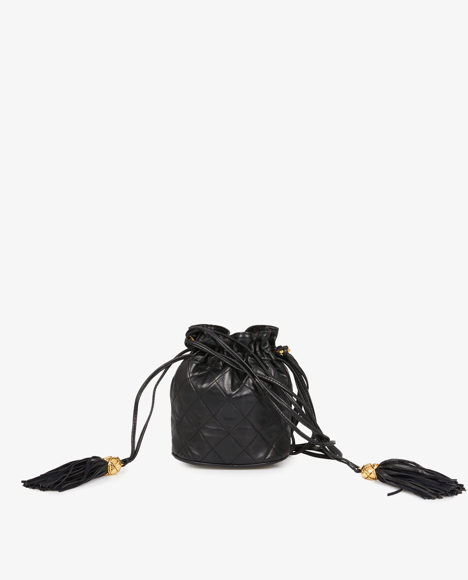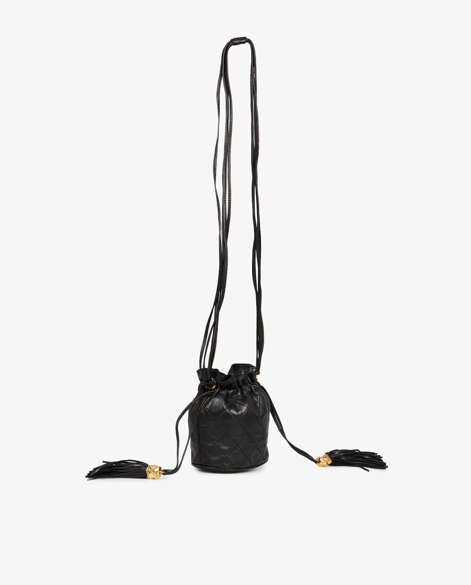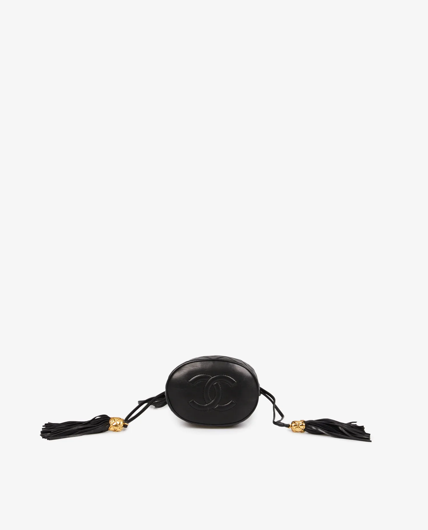 Mini sac Bourse vintage Chanel en cuir d’agneau noir matelassé. Porté épaule ou en bandoulière (113cm). En très bon état.
