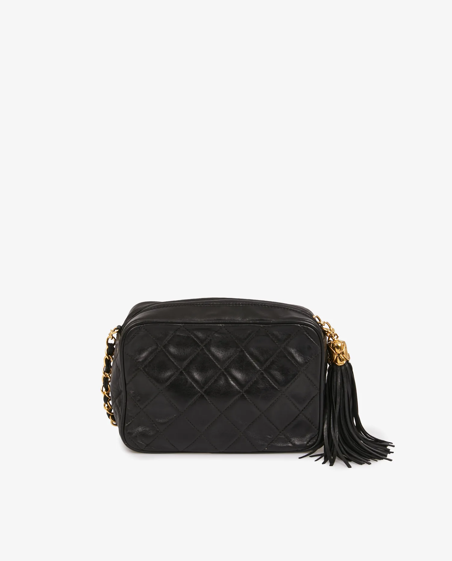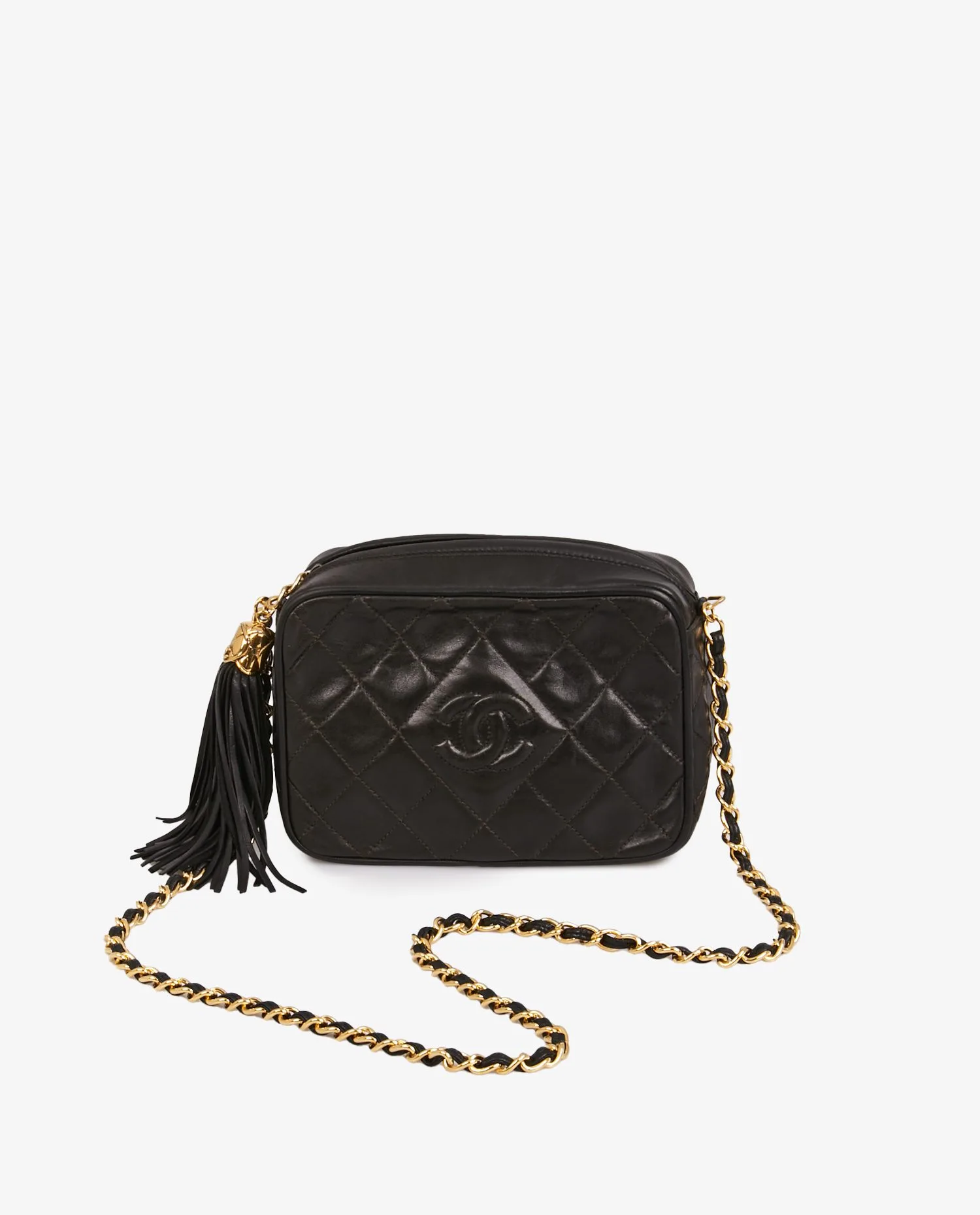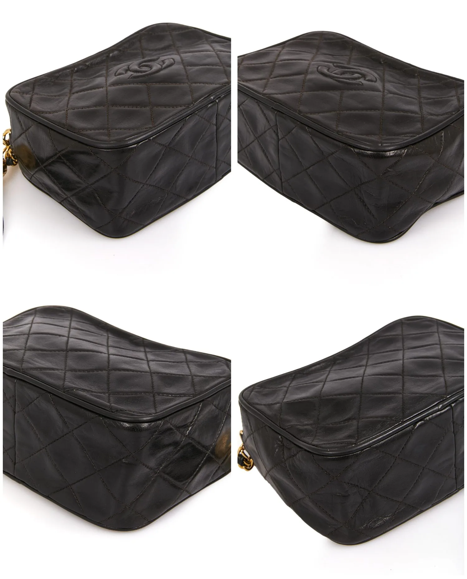 Mini sac Caméra Chanel vintage en cuir d’agneau matelassé noir. La bijouterie est dorée. Fermeture zippée. Porté épaule ou crossbody à l’aide d’une bandoulière chaine et cuir (101cm). En très bon état.