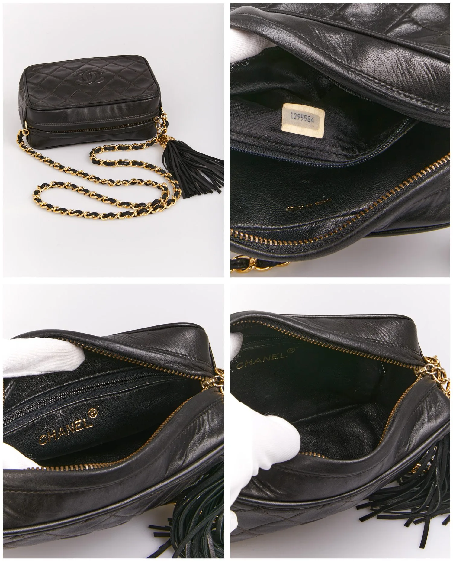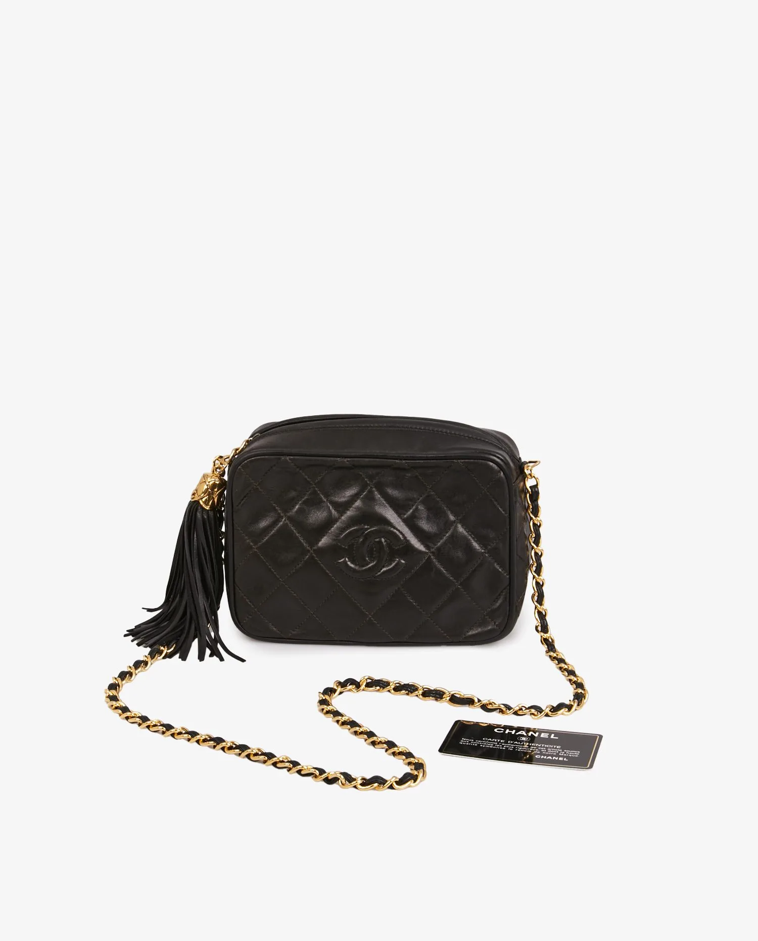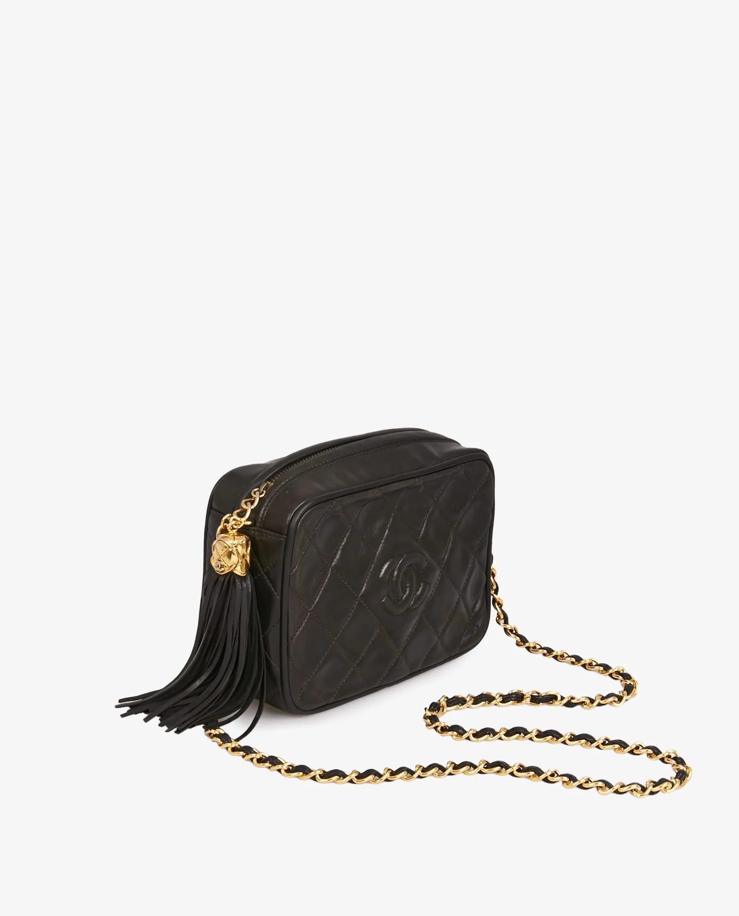 Mini sac Caméra Chanel vintage en cuir d’agneau matelassé noir. La bijouterie est dorée. Fermeture zippée. Porté épaule ou crossbody à l’aide d’une bandoulière chaine et cuir (101cm). En très bon état.