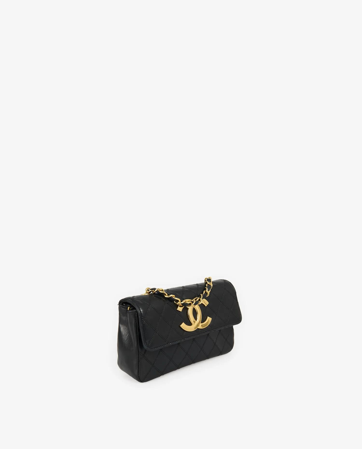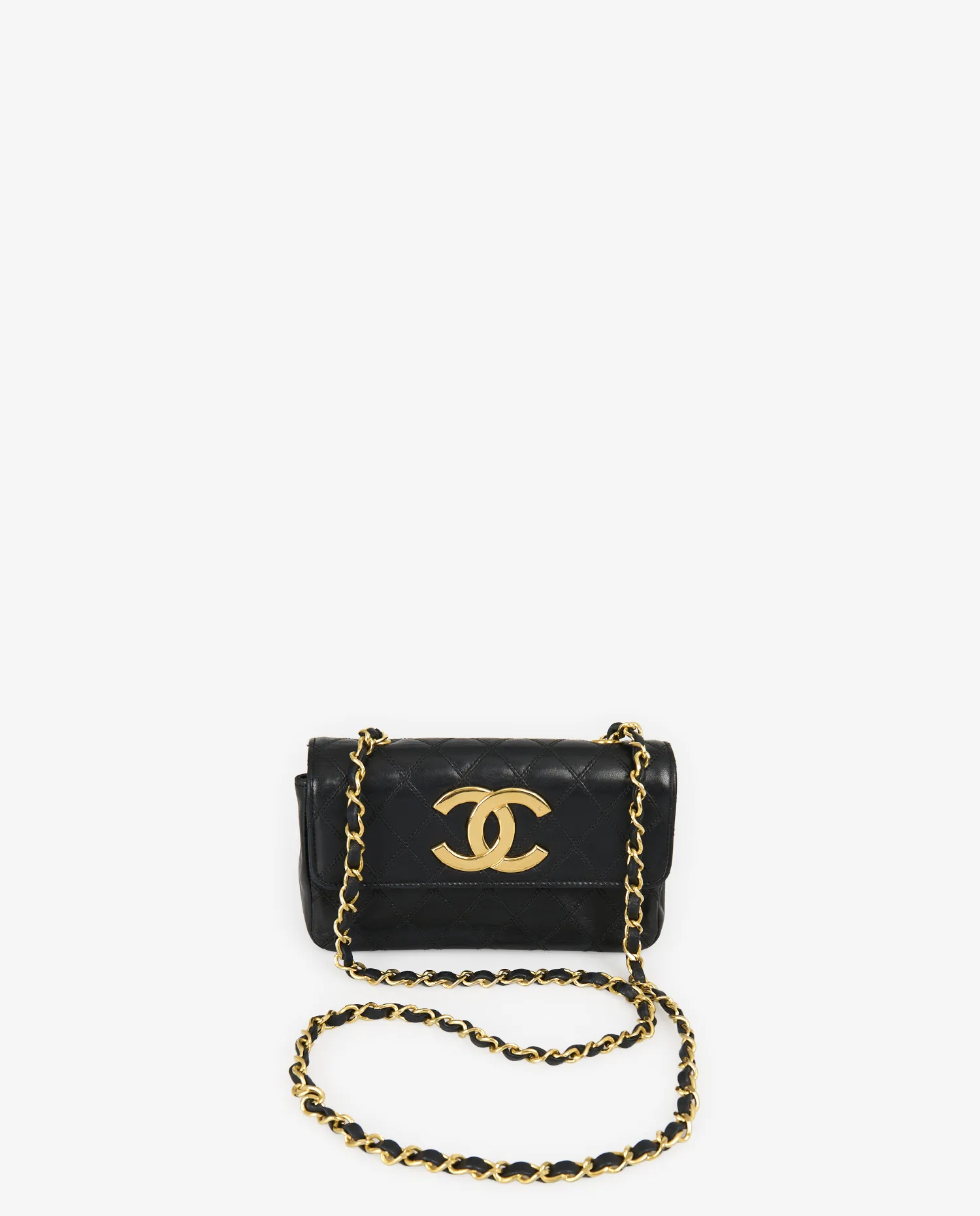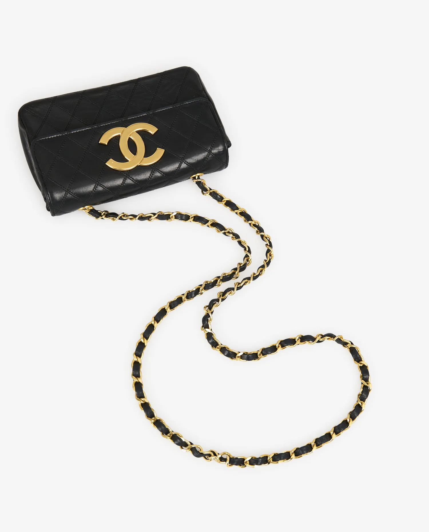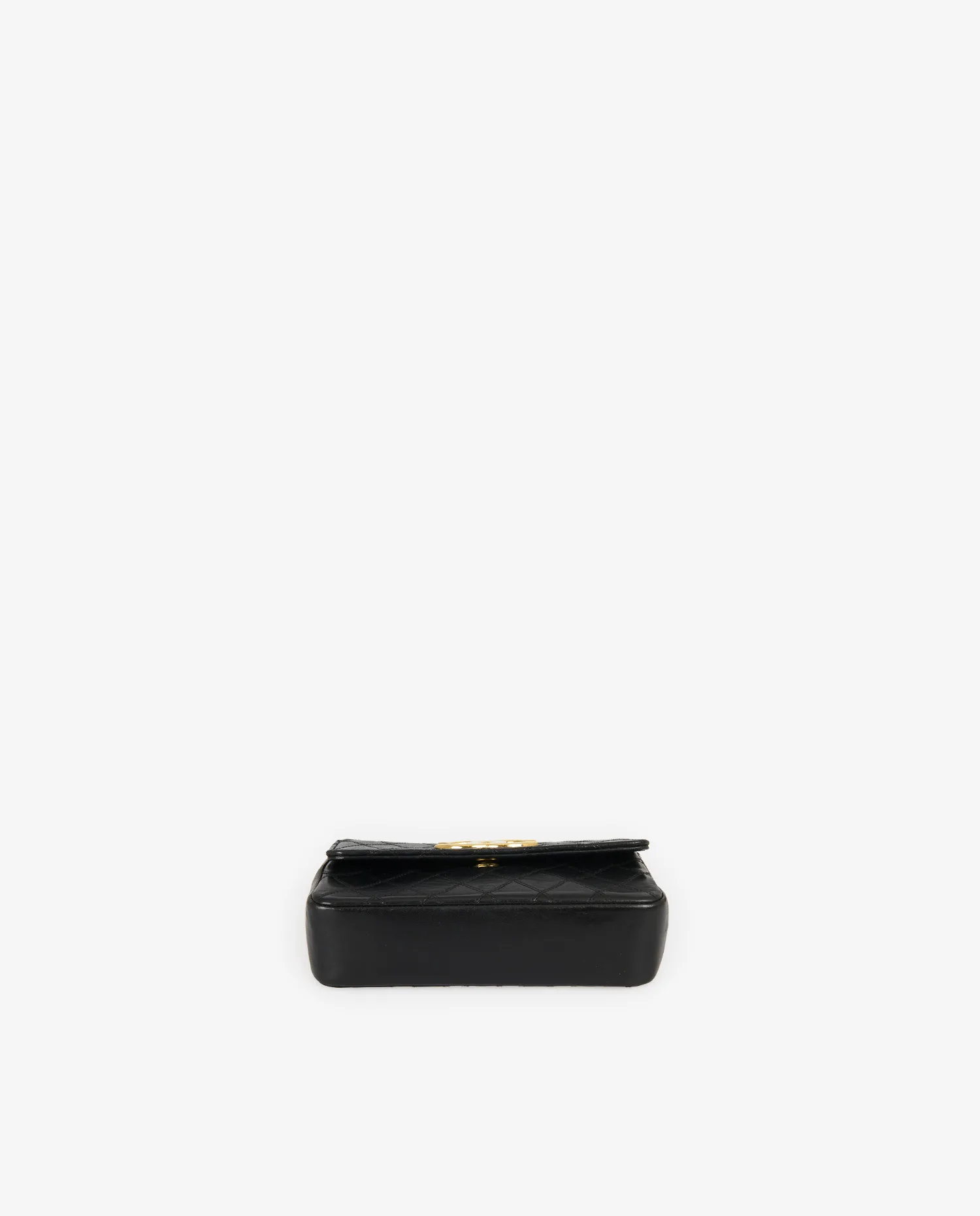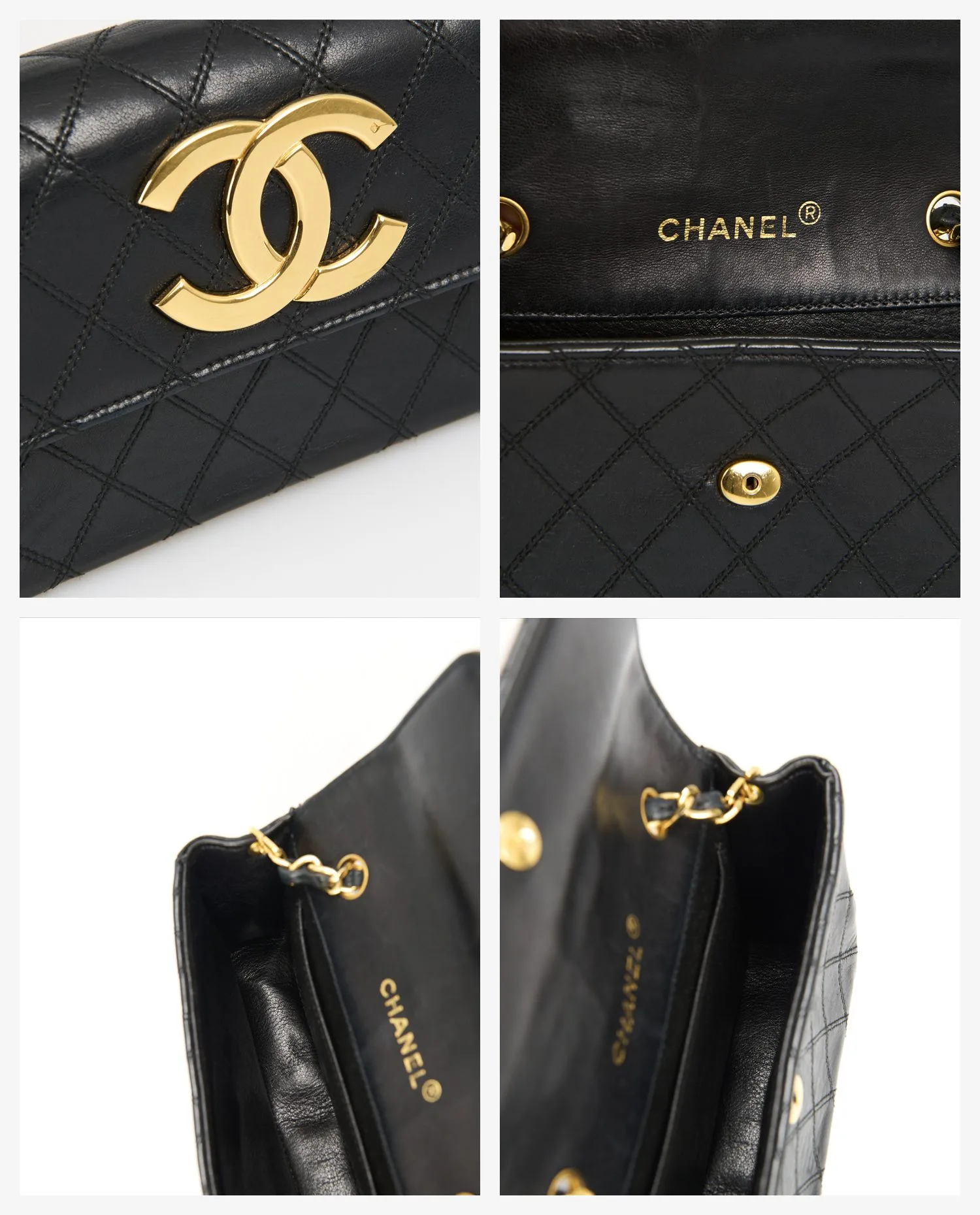 L’intérieur, doublé de cuir noir lisse, se compose d’un compartiment principal et d’une petite poche plaquée, suffisante pour accueillir des essentiels tels que cartes, clés ou rouge à lèvres. Le marquage “CHANEL®” en lettres dorées figure à l’intérieur du rabat, confirmant l’origine de la pièce.