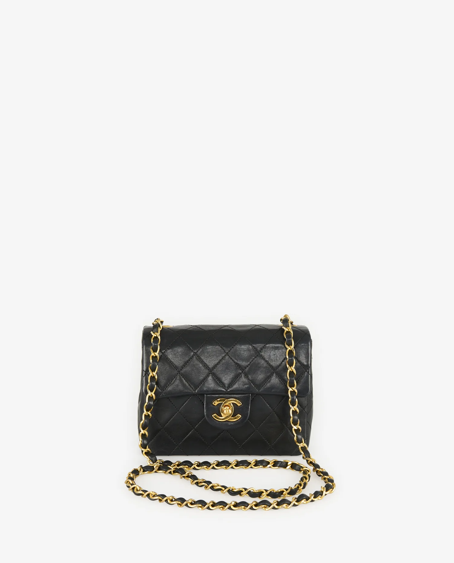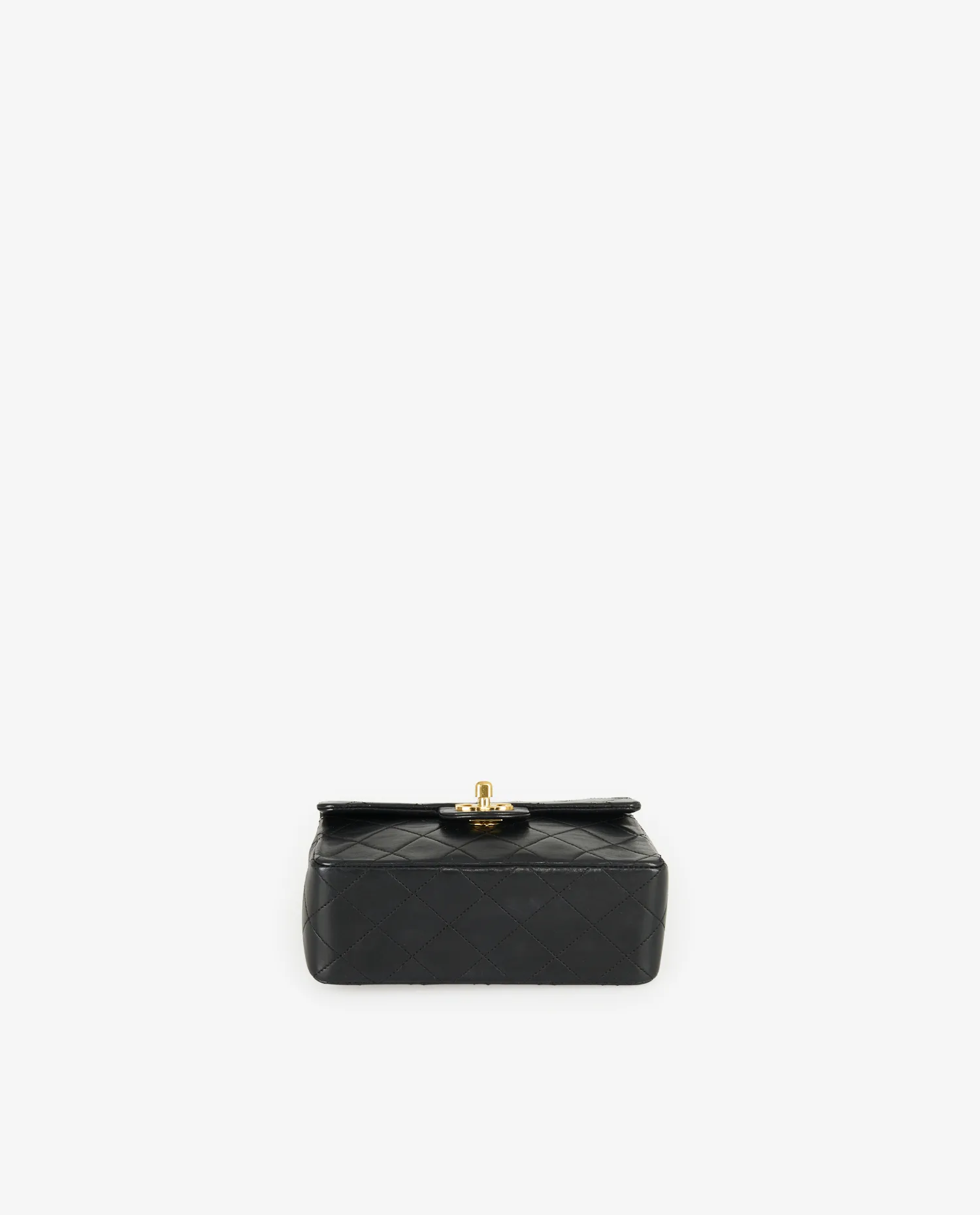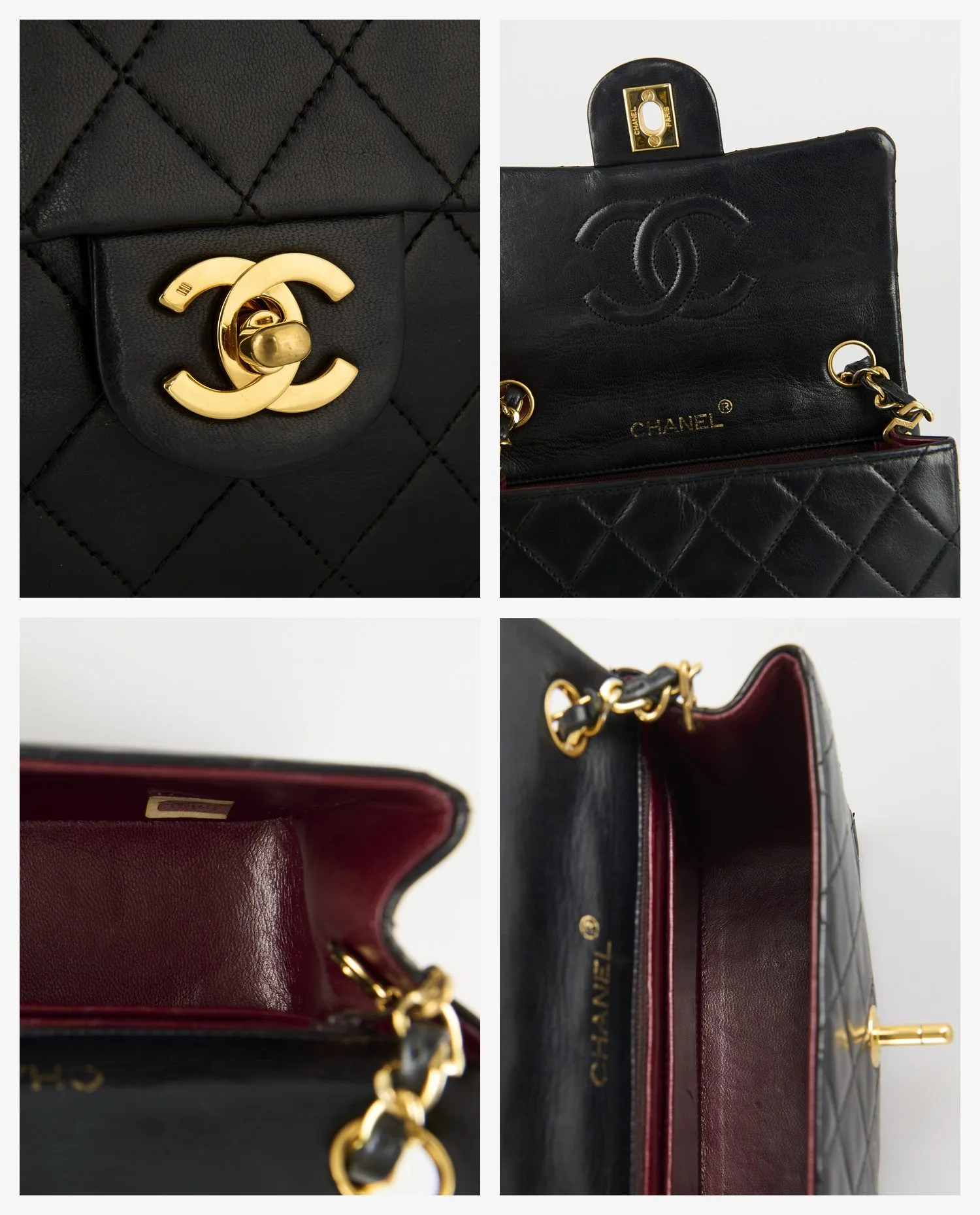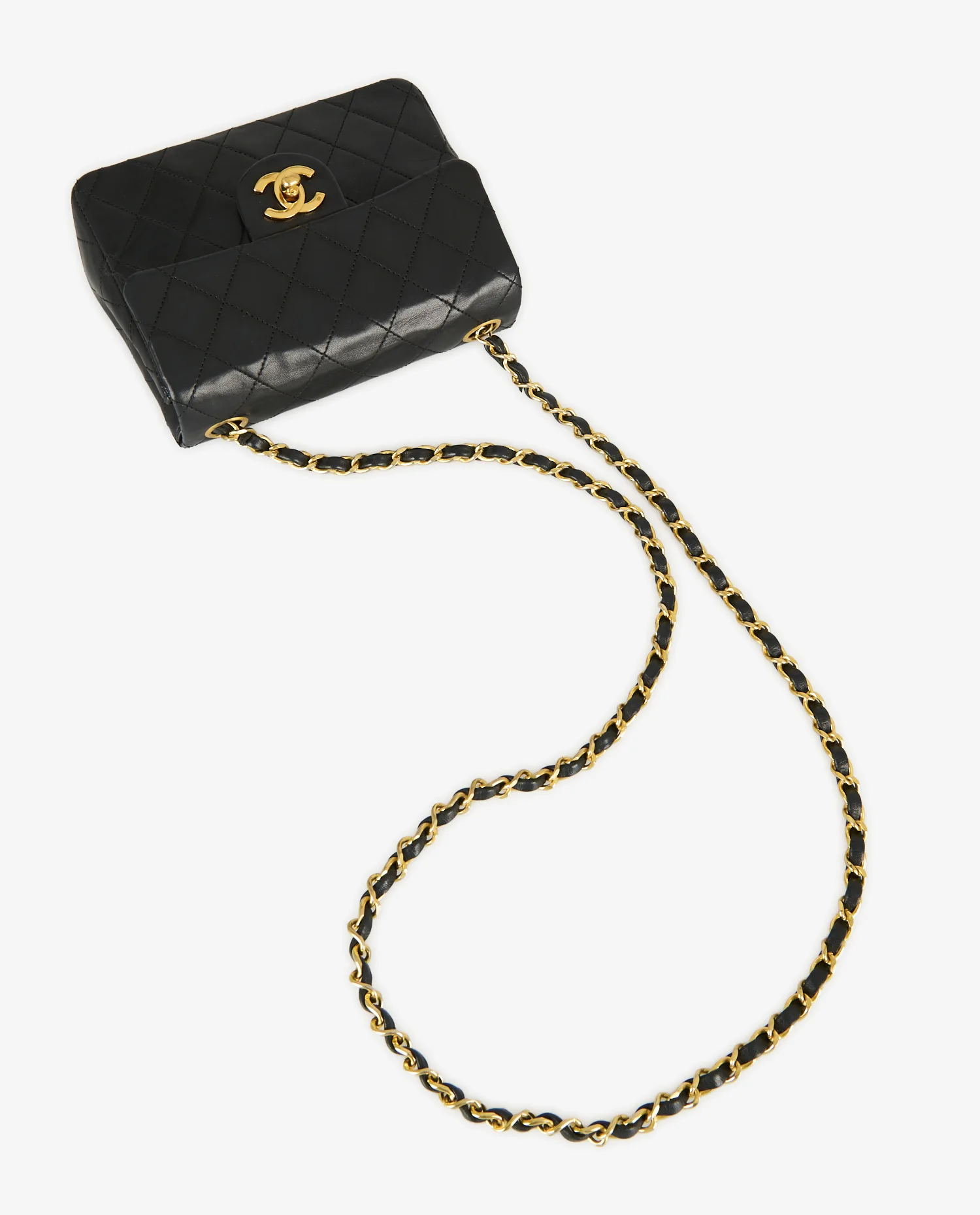 Le cuir d’agneau noir est travaillé avec une finition douce et lisse, rehaussée du matelassage en losanges caractéristique. Le rabat se ferme à l’aide d’un fermoir tournant doré à double C, plaqué or 24 carats. La bandoulière est composée d’une chaîne dorée entrelacée de cuir, signature emblématique de la marque. Une poche plaquée au dos permet de glisser un petit objet à portée de main. Le format mini (environ 17,5 x 13 x 6 cm) offre une silhouette structurée mais délicate.