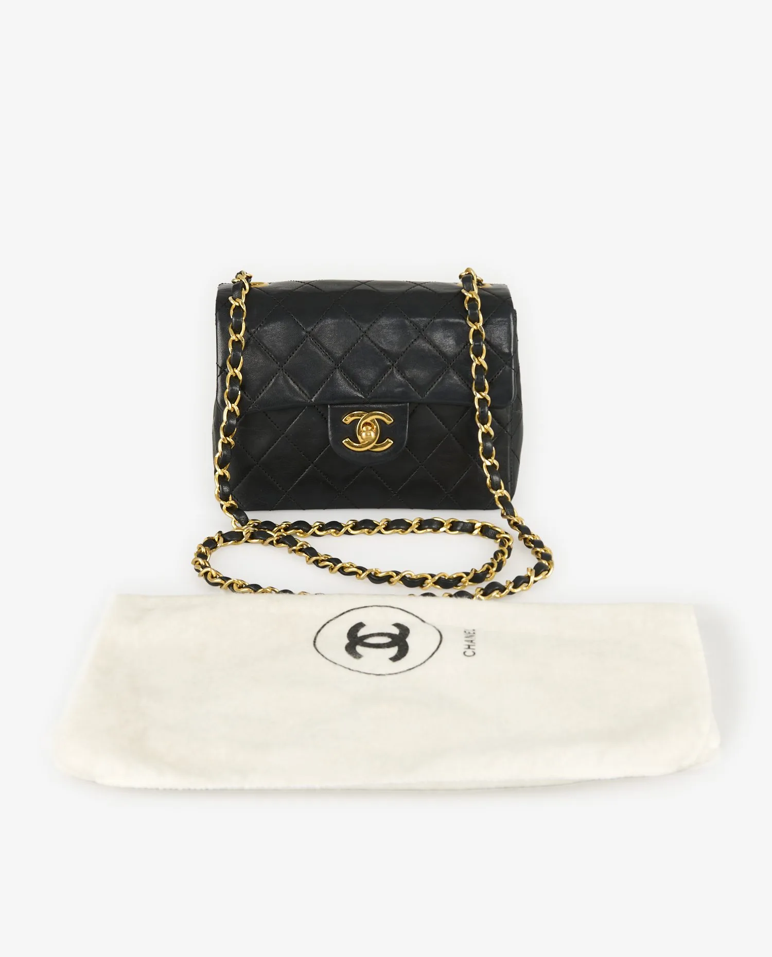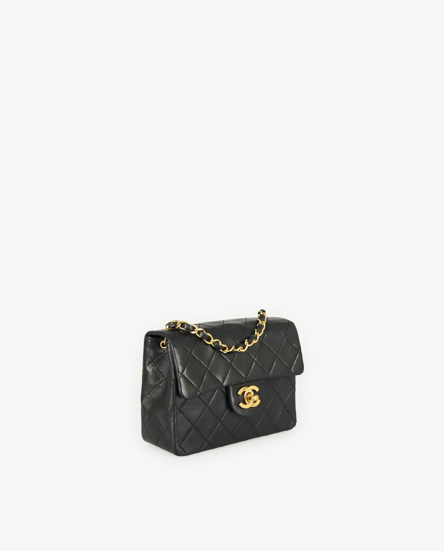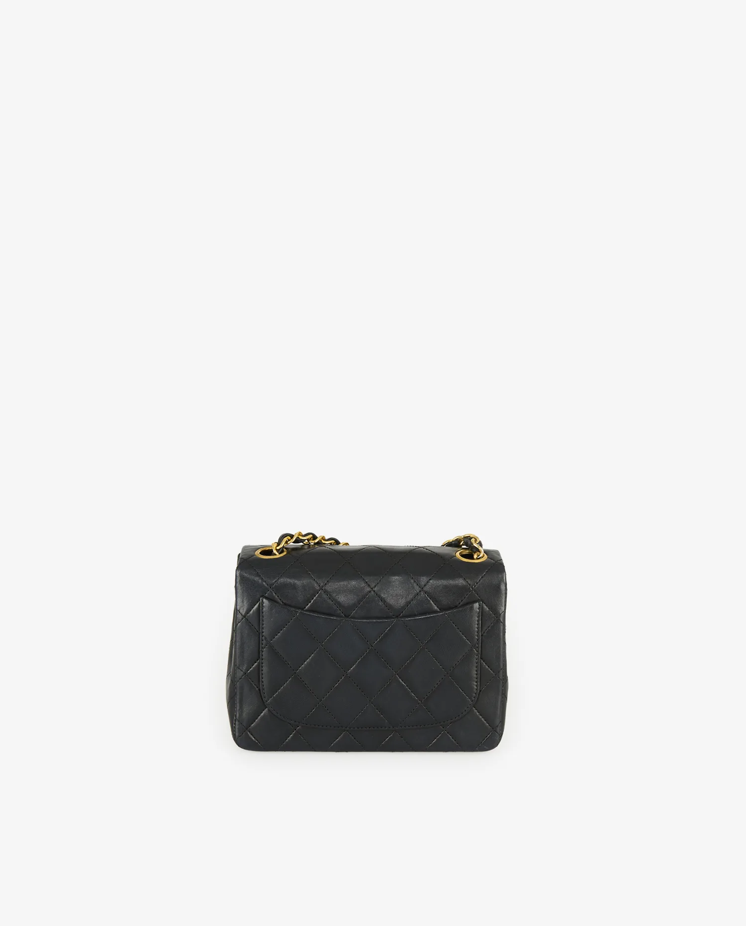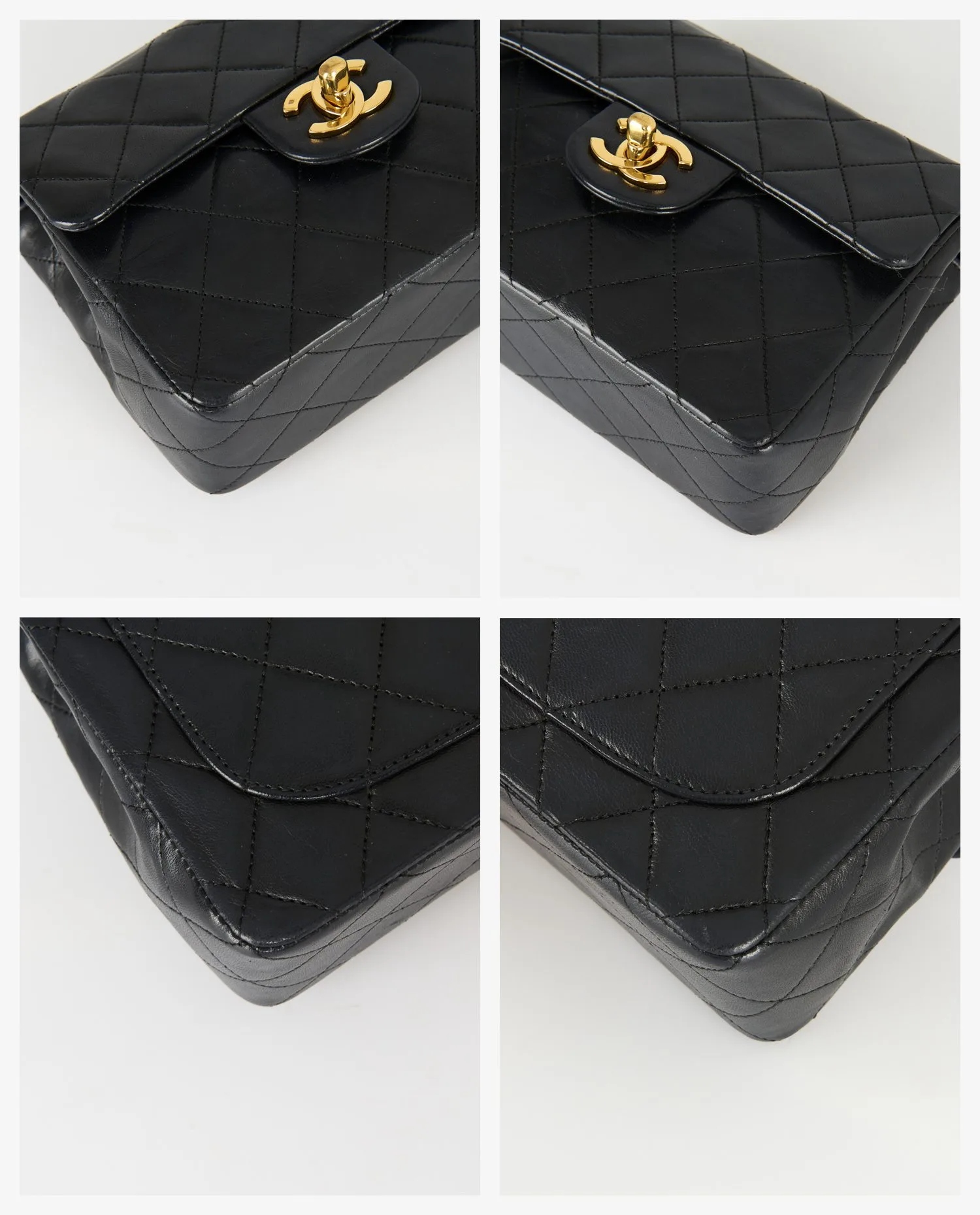 Le cuir d’agneau noir est travaillé avec une finition douce et lisse, rehaussée du matelassage en losanges caractéristique. Le rabat se ferme à l’aide d’un fermoir tournant doré à double C, plaqué or 24 carats. La bandoulière est composée d’une chaîne dorée entrelacée de cuir, signature emblématique de la marque. Une poche plaquée au dos permet de glisser un petit objet à portée de main. Le format mini (environ 17,5 x 13 x 6 cm) offre une silhouette structurée mais délicate.