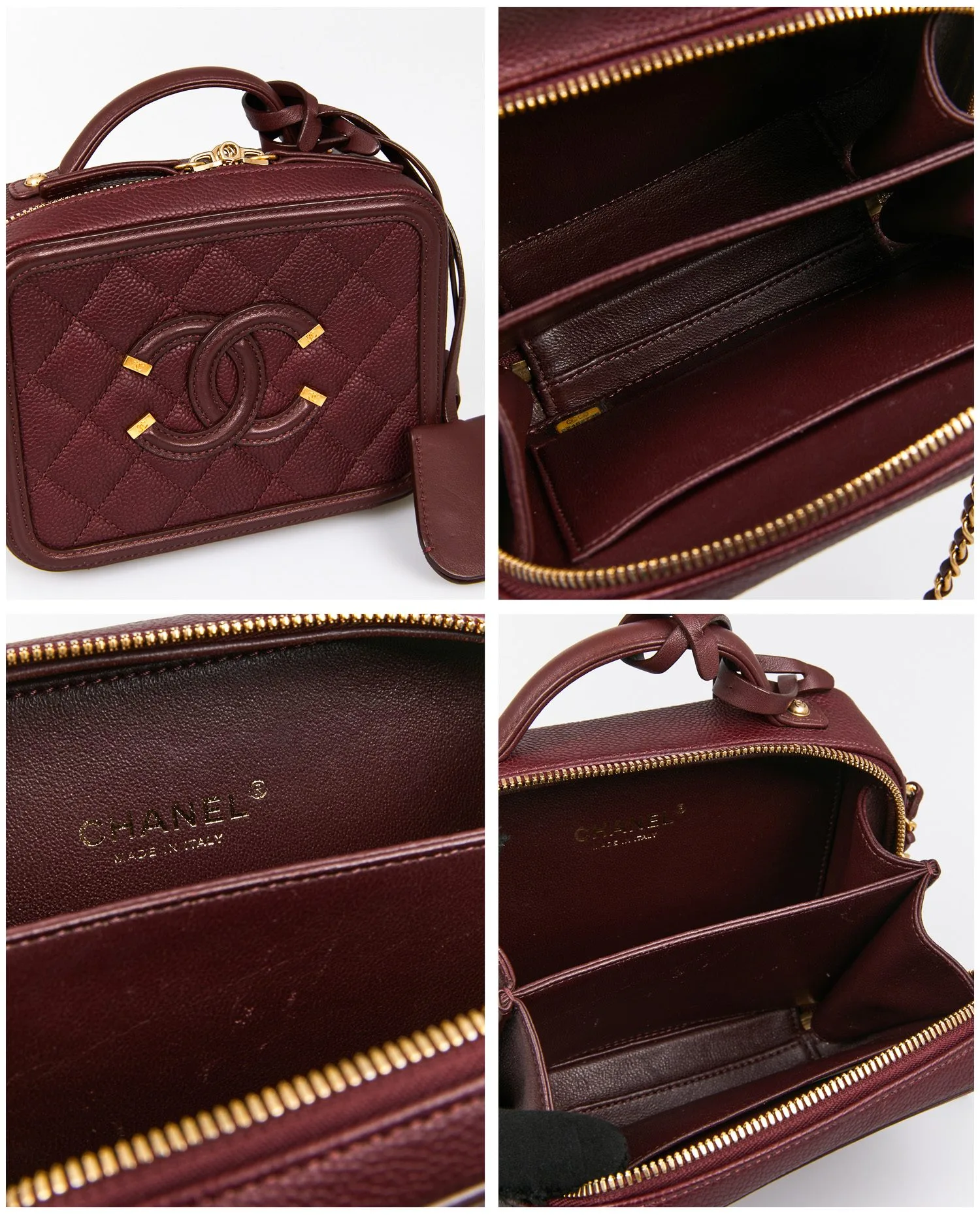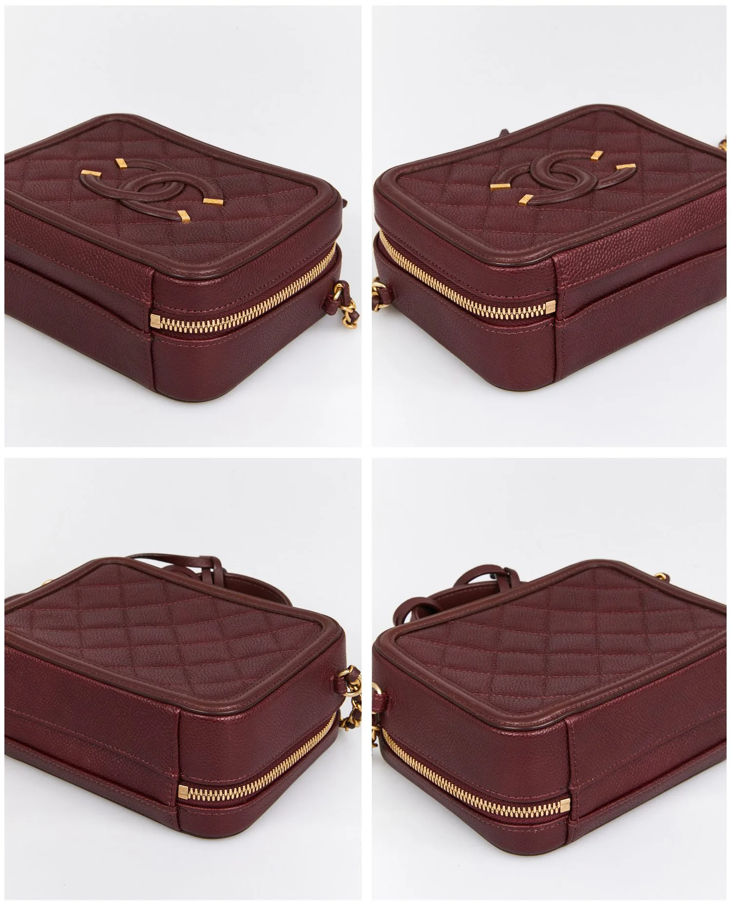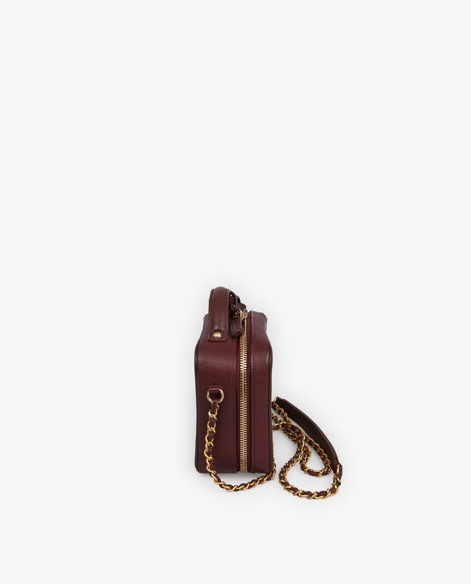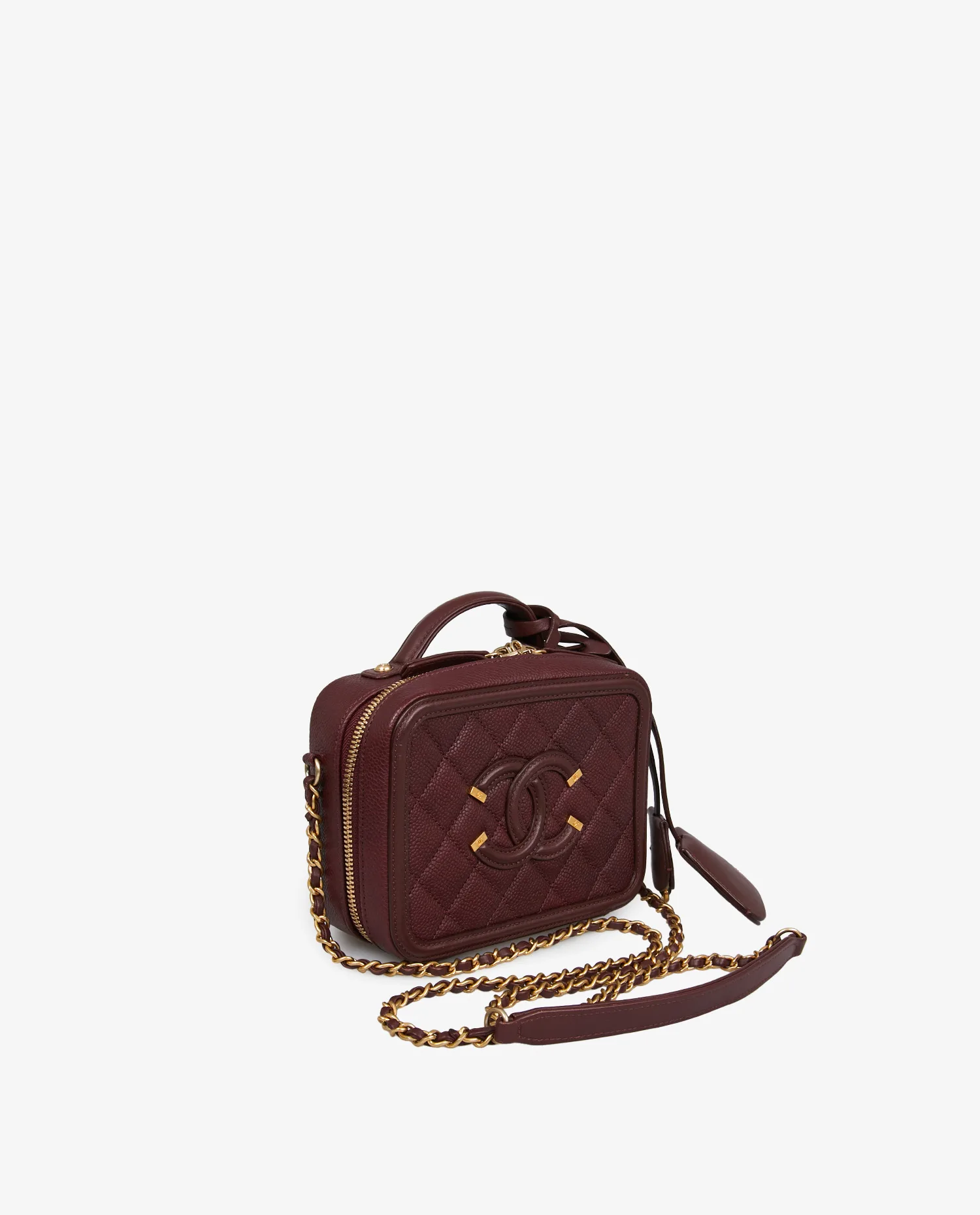 Le cuir caviar bordeaux présente un grain prononcé et une excellente tenue, orné du matelassage losangé typique de Chanel. Le logo CC surpiqué sur le devant apporte une touche iconique. La fermeture zippée en métal doré entoure le haut du vanity, assurant un accès pratique au contenu. La bandoulière en chaîne entrelacée de cuir permet un porté épaule ou croisé. La poignée supérieure offre une option de porté main élégante. Les finitions métalliques arborent un ton doré légèrement vieilli, signature des lignes vintage de la maison.