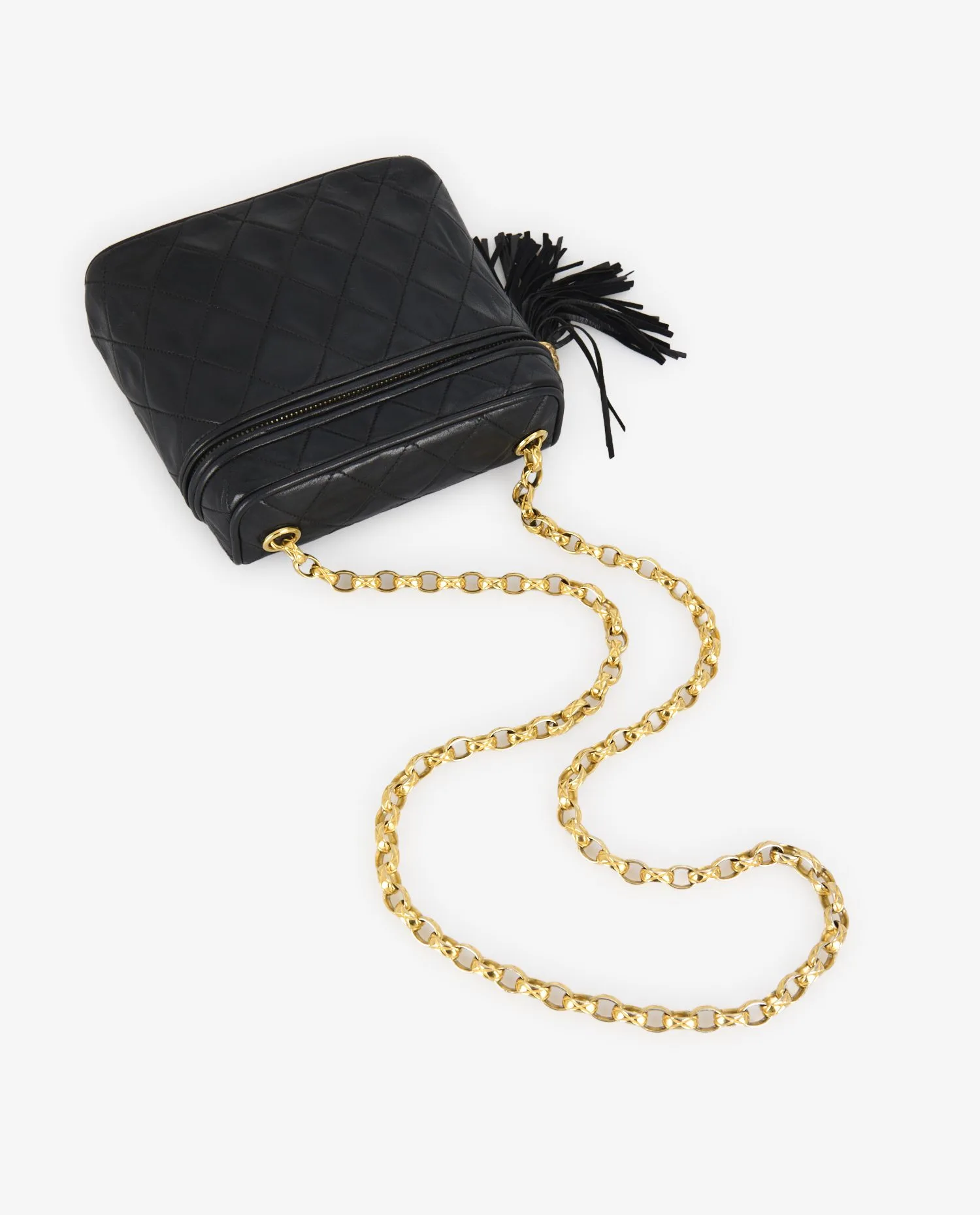 Le sac est en très bon état pour son âge. Les coins montrent une légère patine d’usage, sans usure marquée. Le cuir conserve sa brillance et sa souplesse. La chaîne dorée est en excellent état, sans oxydation ni perte notable de dorure. La fermeture zippée fonctionne parfaitement et le pompon est complet, sans effilochage. L’intérieur est propre, sans tache ni déchirure.