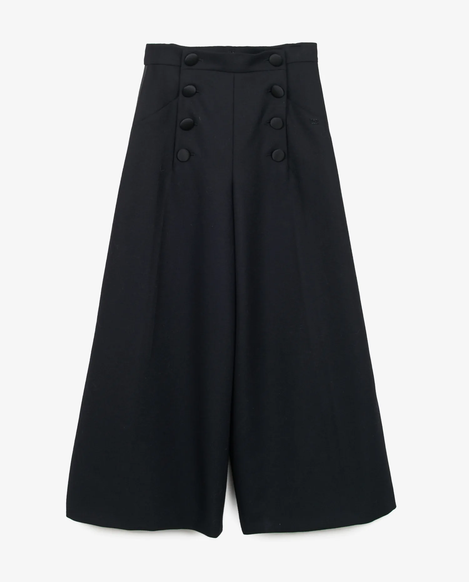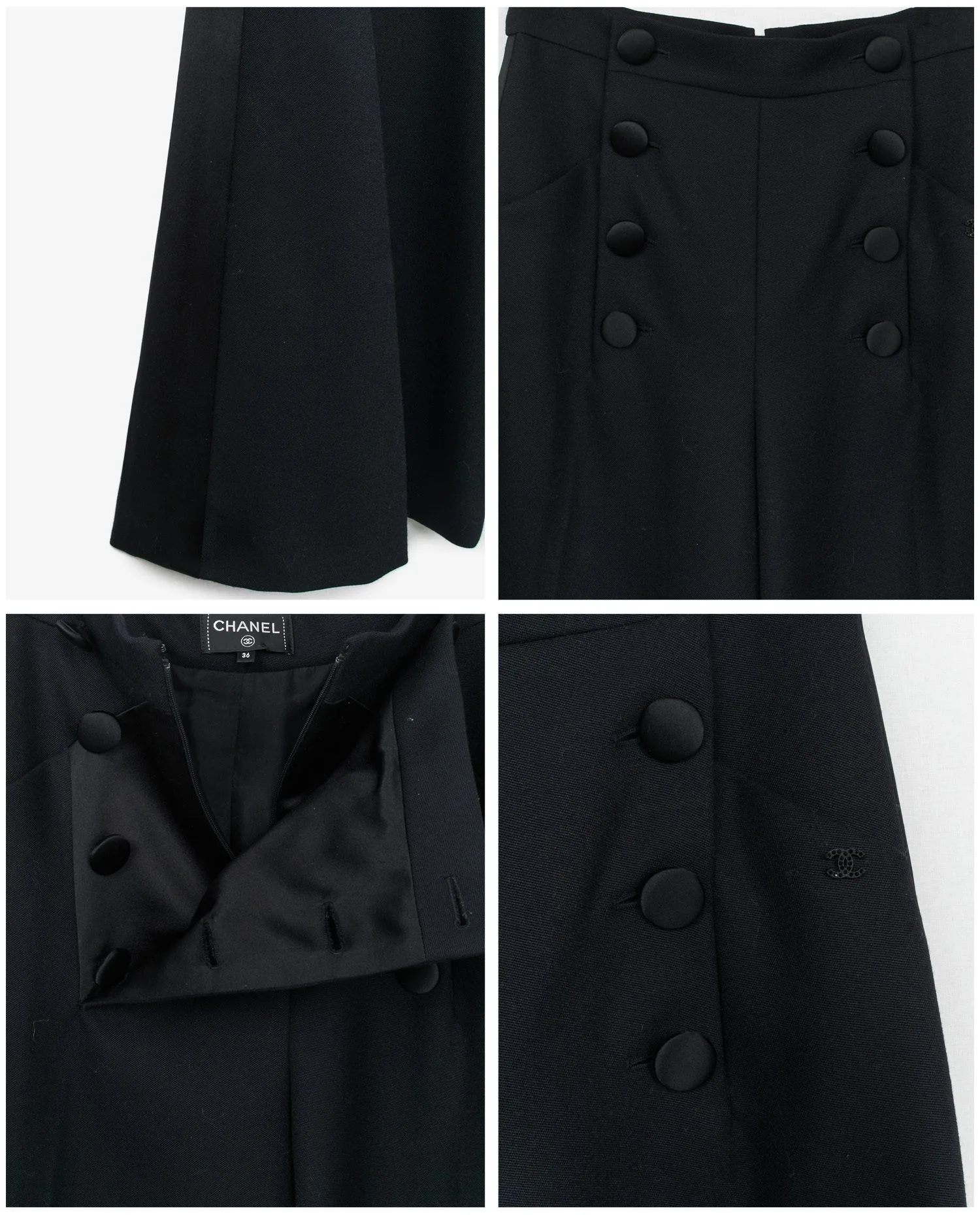 Pantalon de smoking Chanel en laine noire et bandes en satin. Taille 36. Doublure en soie. Taille haute. Coupe droite. En très bon état.