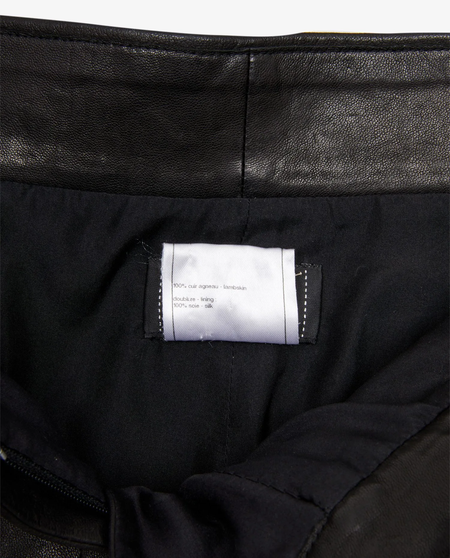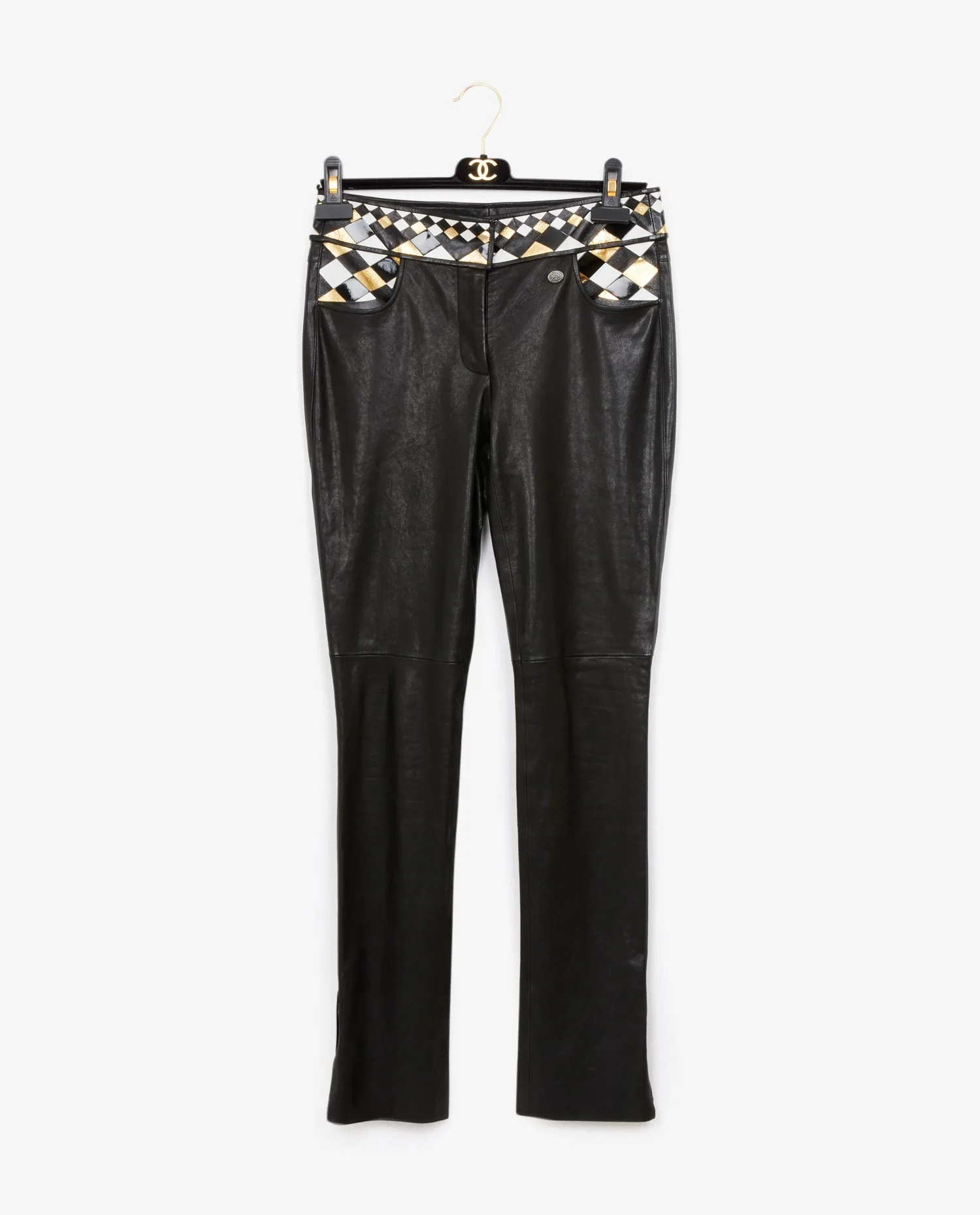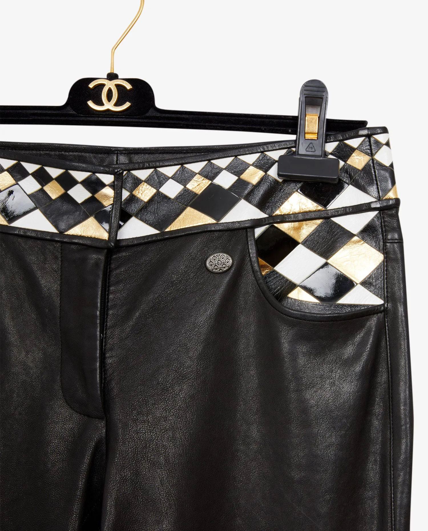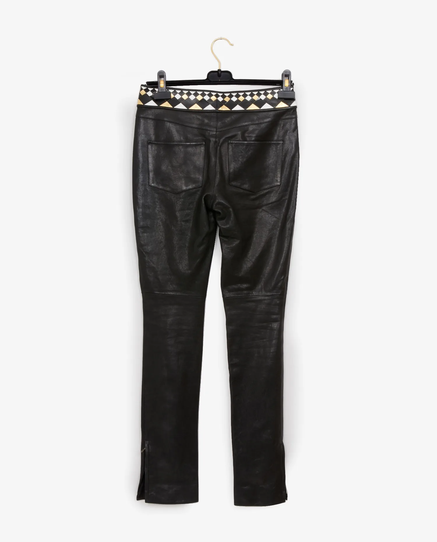 Le cuir noir présente une surface lisse avec une légère brillance naturelle, soulignant la qualité de la matière. La coupe est droite avec une légère ouverture au bas des jambes, offrant une silhouette équilibrée. L’élément central réside dans la ceinture décorative composée d’un assemblage de motifs losangés en noir, blanc et doré, créant un effet visuel structuré. Deux poches à l’avant sont intégrées sous cet empiècement, accompagnées d’un bouton métallique discret. Les coutures sont nettes et renforcent la construction globale.