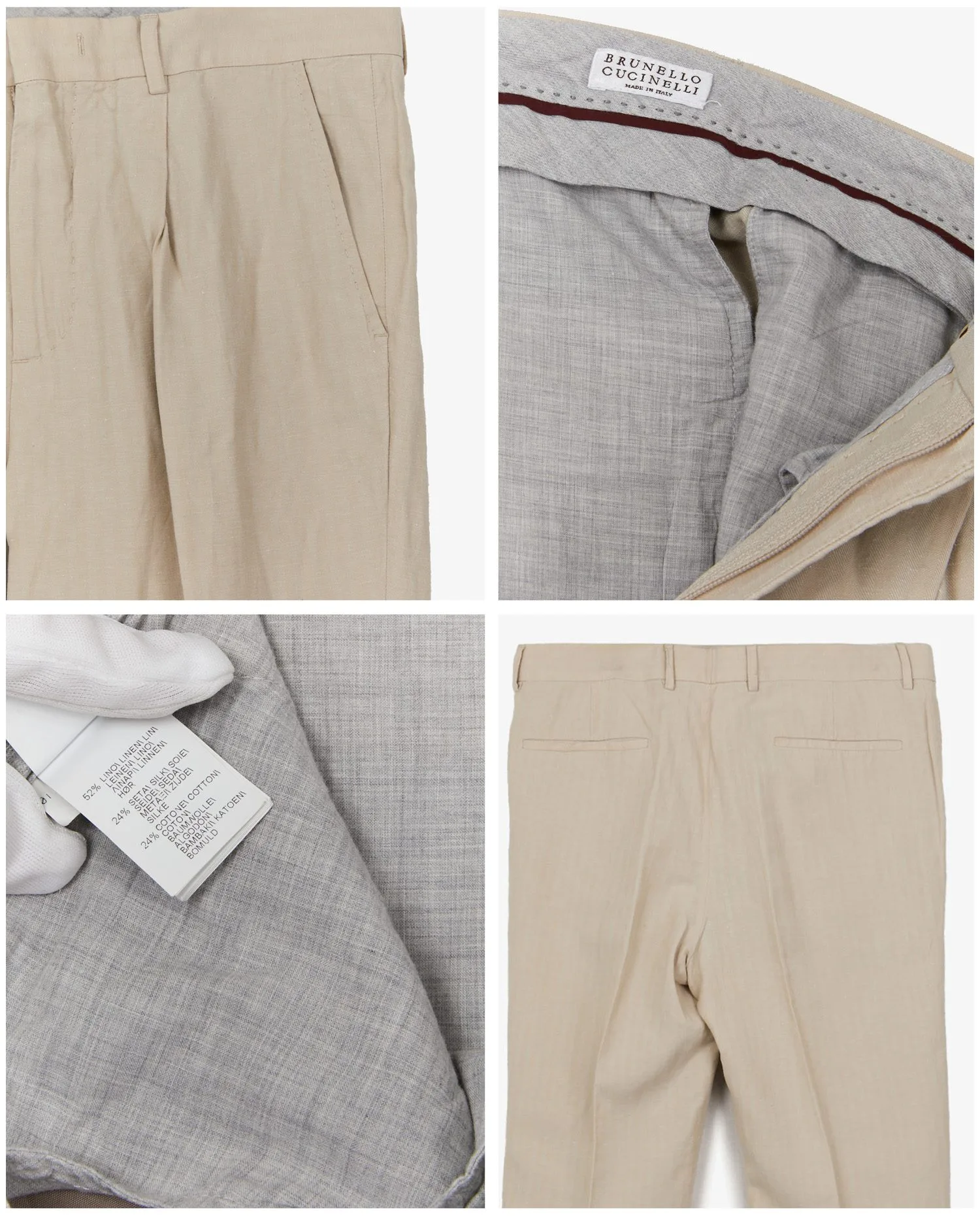 Pantalon en lin beige Brunello Cucinelli. Surpiqûres au niveau des poches. Coupe droite. Taille 50. En très bon état.