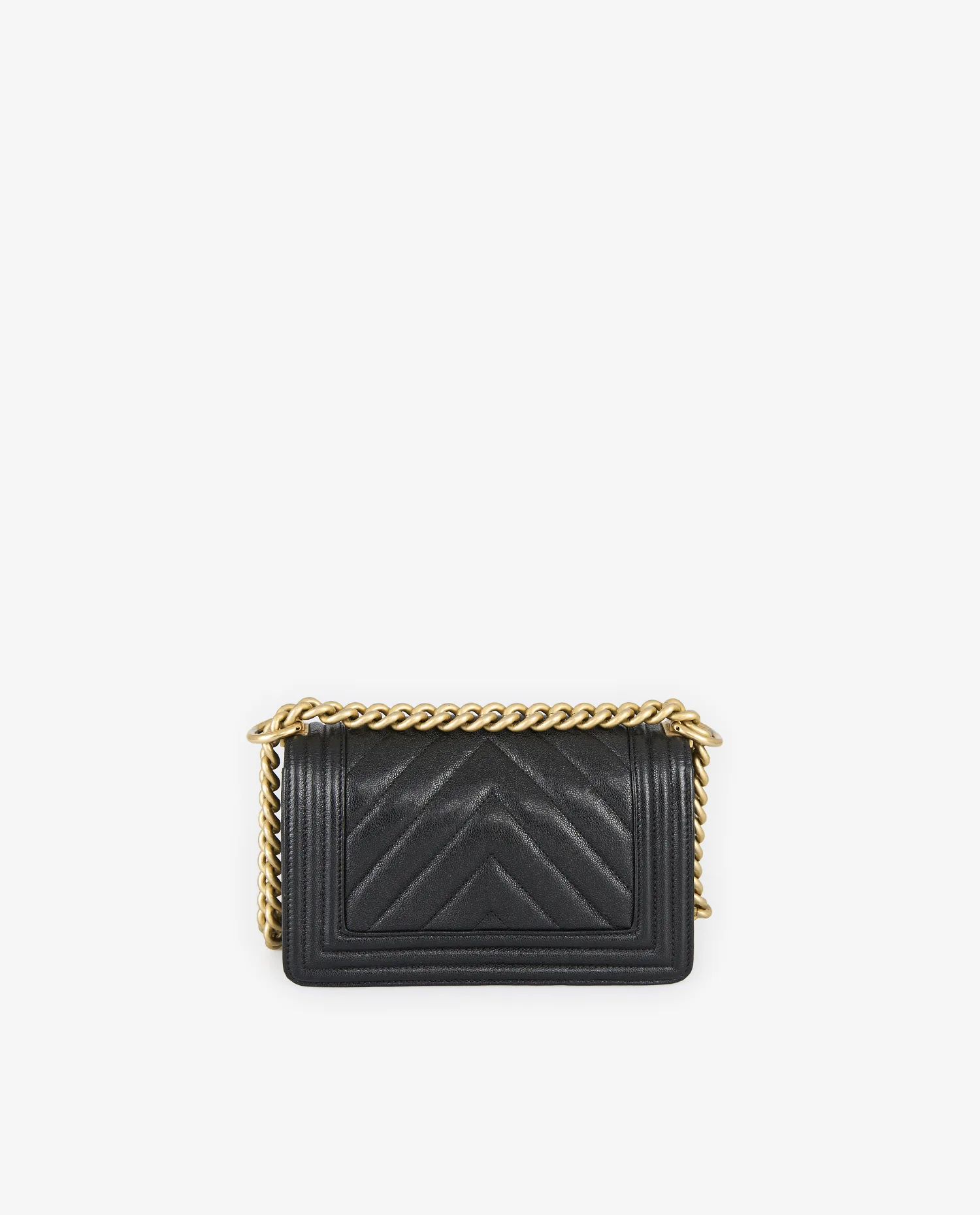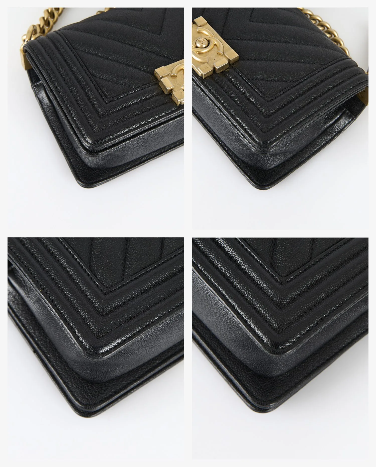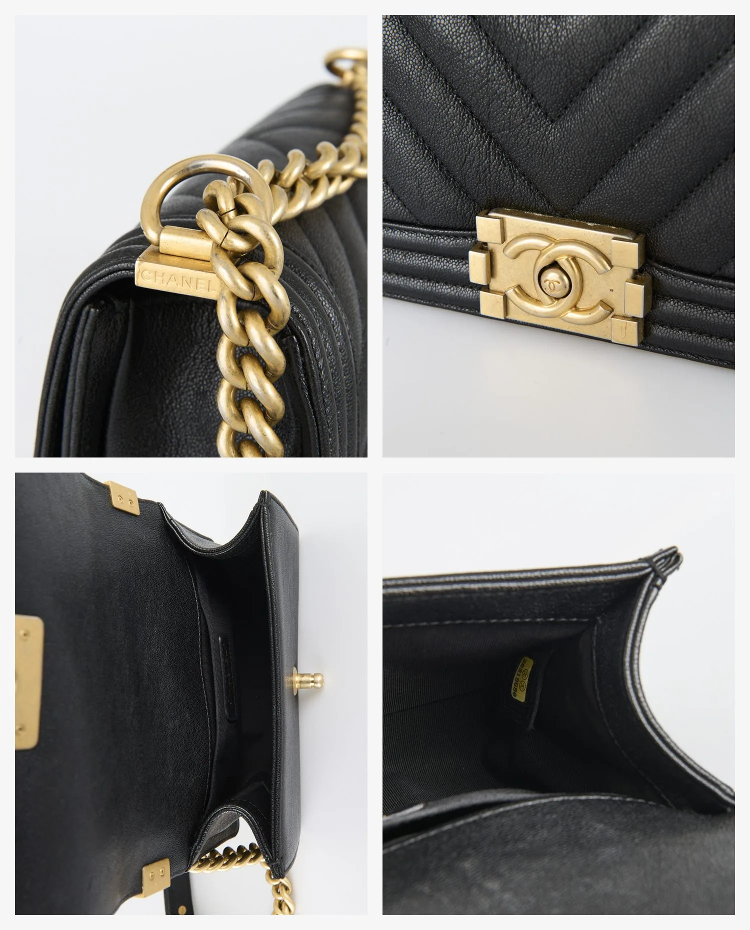 Le cuir caviar noir se distingue par son grain marqué et sa surface résistante aux rayures, idéale pour une utilisation régulière. Le matelassage en chevrons apporte un relief visuel structurant. Le fermoir Boy doré mat à l’avant reprend les codes industriels qui définissent cette ligne. La chaîne en métal doré est épaulée par une patte de cuir ajustable, apportant confort et maintien. Ses dimensions compactes (environ 20 x 12 x 7 cm) en font un modèle pratique au quotidien sans encombrement.