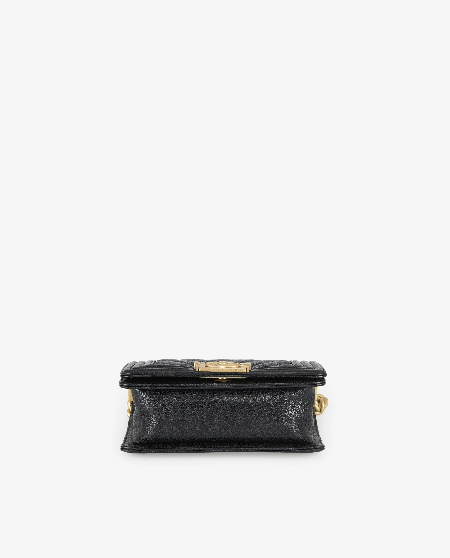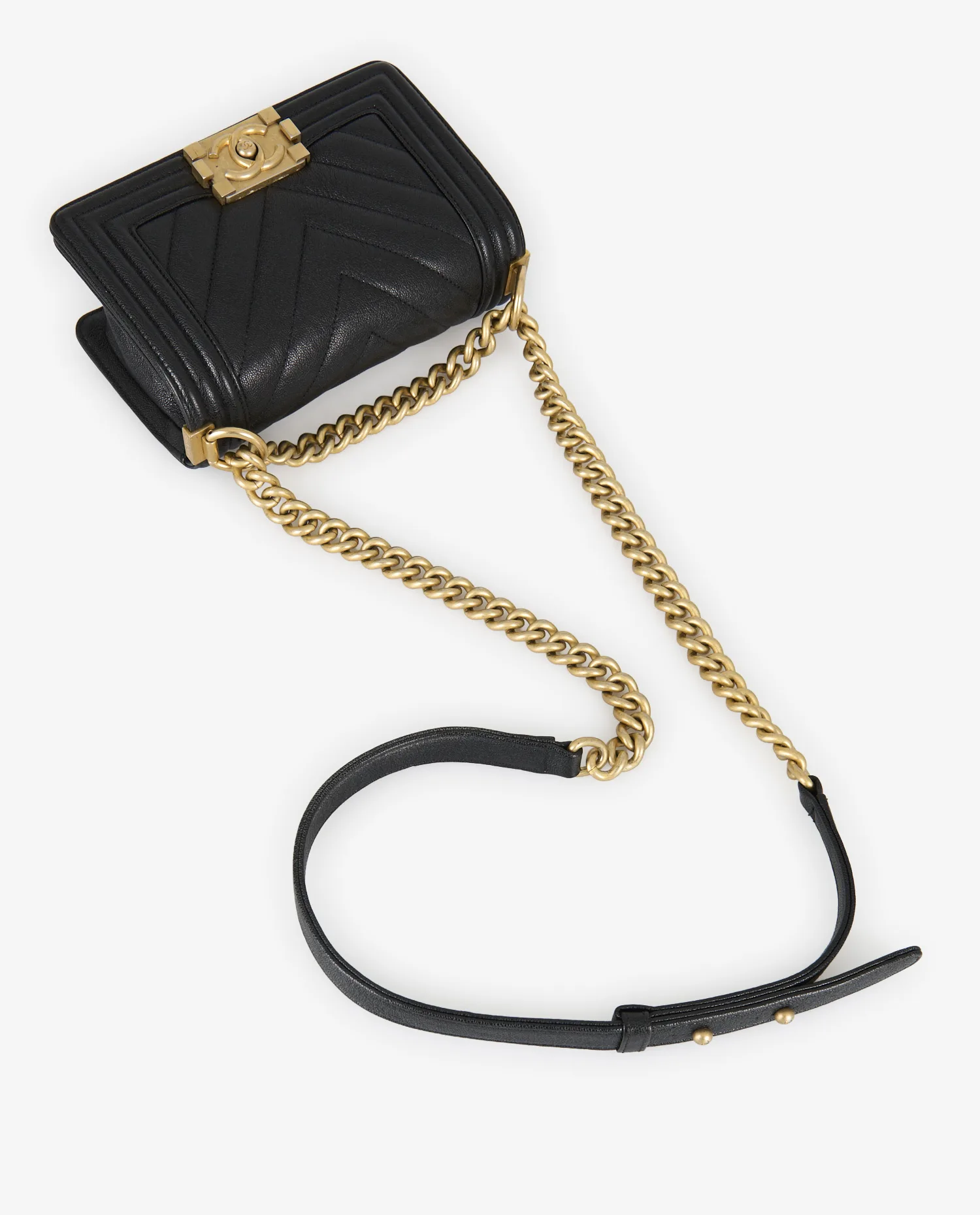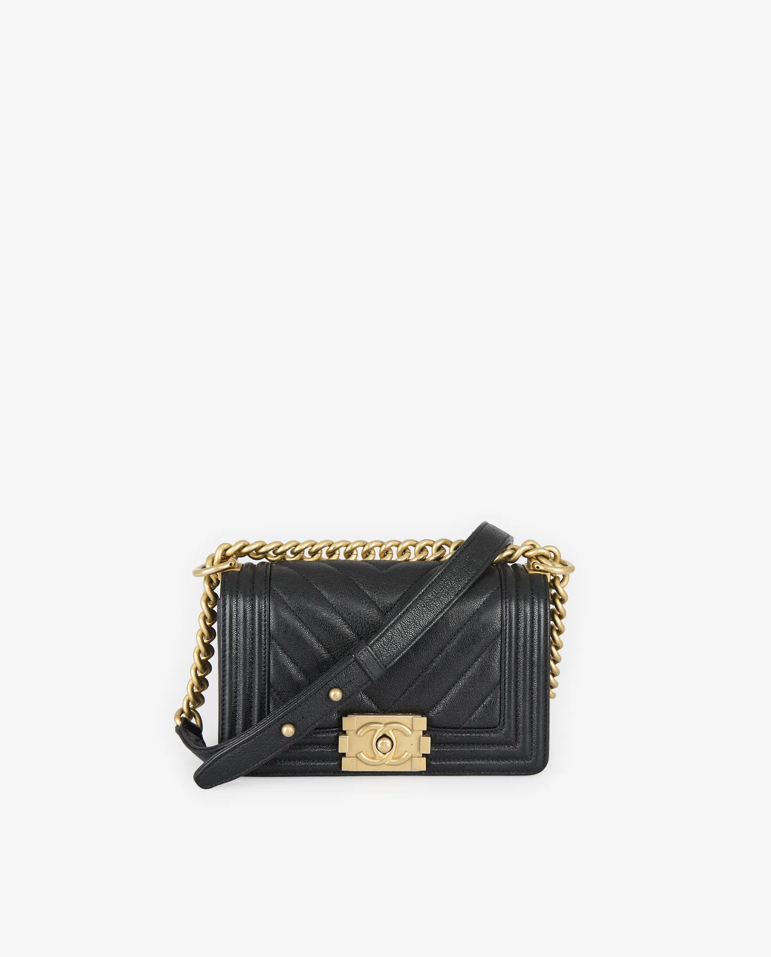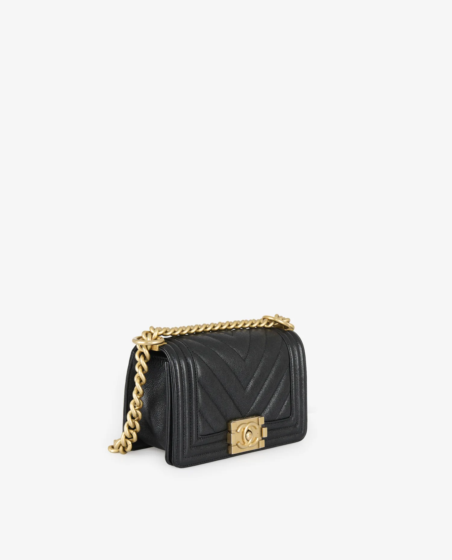 Le cuir caviar noir se distingue par son grain marqué et sa surface résistante aux rayures, idéale pour une utilisation régulière. Le matelassage en chevrons apporte un relief visuel structurant. Le fermoir Boy doré mat à l’avant reprend les codes industriels qui définissent cette ligne. La chaîne en métal doré est épaulée par une patte de cuir ajustable, apportant confort et maintien. Ses dimensions compactes (environ 20 x 12 x 7 cm) en font un modèle pratique au quotidien sans encombrement.
