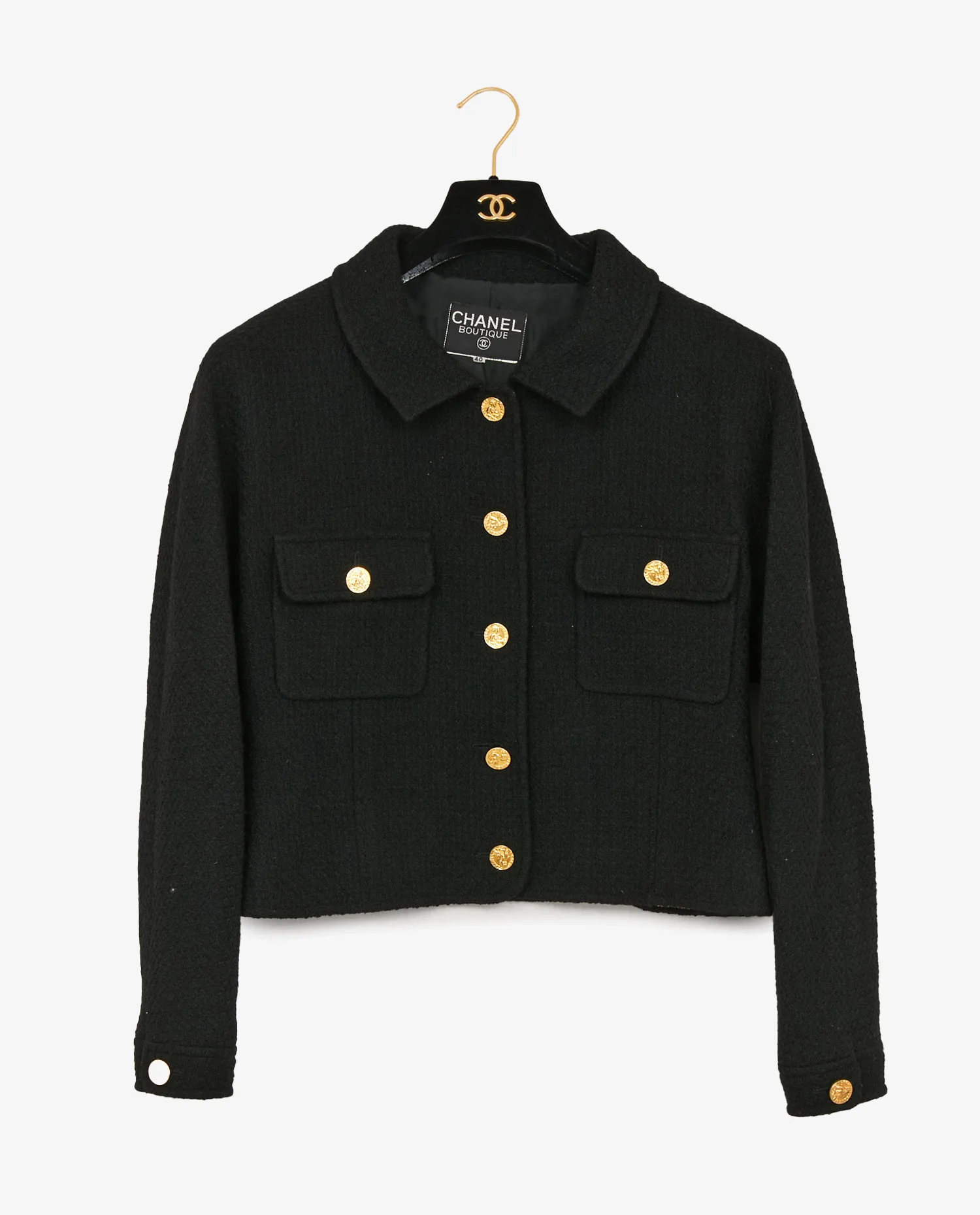 Le tweed noir offre une texture dense et subtilement mate. La veste présente une ligne droite légèrement ajustée, deux poches poitrine plaquées et un col classique. Les cinq boutons dorés, gravés du profil de Coco Chanel et de son nom, attirent le regard tout en restant élégants. Les poignets sont également dotés de boutons assortis.