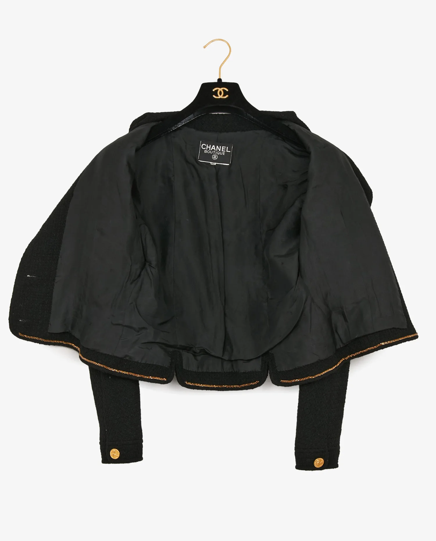La doublure noire en soie est brodée ton sur ton du motif CC répété sur l’ensemble, apportant une touche discrète mais luxueuse. La veste est également équipée d’une chaînette en métal doré cousue à la base intérieure, conçue pour garantir la structure et la verticalité du tombé, élément typique des vestes Chanel.