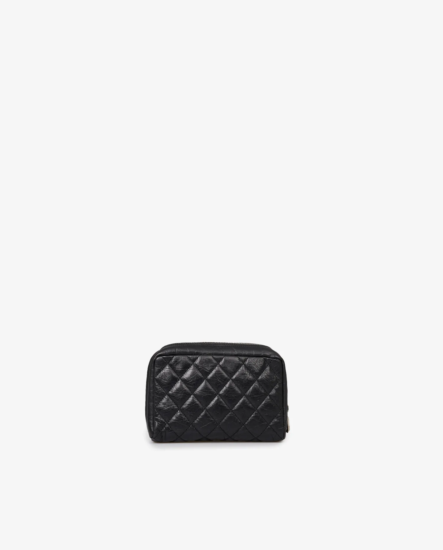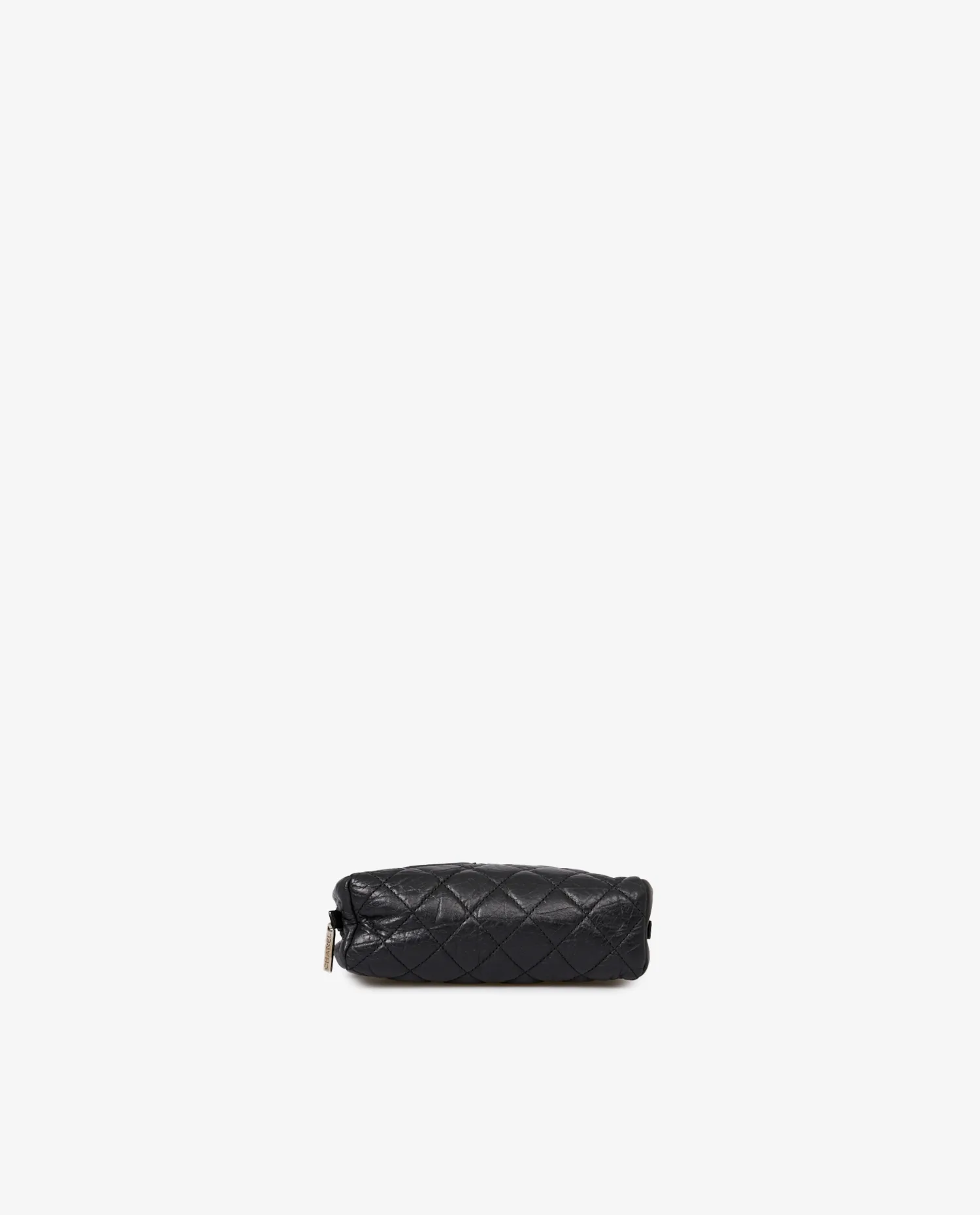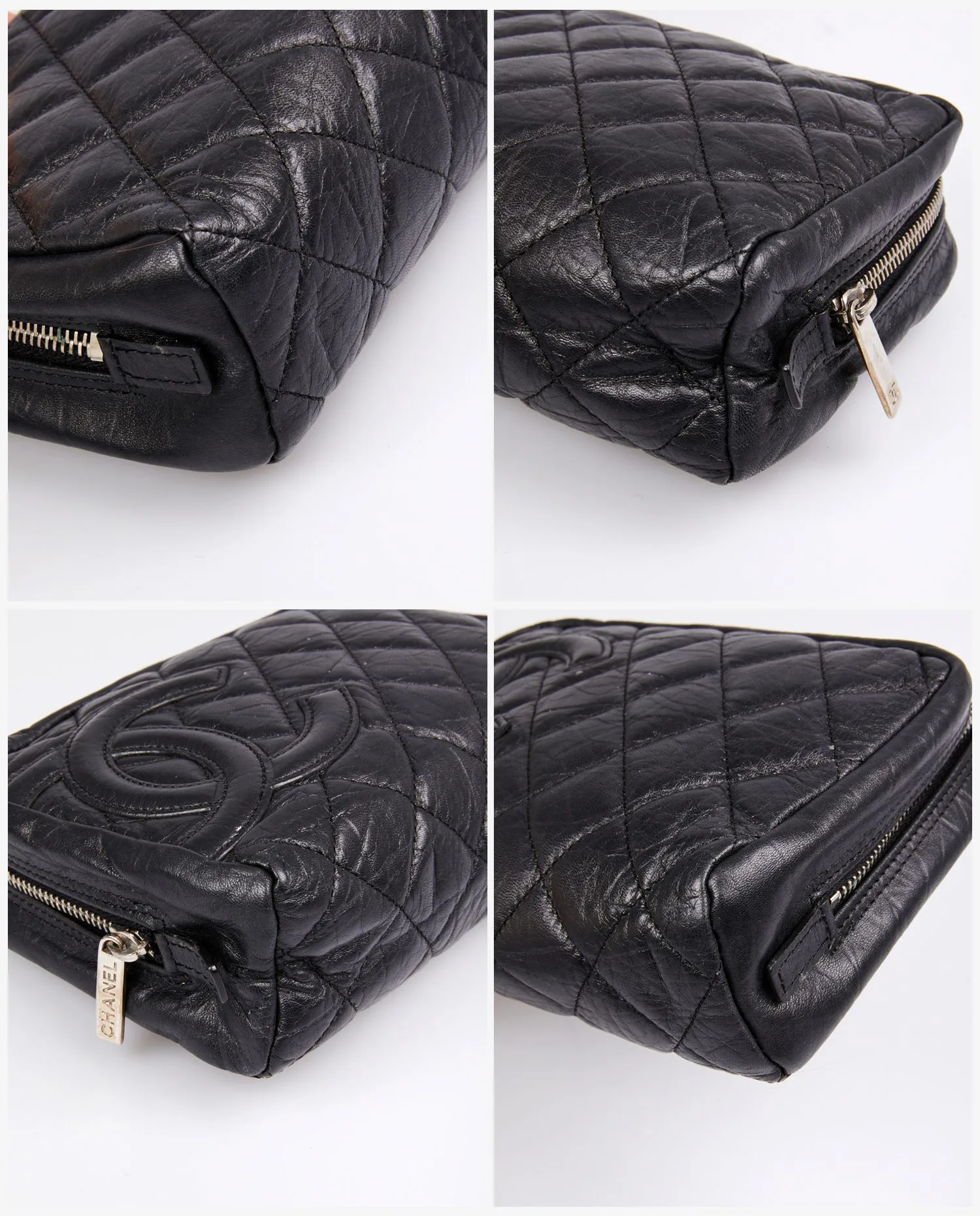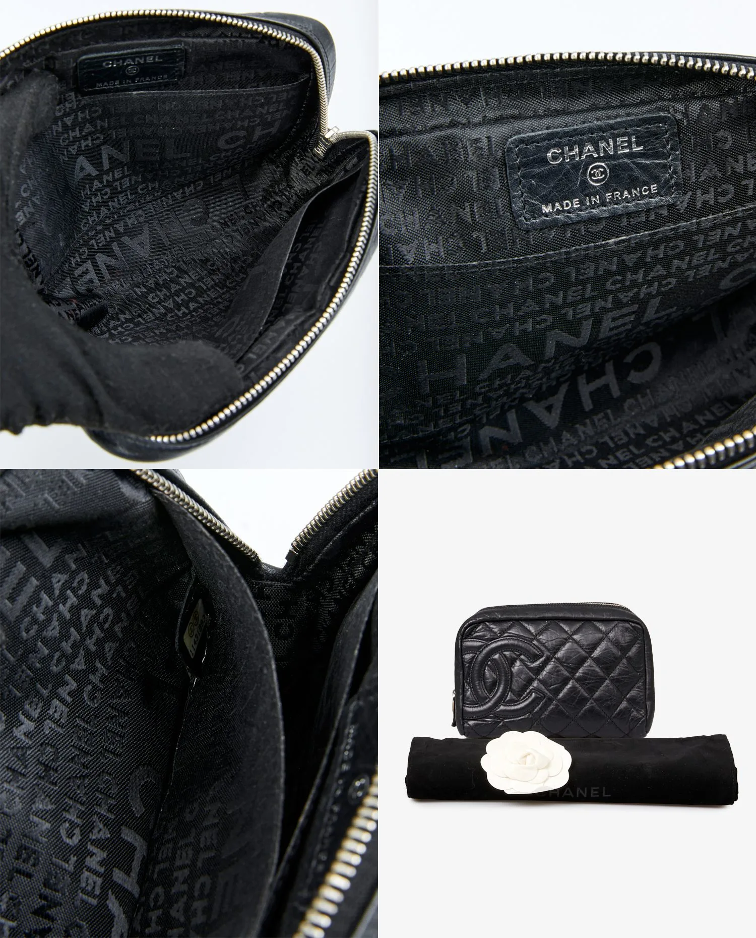 Pochette Chanel en cuir d’agneau matelassé noir. Fermeture zippée. L’intérieur est en tissu noir. En très bon état.