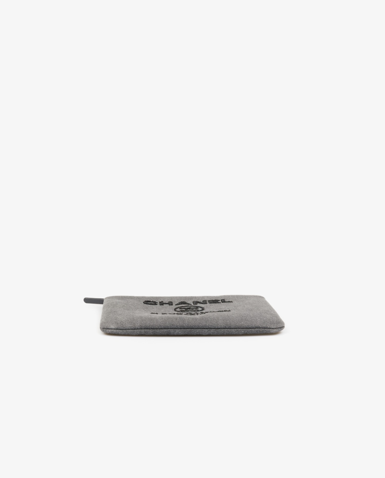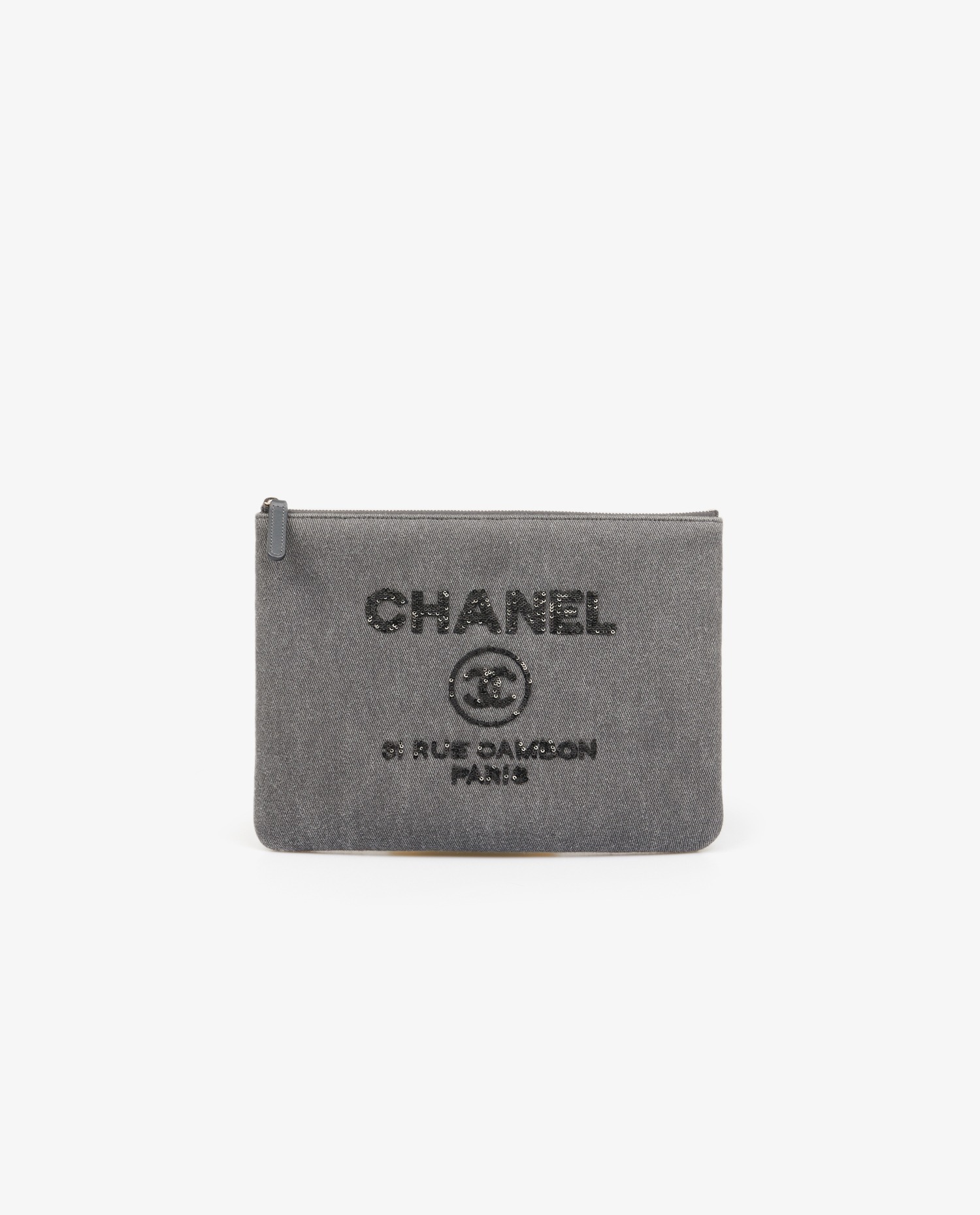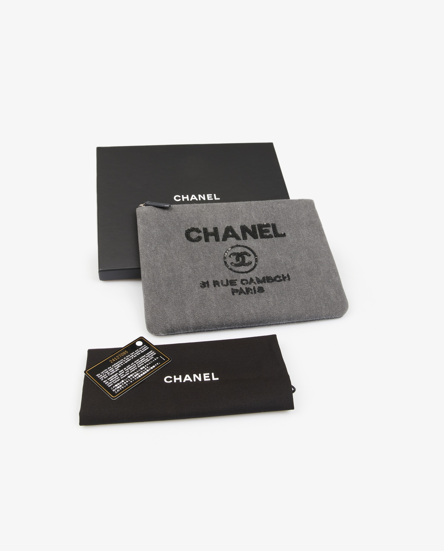 Pochette Chanel “31 Rue Cambon” en denim gris. Inscription à l’avant en sequins brodés. Fermeture zippée. L’intérieur est matelassé imperméabilisé. Jamais porté. Livré dans sa boite et dustbag d’origine.