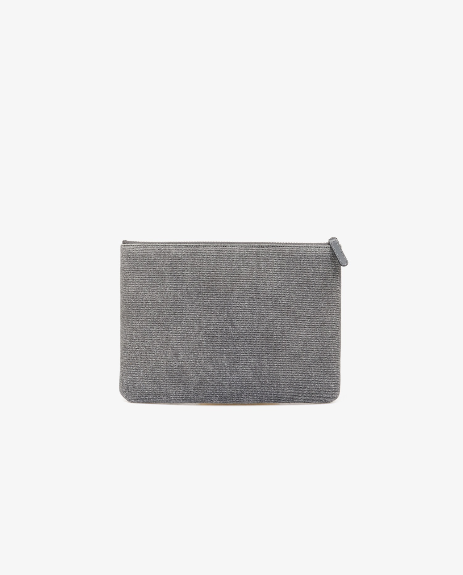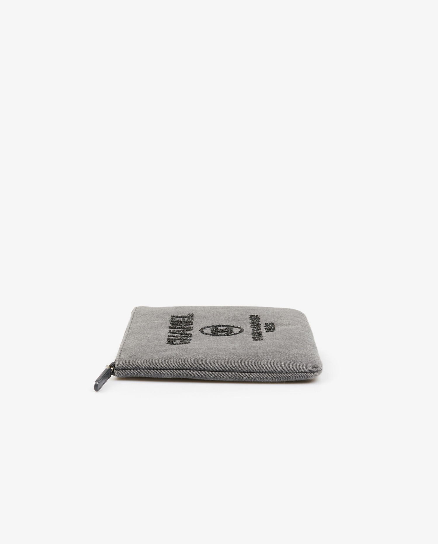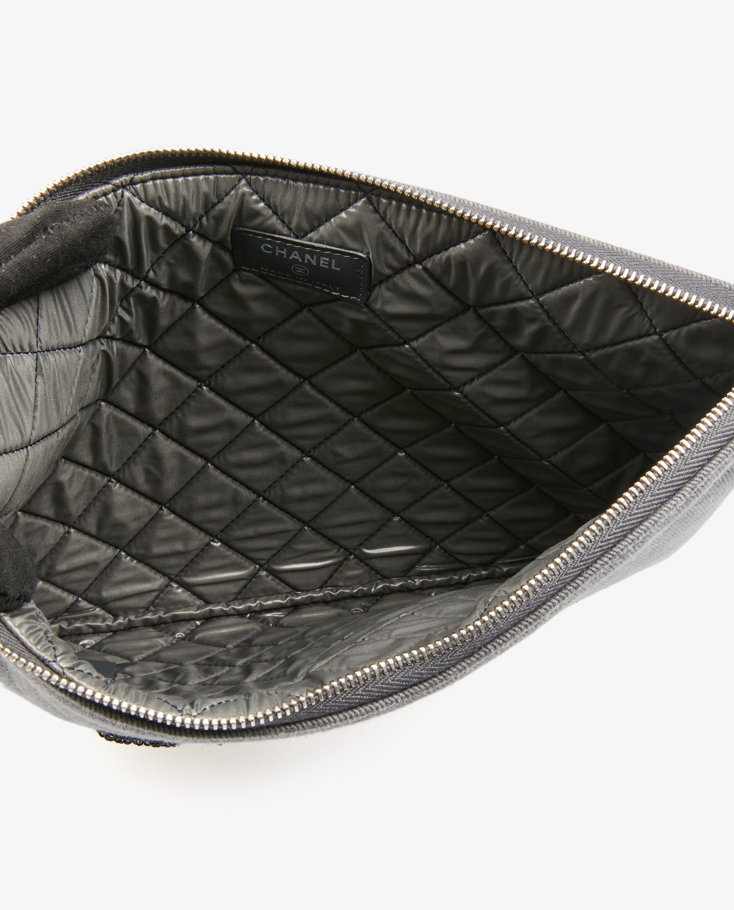 Pochette Chanel “31 Rue Cambon” en denim gris. Inscription à l’avant en sequins brodés. Fermeture zippée. L’intérieur est matelassé imperméabilisé. Jamais porté. Livré dans sa boite et dustbag d’origine.