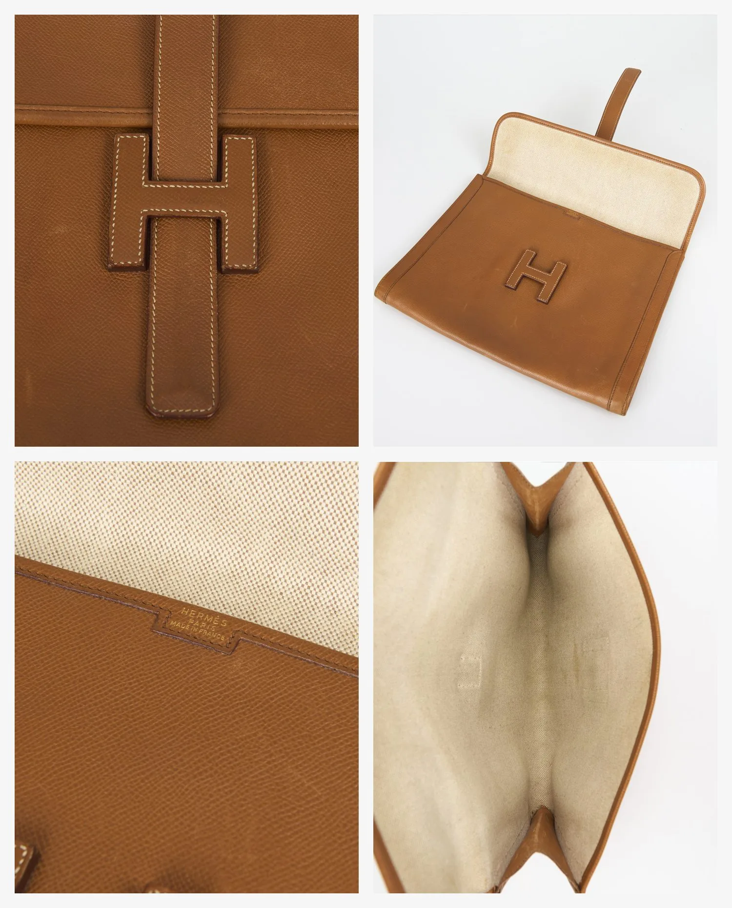 L’intérieur est doublé d’une toile beige claire, propre et bien conservée, avec une couture soignée et un renfort en cuir embossé du même “H” que l’extérieur. Aucun compartiment interne n’est présent, ce qui correspond à la conception originale de la pochette Jige, pensée pour contenir uniquement l’essentiel de manière élégante.
