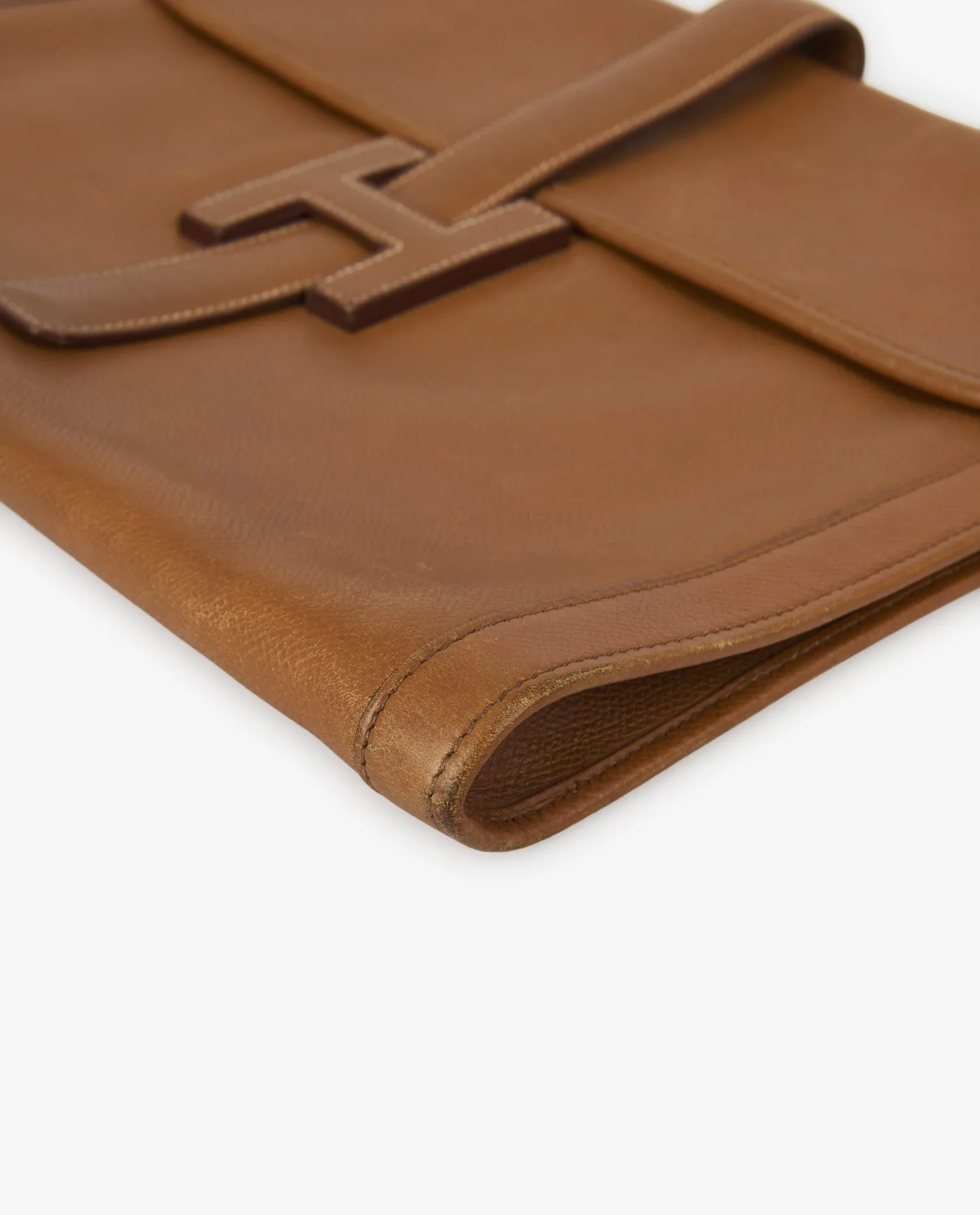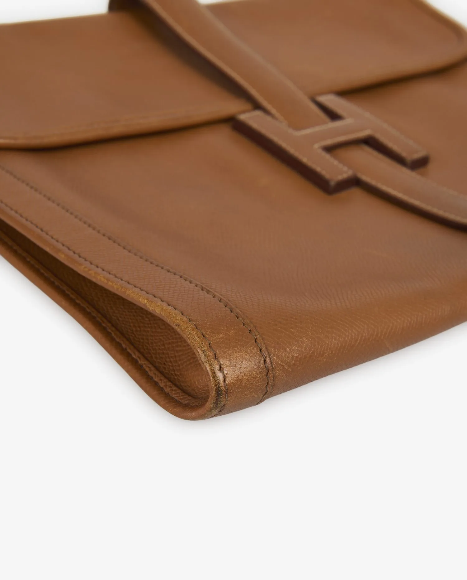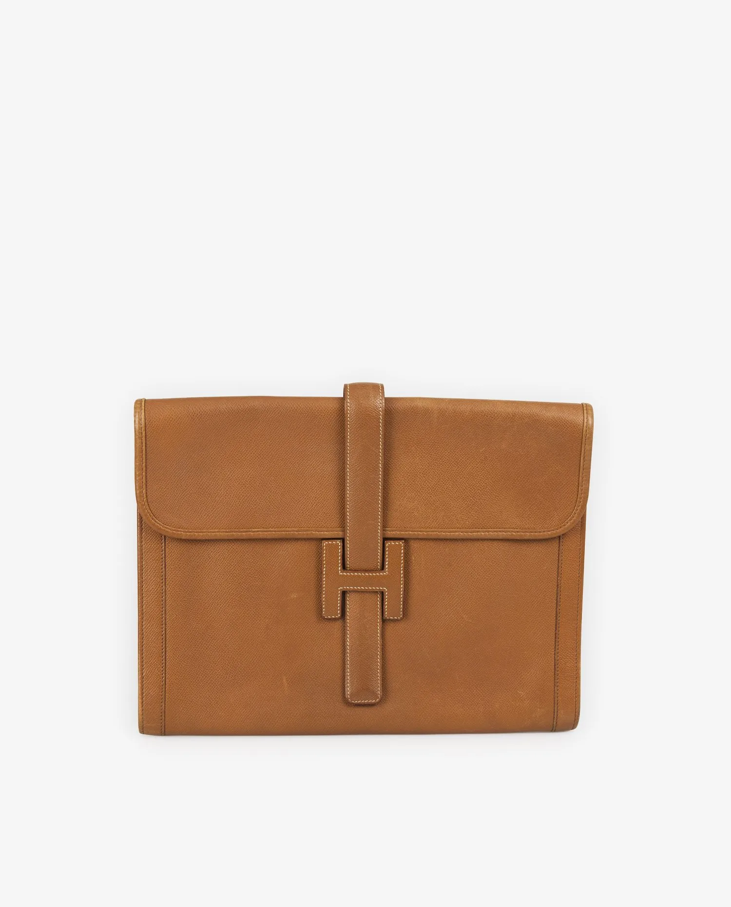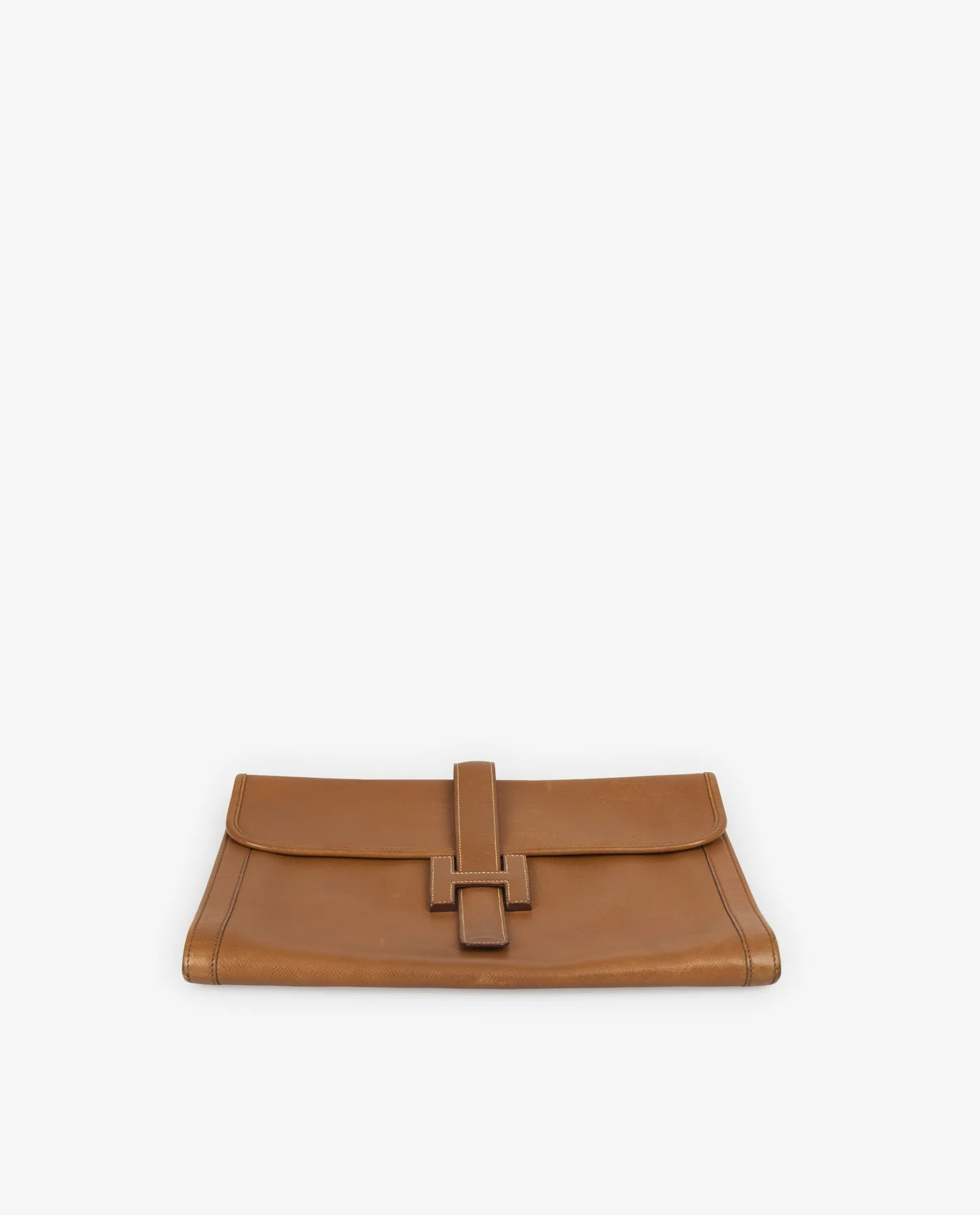 Le cuir Courchevel, reconnaissable à son grain finement imprimé et sa surface légèrement brillante, est ici décliné dans la couleur gold, un brun clair aux reflets chauds. Ce cuir est apprécié pour sa durabilité et sa résistance aux rayures. Les surpiqûres blanches contrastées ajoutent une finition nette. La pièce mesure environ 29 cm de largeur pour 20 cm de hauteur. La bride centrale, intégrée dans le “H”, se glisse sous le rabat pour assurer la fermeture, créant un effet graphique structuré.