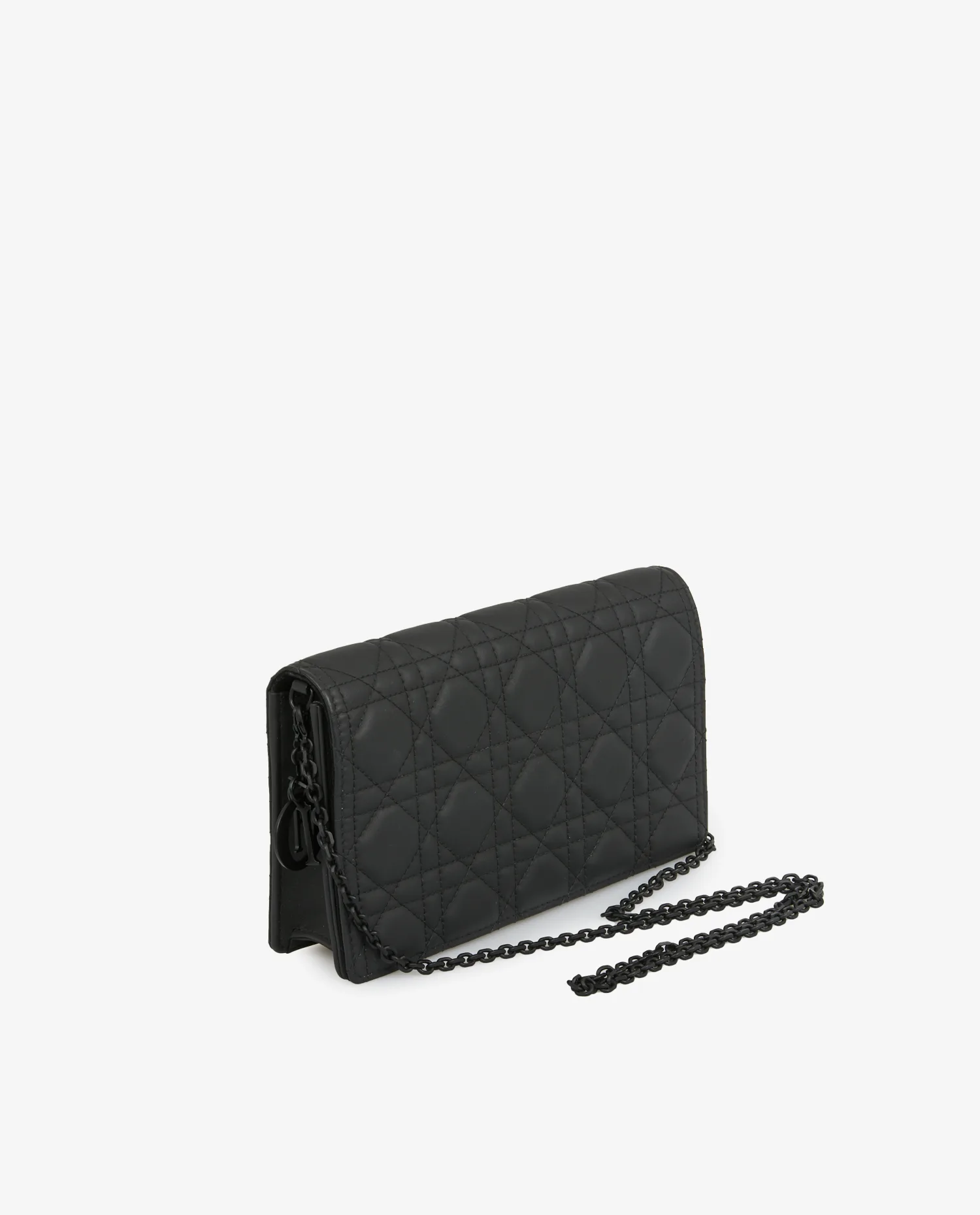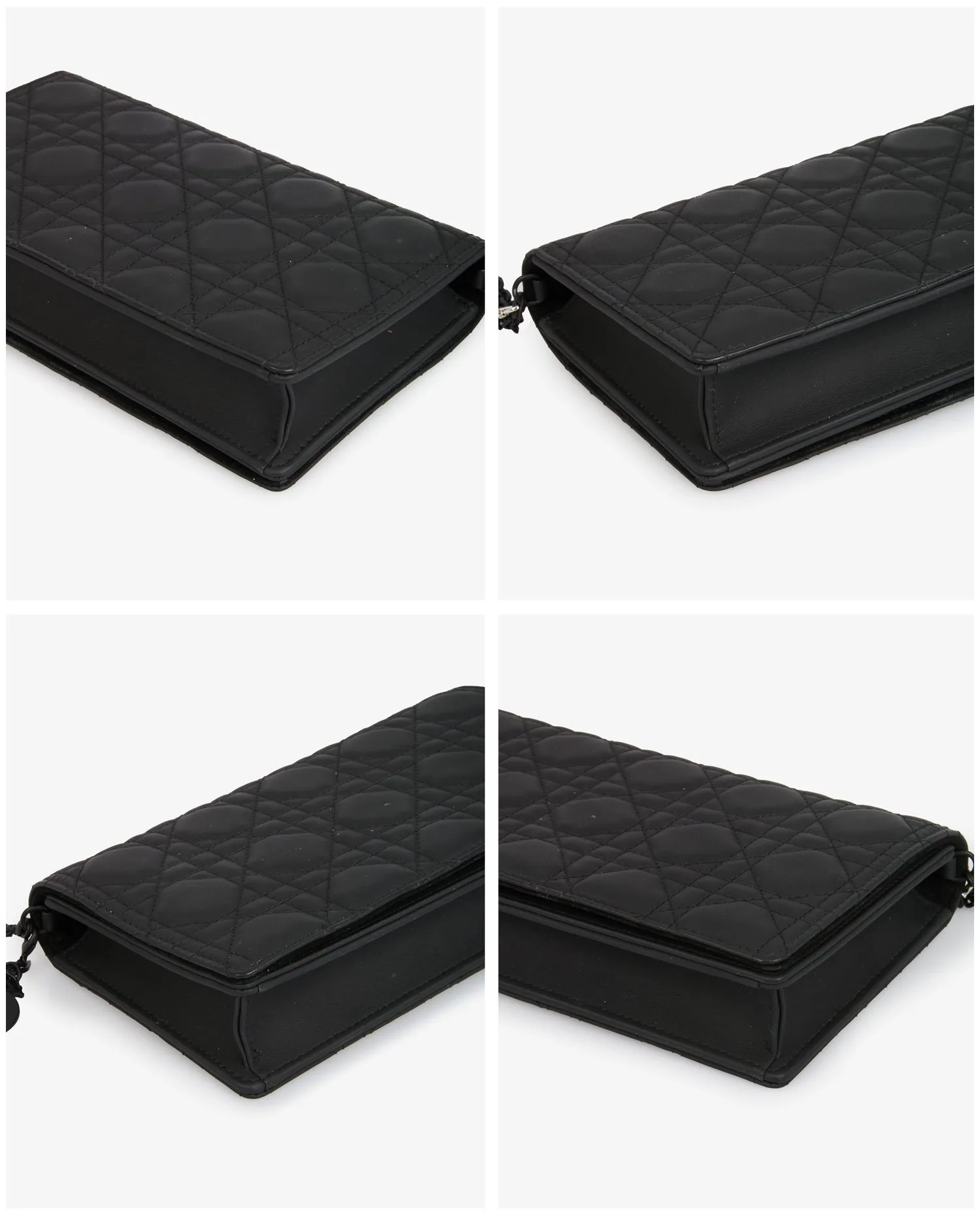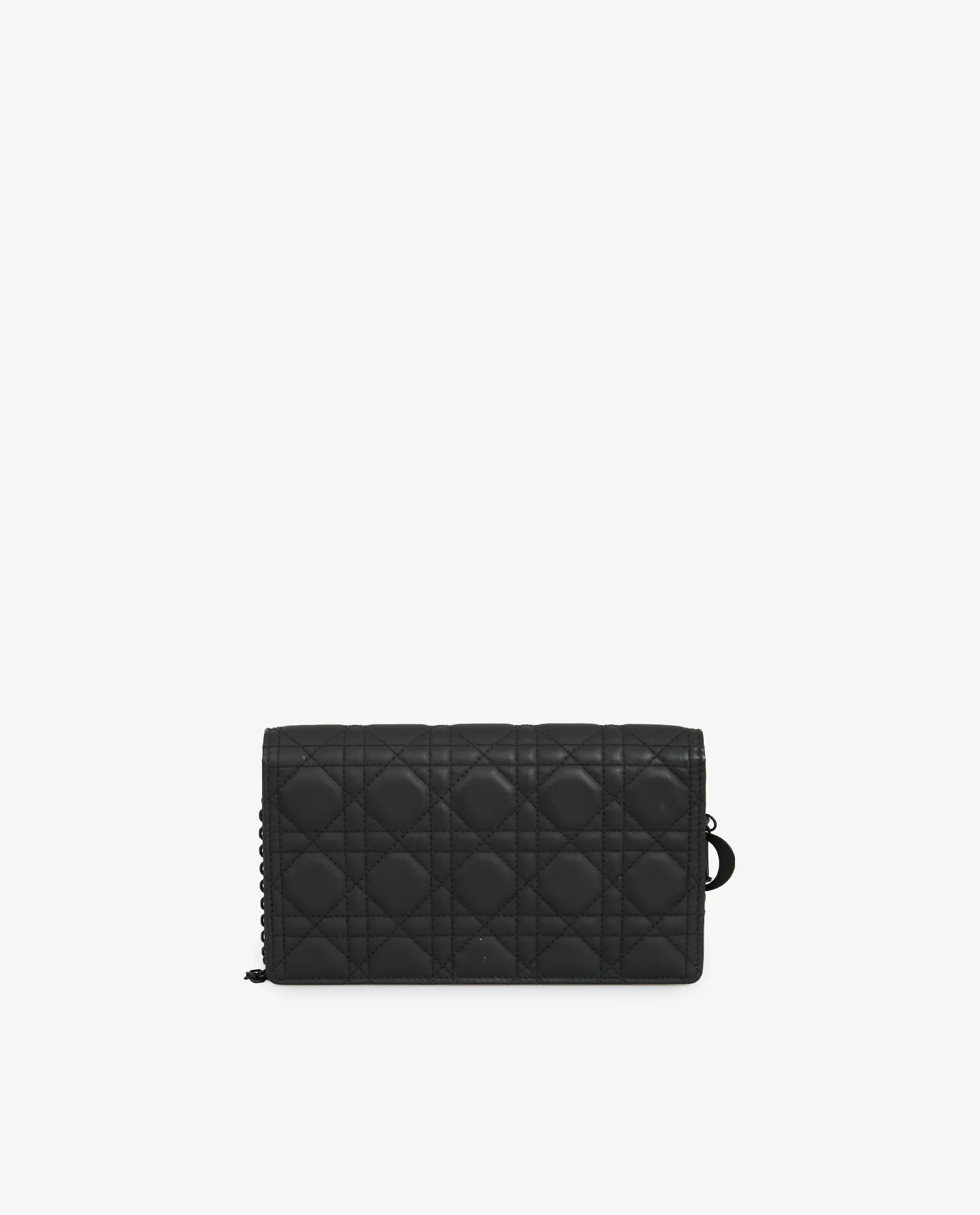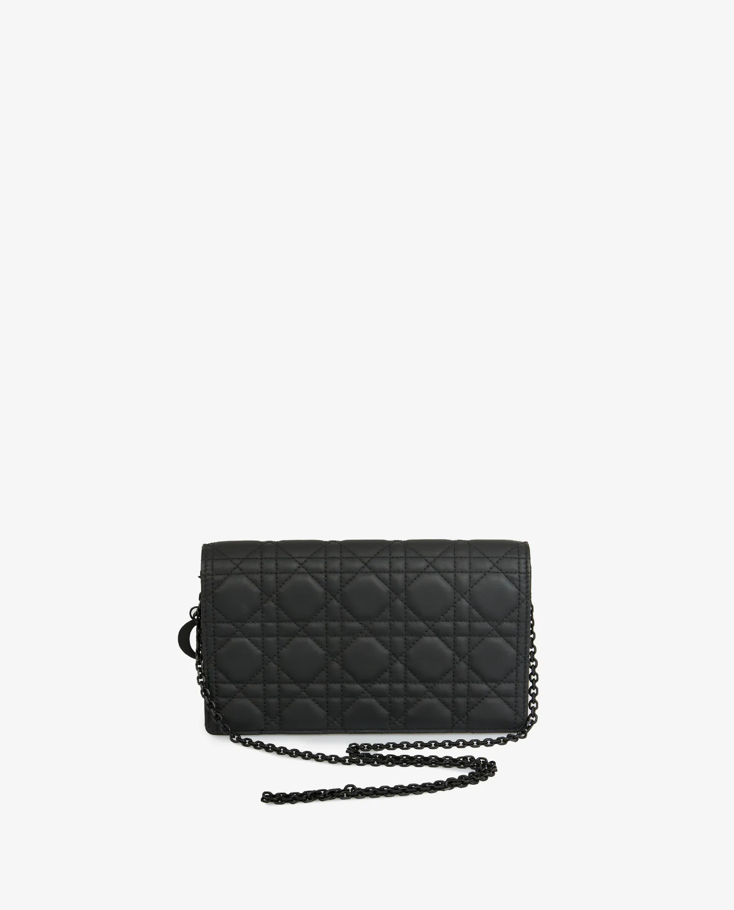 La pochette est réalisée en cuir d’agneau noir, finement matelassé selon le motif cannage géométrique. Les surpiqûres ton sur ton renforcent l’aspect graphique du sac. La chaîne noire brillante permet un porté polyvalent. Les tranches sont nettes, et la structure du sac est rigide avec des lignes précises. L’arrière est dépourvu de marquage, pour une silhouette lisse et contemporaine. Le tout repose sur une base plate renforcée qui garantit stabilité et maintien.