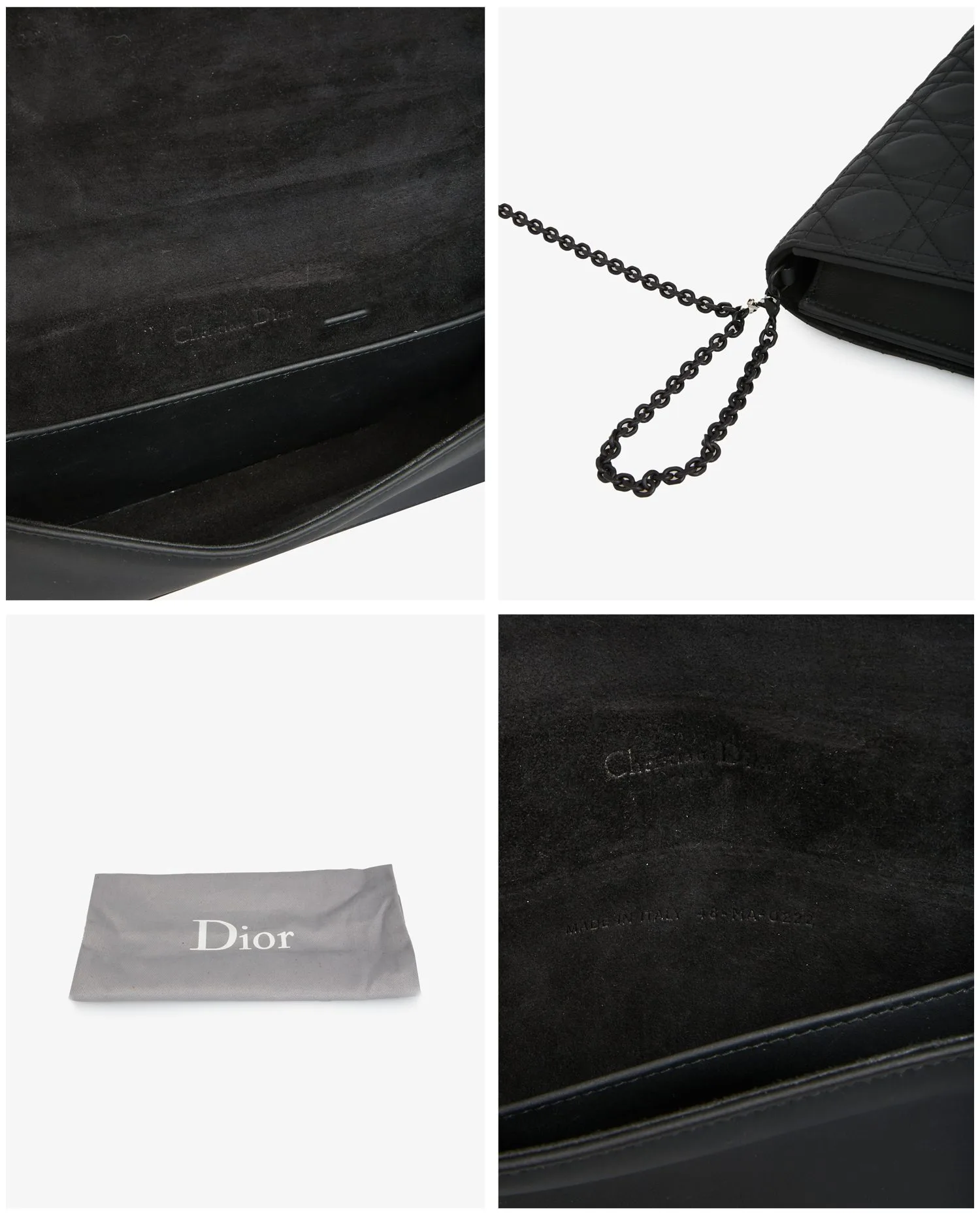 L’intérieur est doublé de suède noir, avec une poche plate intégrée. On retrouve la mention “Christian Dior – Made in Italy” estampée à chaud à l’intérieur, accompagnée du code de production. L’espace intérieur, bien que restreint, permet de transporter les essentiels : cartes, téléphone, clés, rouge à lèvres. L’absence de compartimentage accentue l’aspect minimaliste tout en facilitant l’accès au contenu.