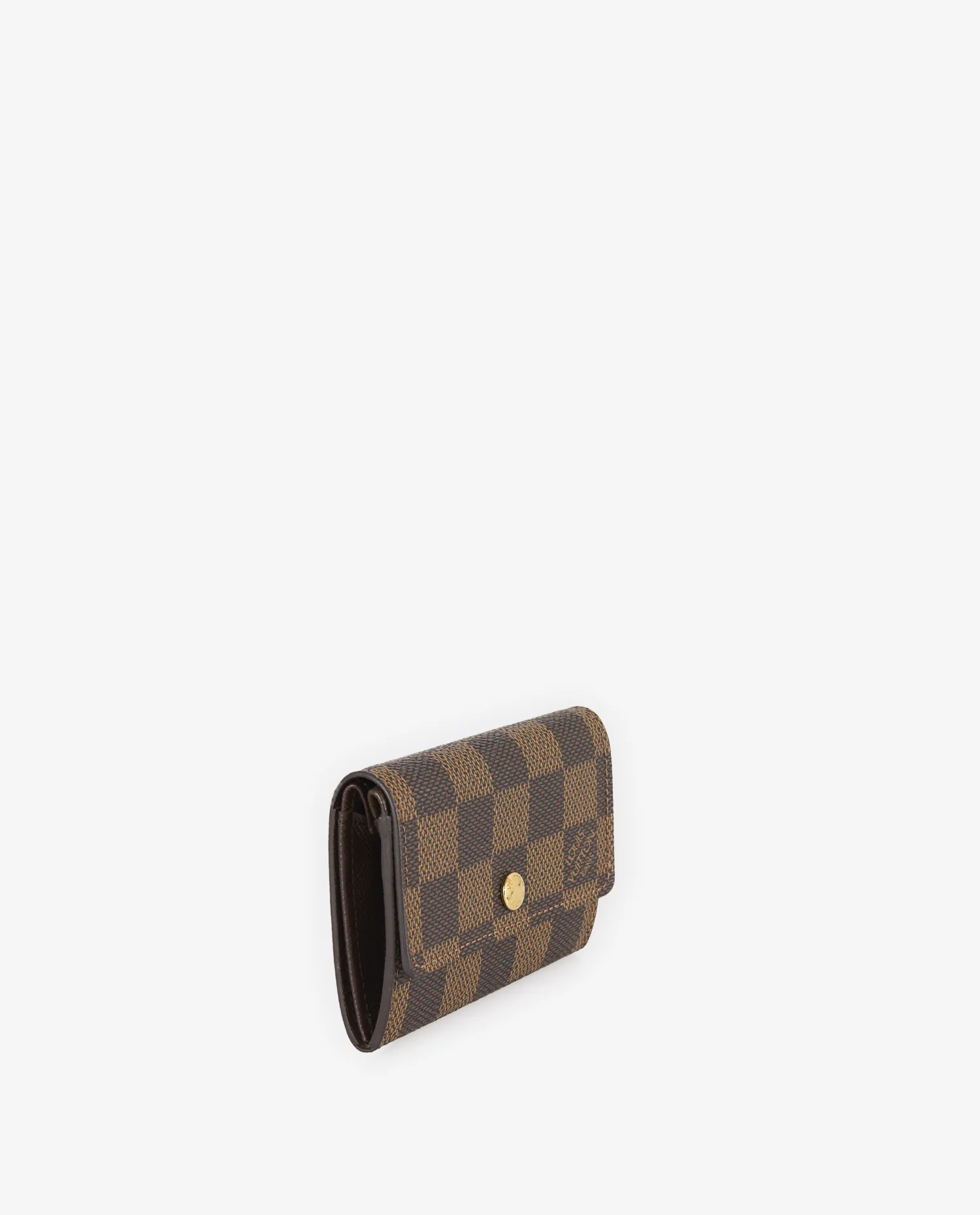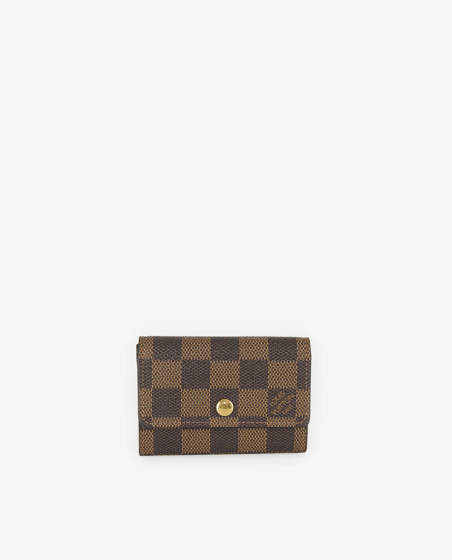 La toile Damier Ebene présente un motif à carreaux dans des tons brun foncé et noisette, avec l’inscription “Louis Vuitton Paris” discrètement intégrée dans le motif. Le rabat est fermé par un bouton-pression rond en métal doré, gravé de la marque. Les bords sont parfaitement finis et les coutures régulières témoignent de la qualité de fabrication. Compact et léger, le porte-monnaie mesure 9,5 cm x 6,5 cm x 2,5 cm, idéal pour une utilisation quotidienne ou en complément d’un petit sac.