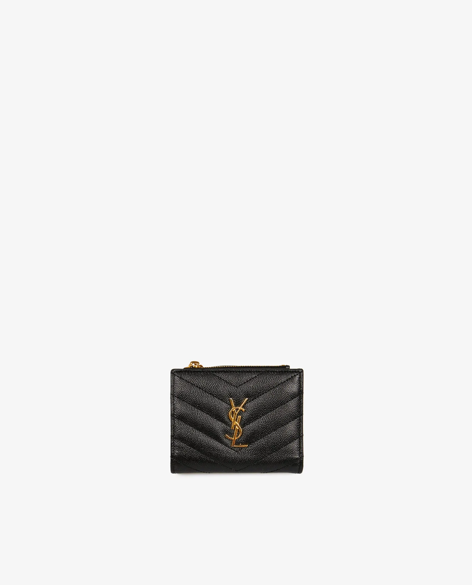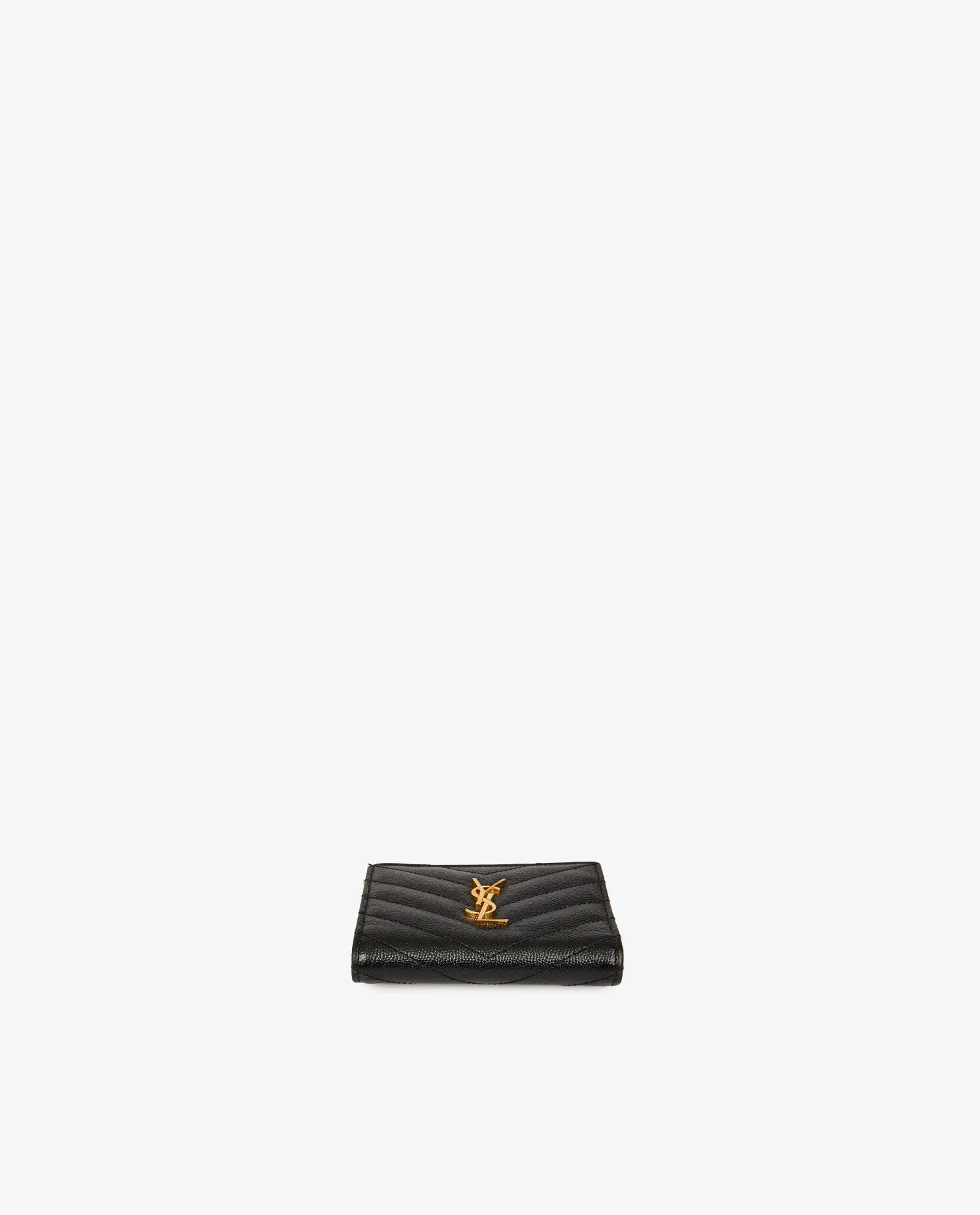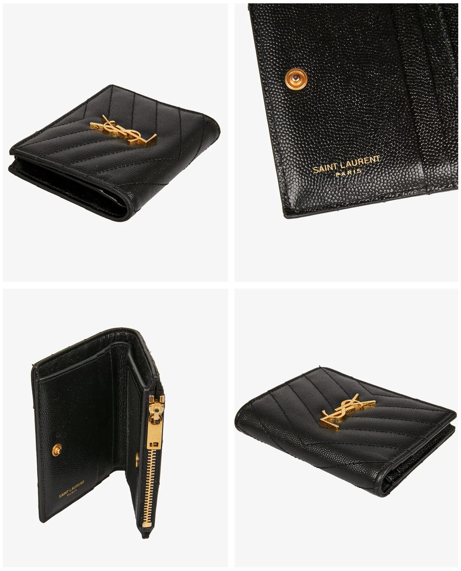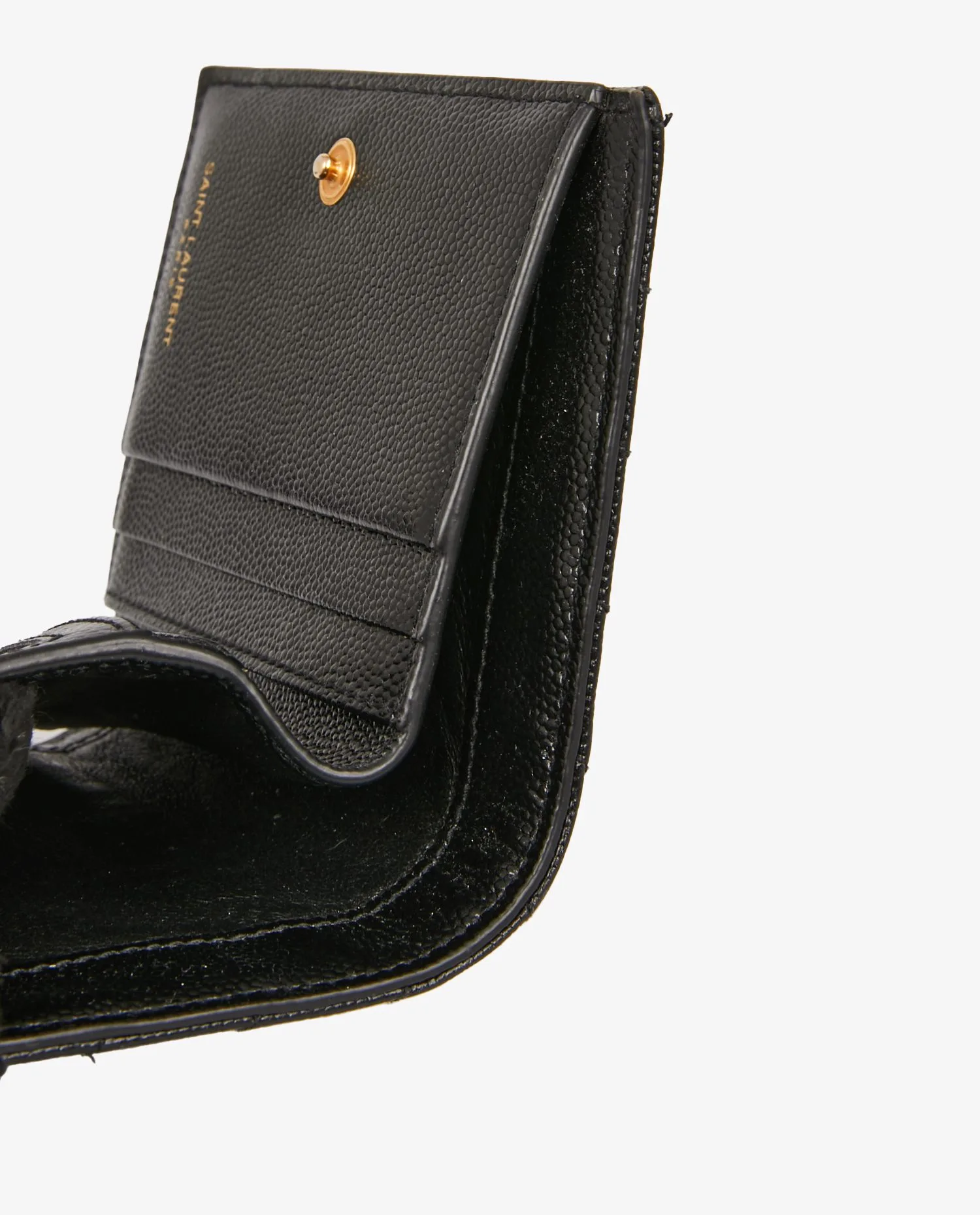 Portefeuille Cassandre Saint Laurent en cuir grainé noir. A l’intérieur, 3 fentes pour cartes, une grande fente pour billets, une poche zippée pour la monnaie. En très bon état. Livré dans son dustbag d’origine. Prix public : 450 euros.