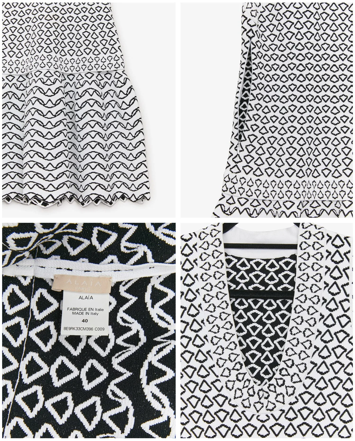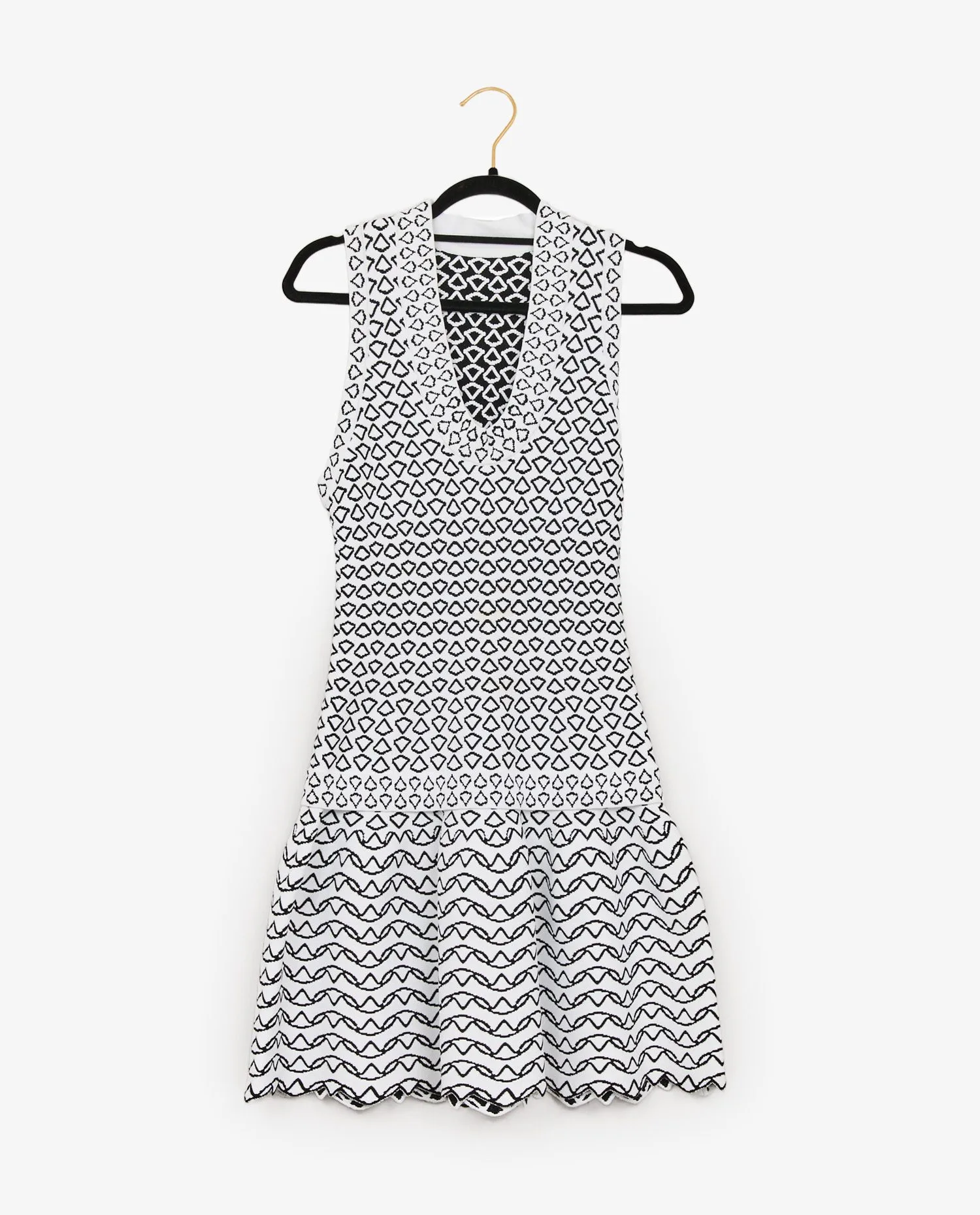 La robe présente un motif texturé en maille jacquard noire sur fond blanc. Le haut du vêtement est orné de motifs en losange, tandis que la jupe adopte un motif ondulé rappelant des vagues. Le col en V structuré et les finitions festonnées au bas de la robe soulignent la technicité du tricotage. Les coutures sont intégrées de manière invisible dans le motif, renforçant l’impression de fluidité. Longueur genou environ.