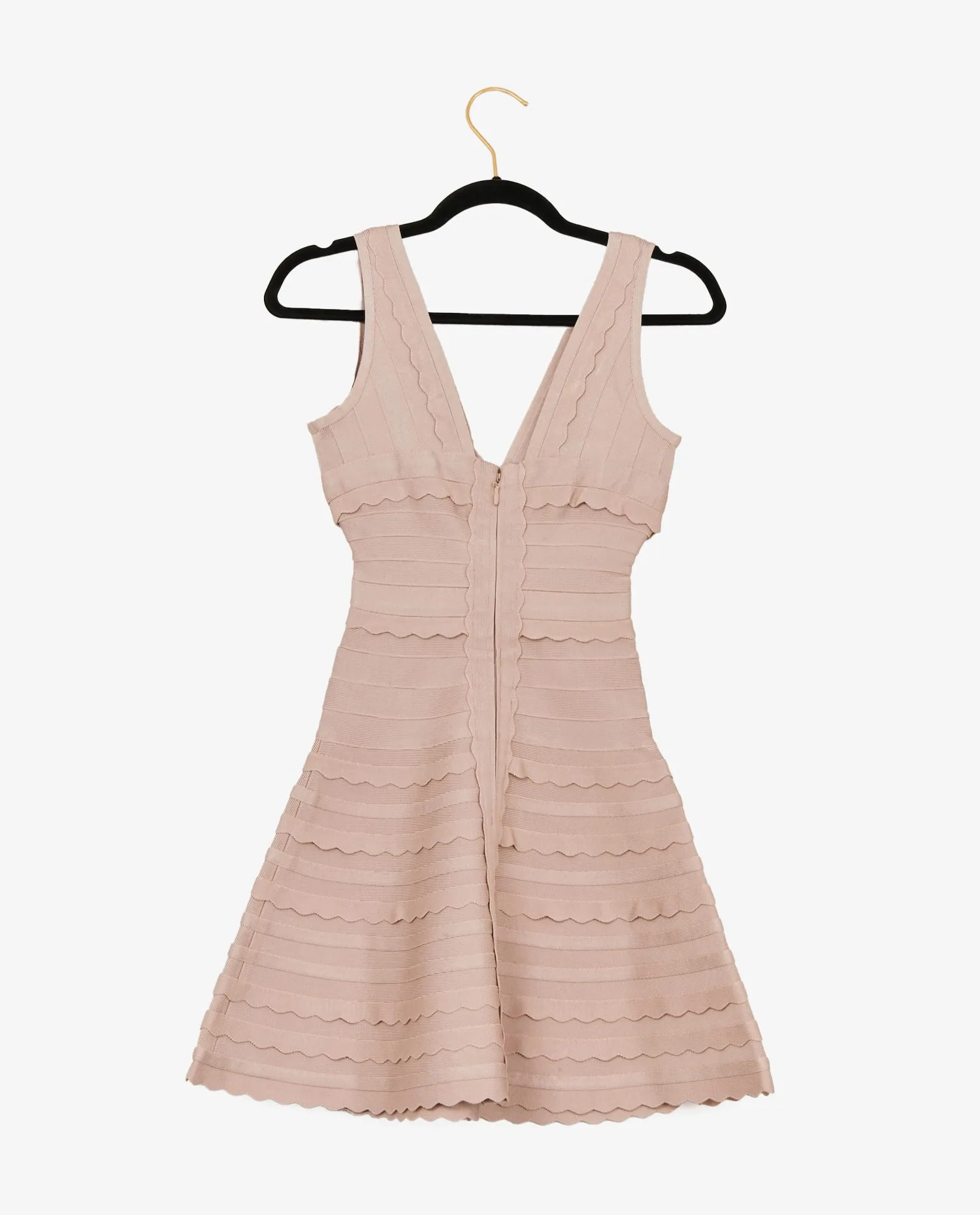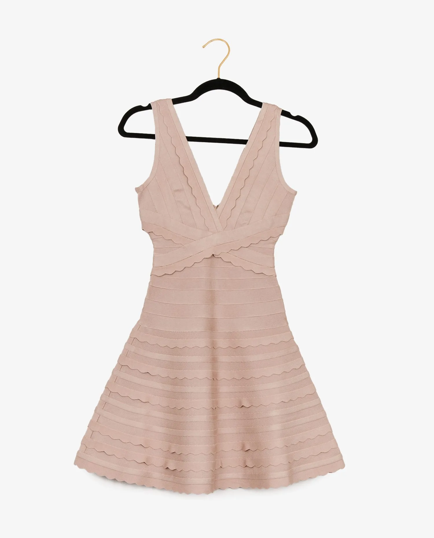 Robe Hervé Léger “Bandage” en rayon rose poudrée. Col V. Elle est moulante sur la partie haute du corps et à volants sur la partie basse. Très élégante. Taille XS, équivaut à un 34fr. Jamais porté.
