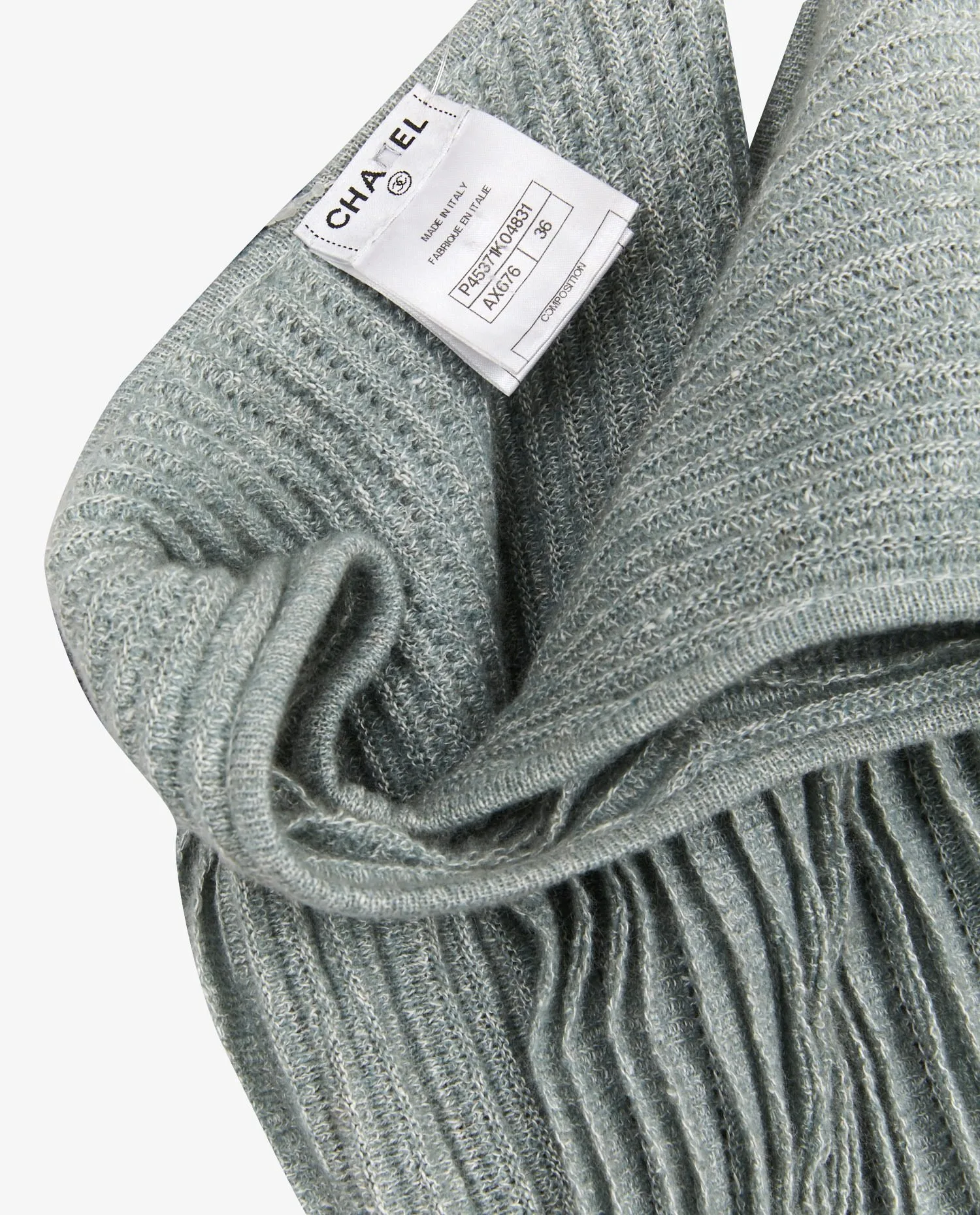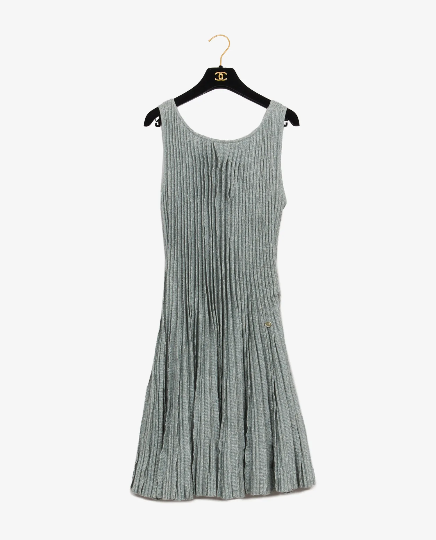 Inspirée des lignes minimalistes des années 2000, cette robe s’inscrit dans la continuité des pièces intemporelles que Karl Lagerfeld a imaginées pour la maison. Elle incarne la quintessence du luxe discret avec une palette douce et élégante, dans un vert sauge subtilement chiné qui évoque la nature et la légèreté. Le détail du petit bouton siglé “CC” doré, cousu au niveau de la hanche, rappelle discrètement l’identité de la marque.