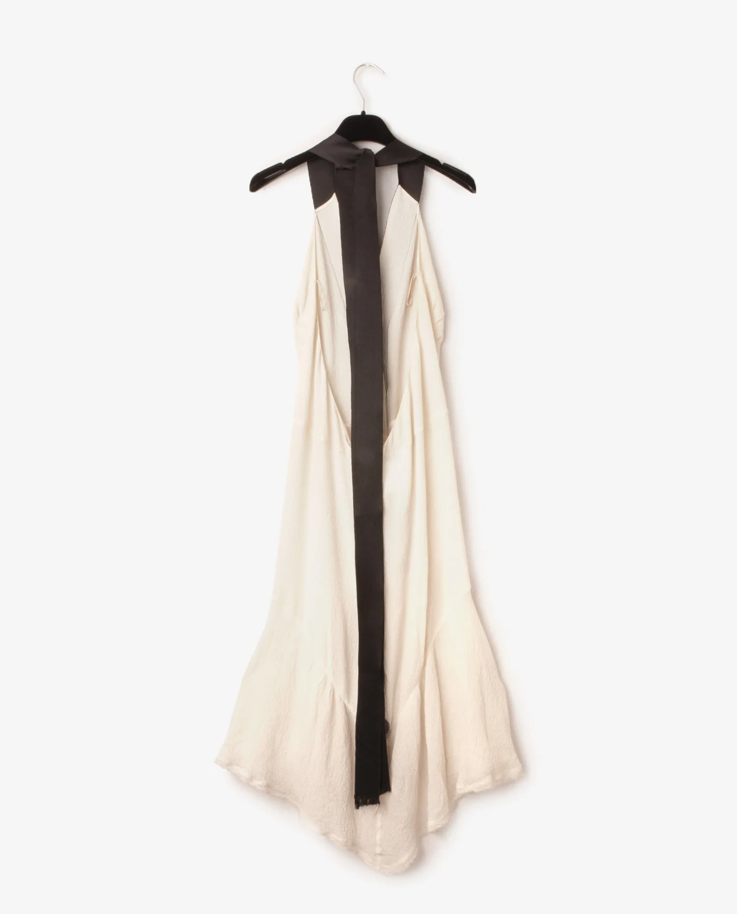 Robe fluide en soie écrue et rubans noirs Chanel de la Collection Printemps/Eté 2004 PAP “Accessoires Musicaux”. Dos nu. Zippée dans le dos.
