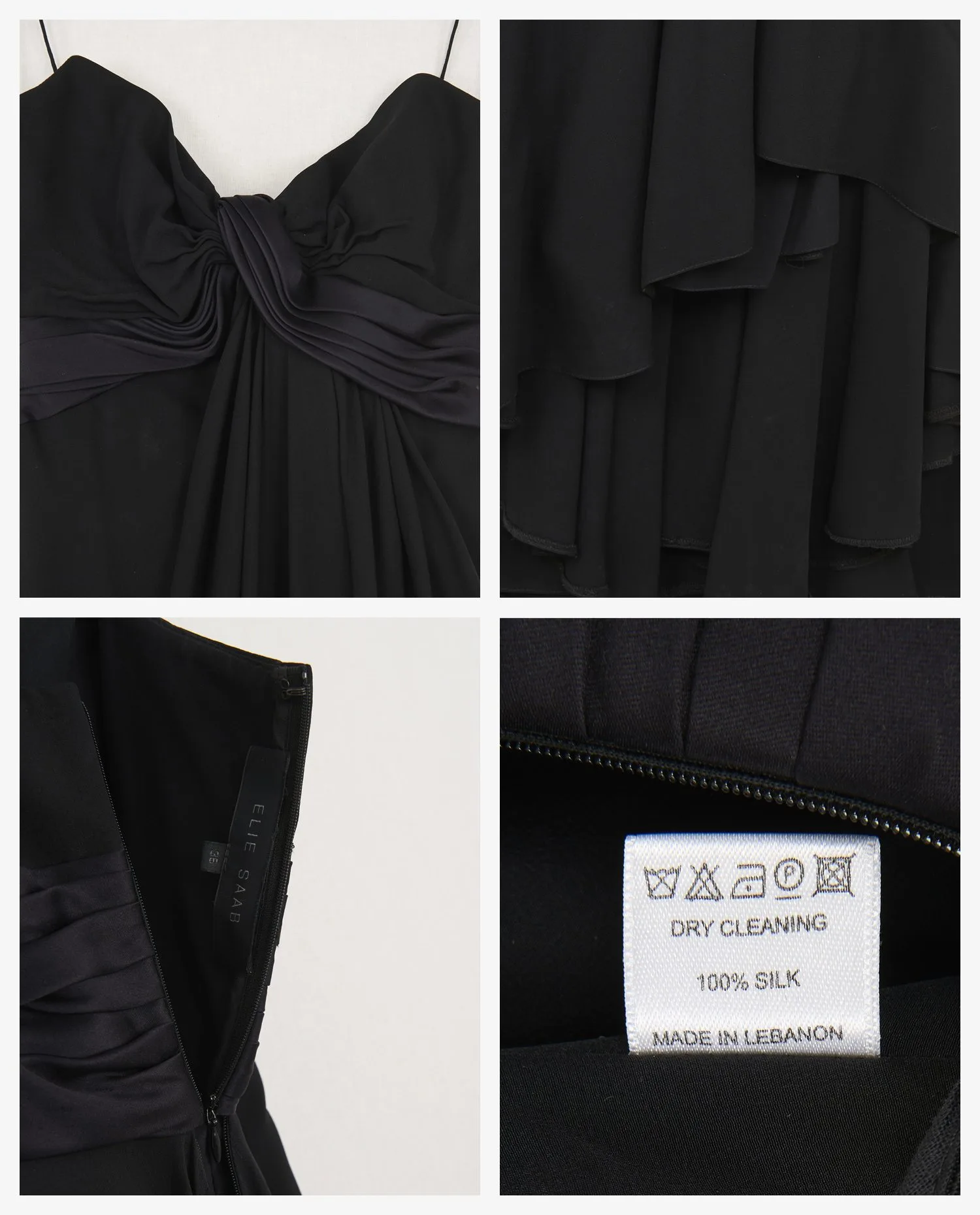L’intérieur est doublé pour assurer confort et opacité. L’étiquette mentionne un nettoyage à sec ainsi qu’une composition 100 % soie, fabrication au Liban. La structure interne du bustier permet un bon maintien sans bretelles apparentes. La fermeture éclair dorsale est discrètement intégrée à la couture centrale arrière.