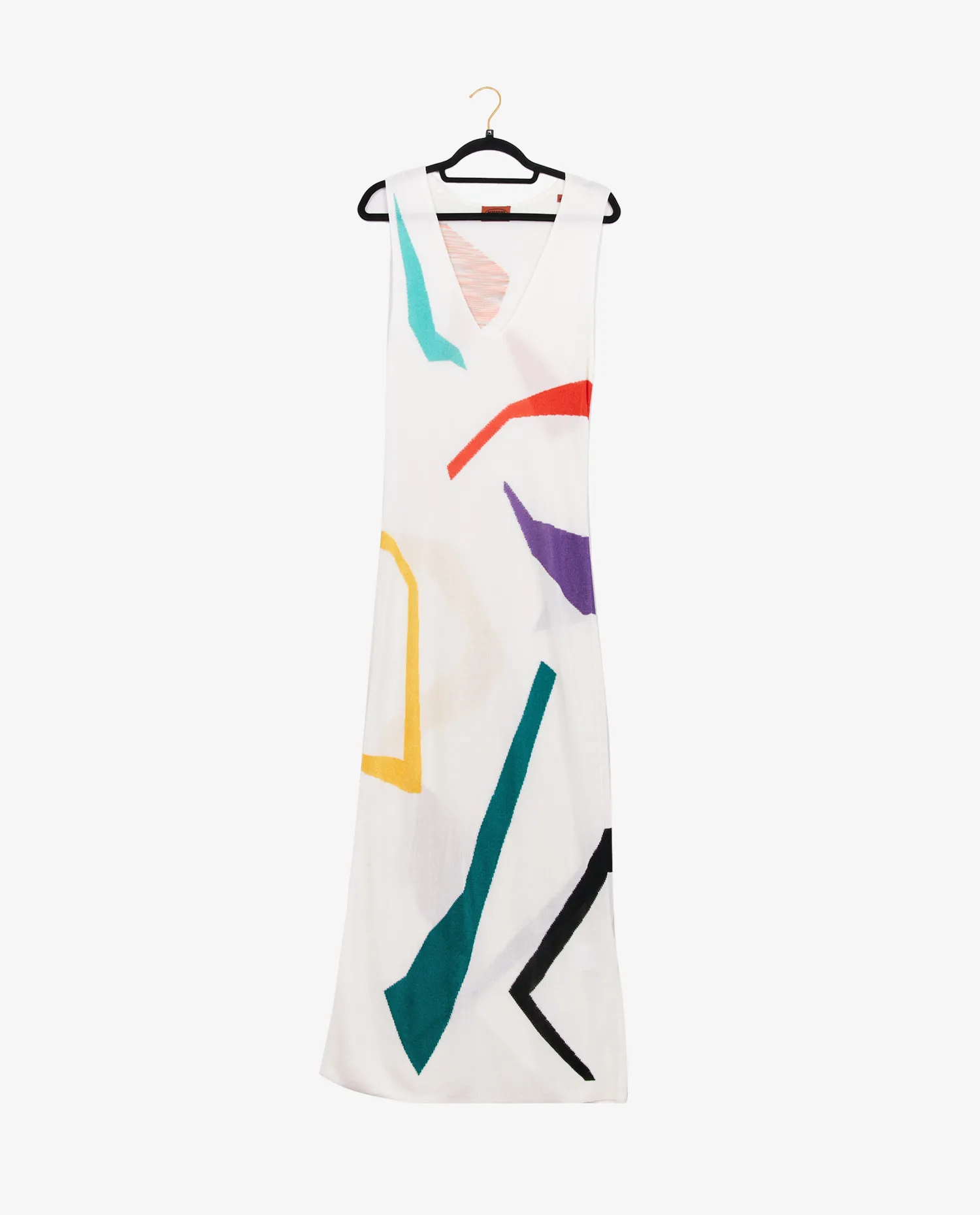 Missoni est une maison italienne emblématique fondée en 1953, mondialement reconnue pour ses créations en maille et ses motifs colorés. Si le zigzag multicolore est sa signature la plus célèbre, la marque explore également les motifs géométriques abstraits, comme ceux visibles sur cette robe. Inspirée du modernisme graphique, cette pièce s’inscrit dans la tradition de Missoni de mêler design textile innovant et esthétique artistique. Les robes longues en maille légère font partie des essentiels Missoni depuis les années 1970, incarnant un style sophistiqué, entre élégance estivale et confort.