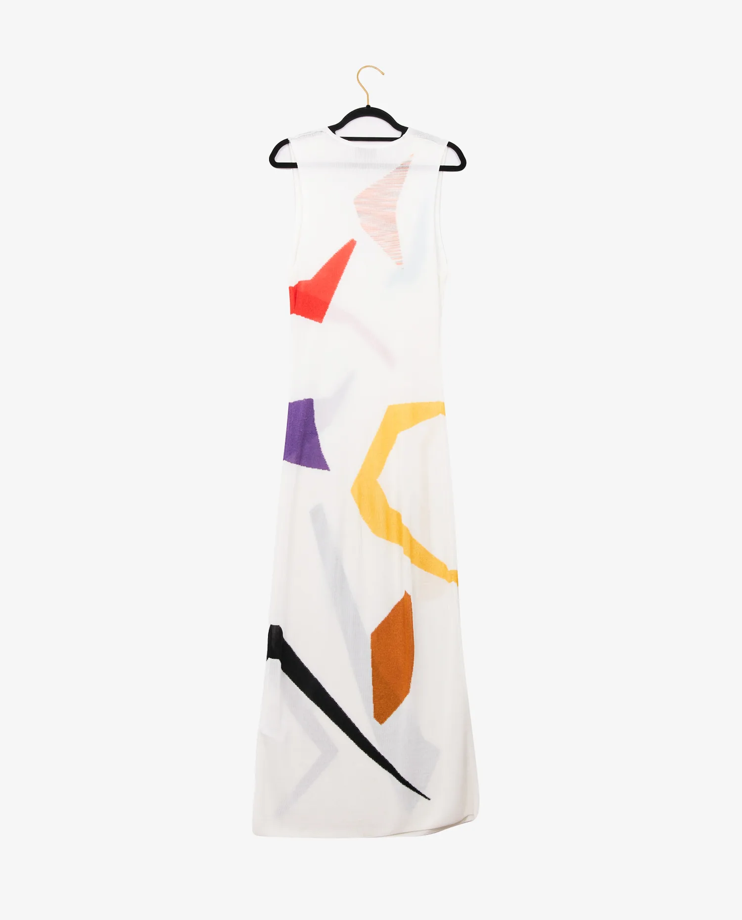 La robe est tricotée dans une maille fine blanche, presque diaphane, qui épouse la verticalité du corps sans marquer les formes. Les motifs sont intégrés dans le tissage, non imprimés, et alternent entre aplats colorés vifs et dégradés subtils. Le jeu de couleurs, bien que varié, reste harmonieux. L’encolure en V, à l’avant comme à l’arrière, accentue la légèreté visuelle de la pièce. Les emmanchures sont bordées d’une finition nette, sans surpiqûre apparente, mettant en valeur le savoir-faire de la maison dans la manipulation de la maille.
