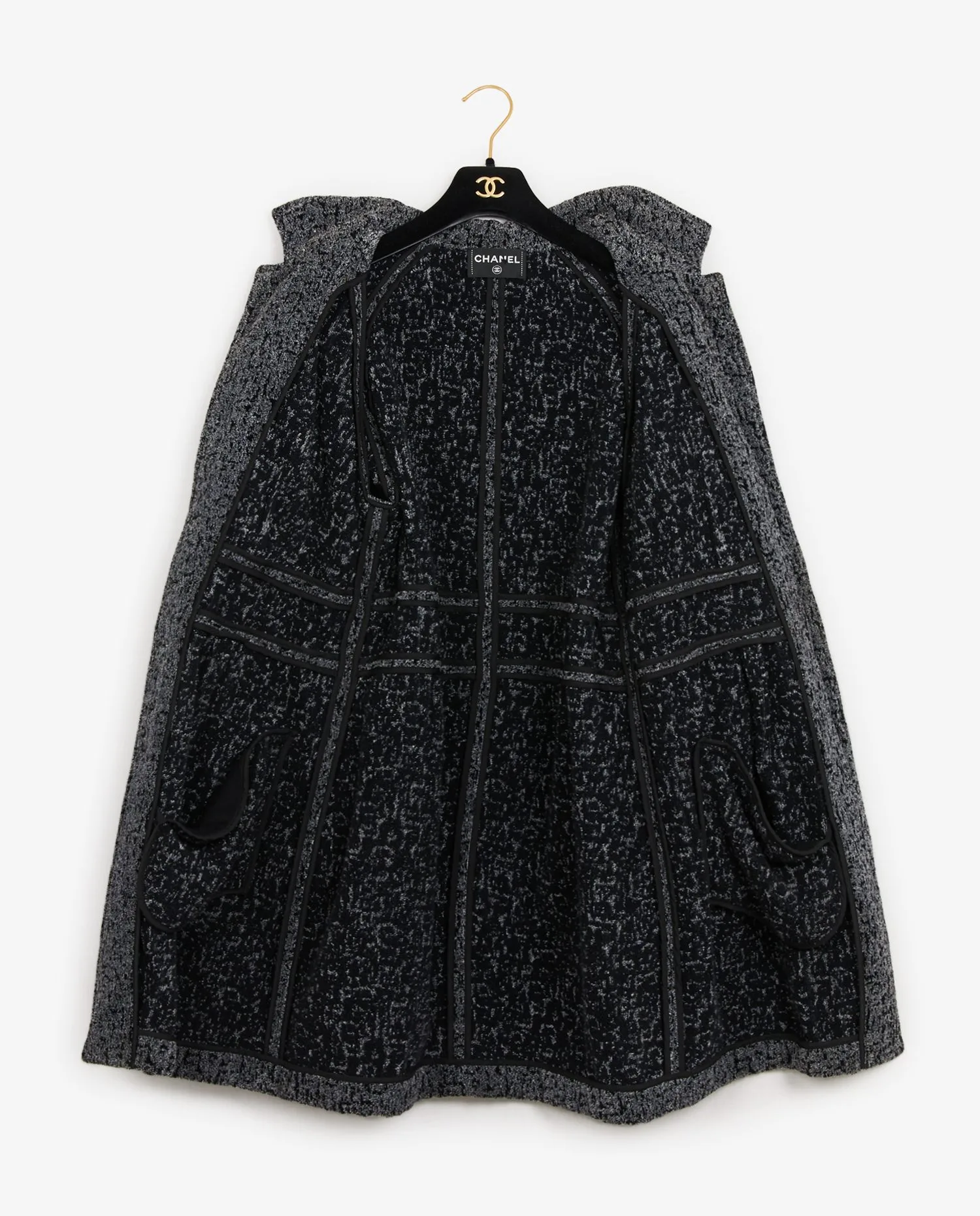 Robe manteau Chanel en matière éponge grise. Ceinturée pour ajuster la taille. Taille 38. En très bon état.