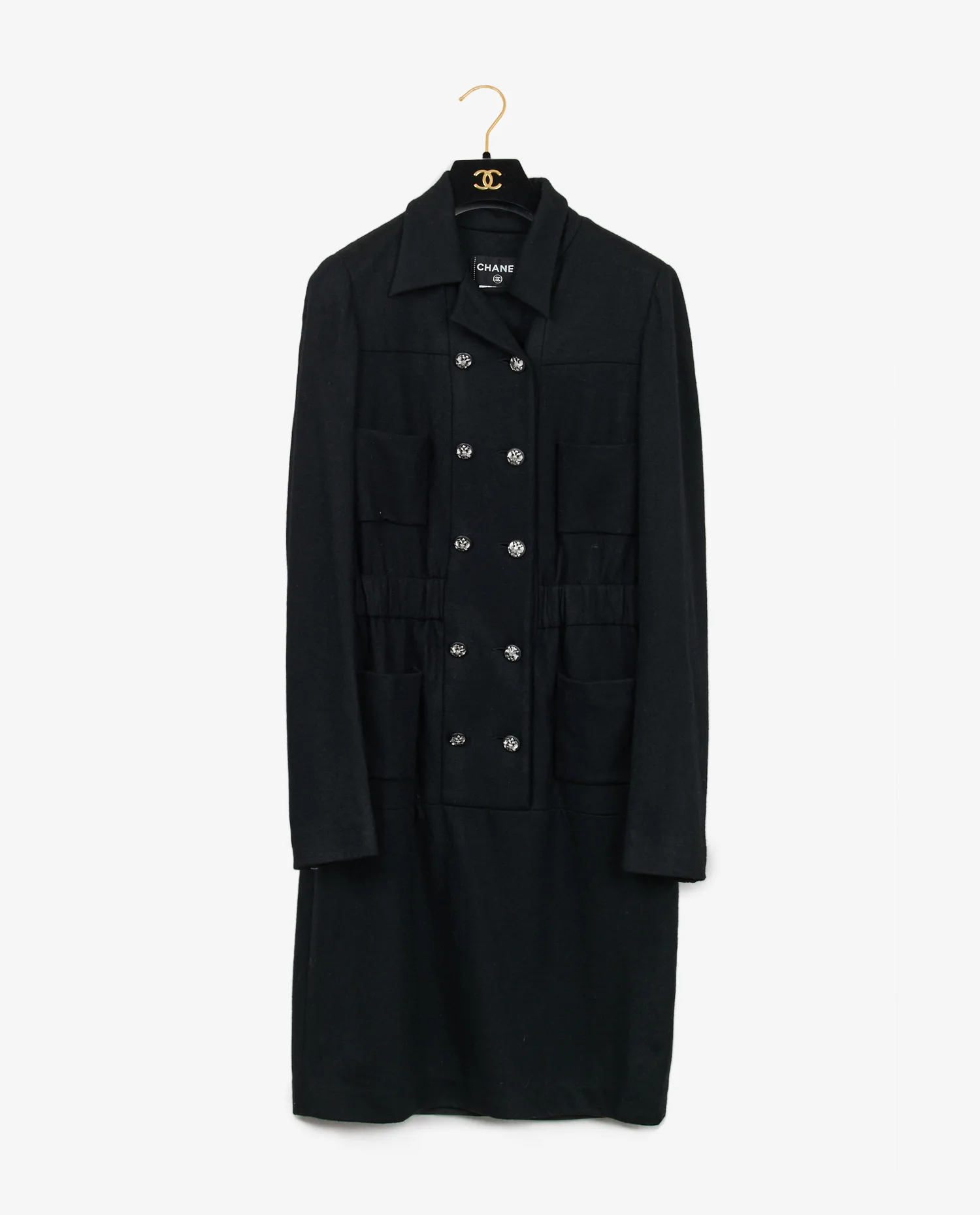 Chanel a toujours su transcender les codes du vestiaire masculin pour offrir aux femmes des vêtements à la fois puissants, pratiques et élégants. Cette robe, qui évoque le style d’un trench ou d’un manteau militaire, s’inscrit dans cette tradition stylistique. En alliant des détails fonctionnels – comme les poches plaquées et la patte de boutonnage à double rangée – à l’élégance du tailleur féminin, ce modèle est l’illustration parfaite de l’héritage de Gabrielle Chanel, constamment revisité par les directeurs artistiques de la Maison.