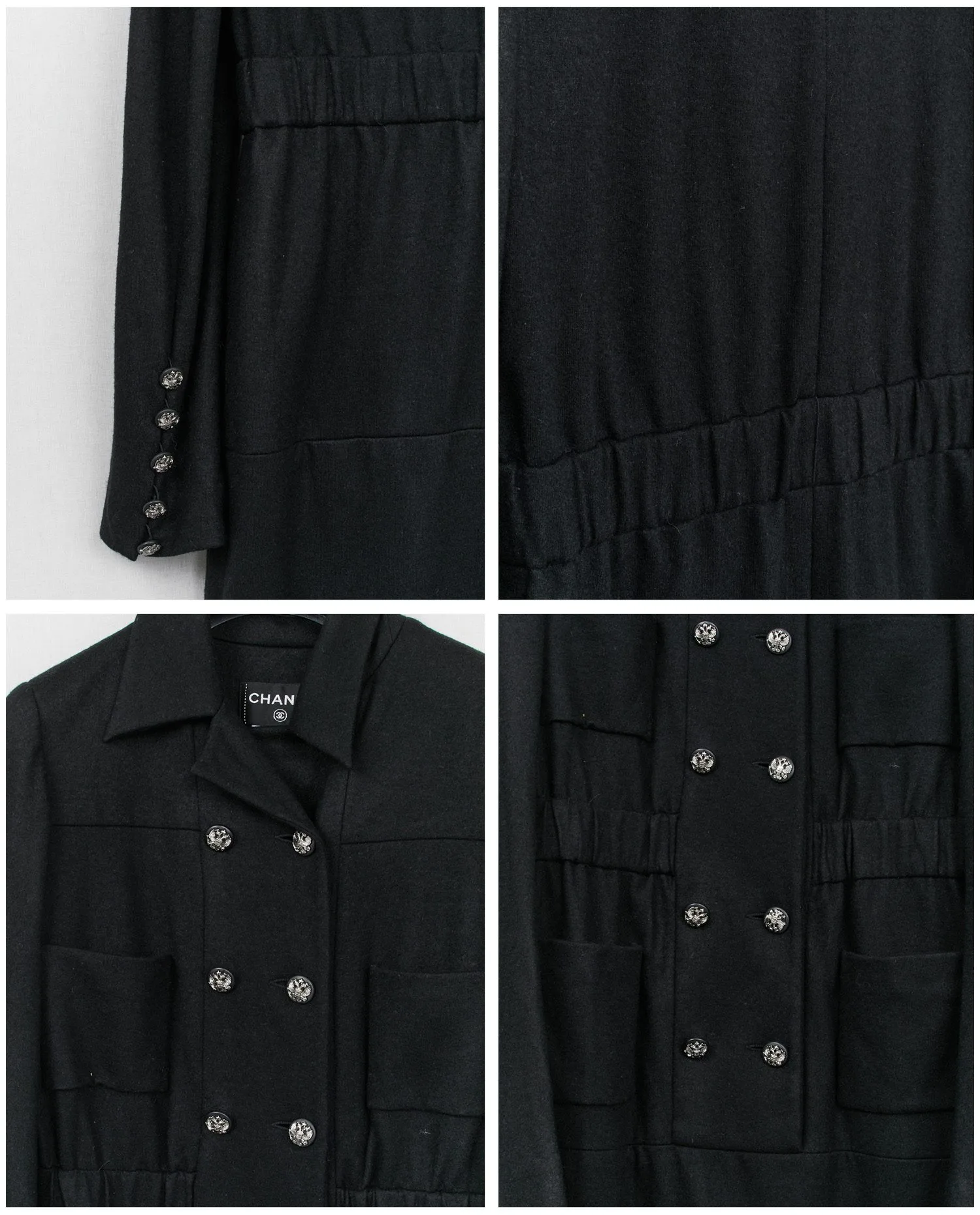 La robe présente un design sobre et équilibré, sublimé par un double boutonnage central orné de boutons bijoux argentés gravés du célèbre logo Chanel. Elle est dotée de quatre poches plaquées à l’avant, deux au niveau de la poitrine et deux sur les hanches, apportant une touche utilitaire et graphique. Les manches longues sont également ponctuées de cinq boutons identiques, accentuant l’allure couture de la pièce. Une ceinture élastiquée ton sur ton vient délicatement souligner la taille sans contraindre le mouvement, tandis que le col chemise apporte une structure nette et élégante.