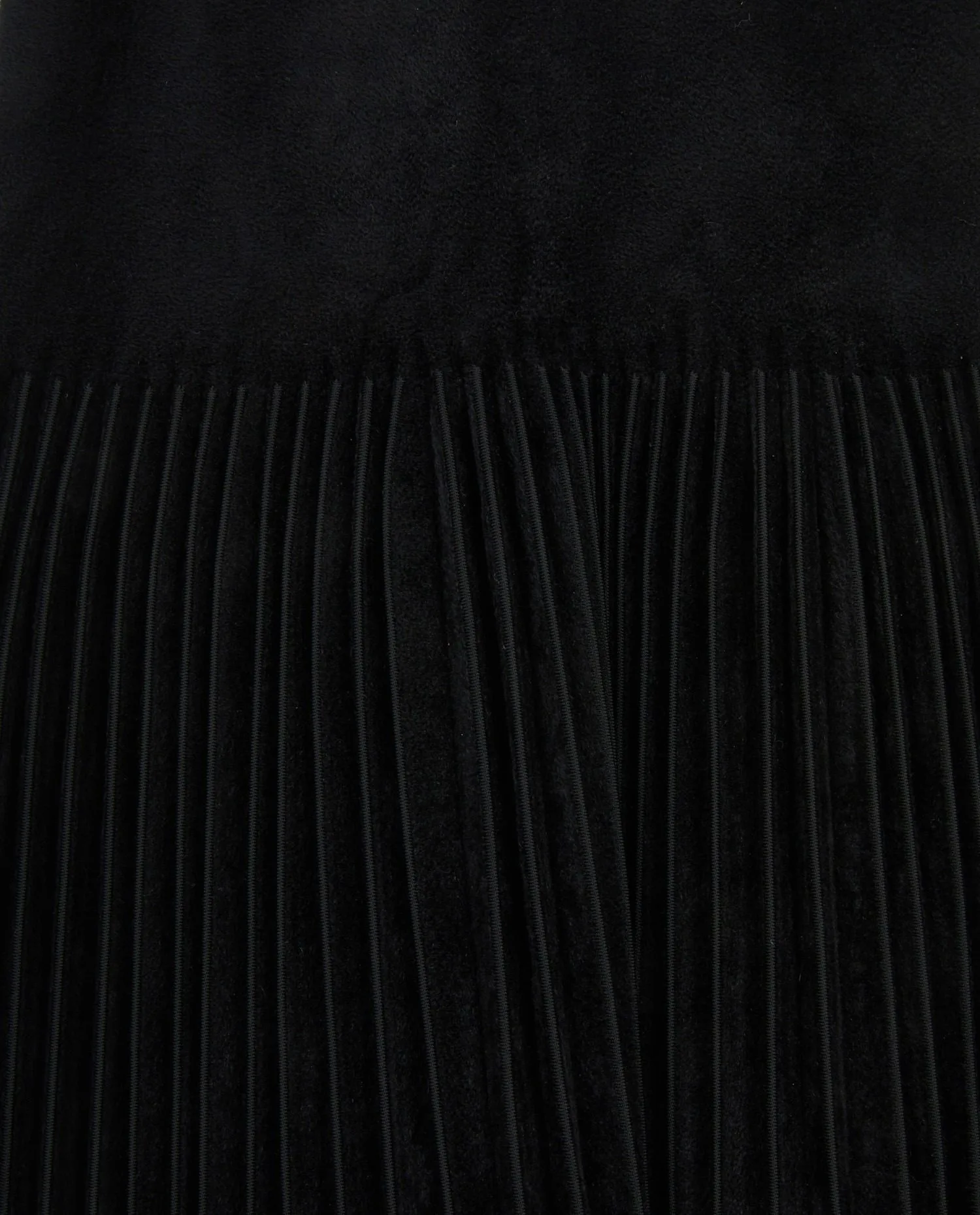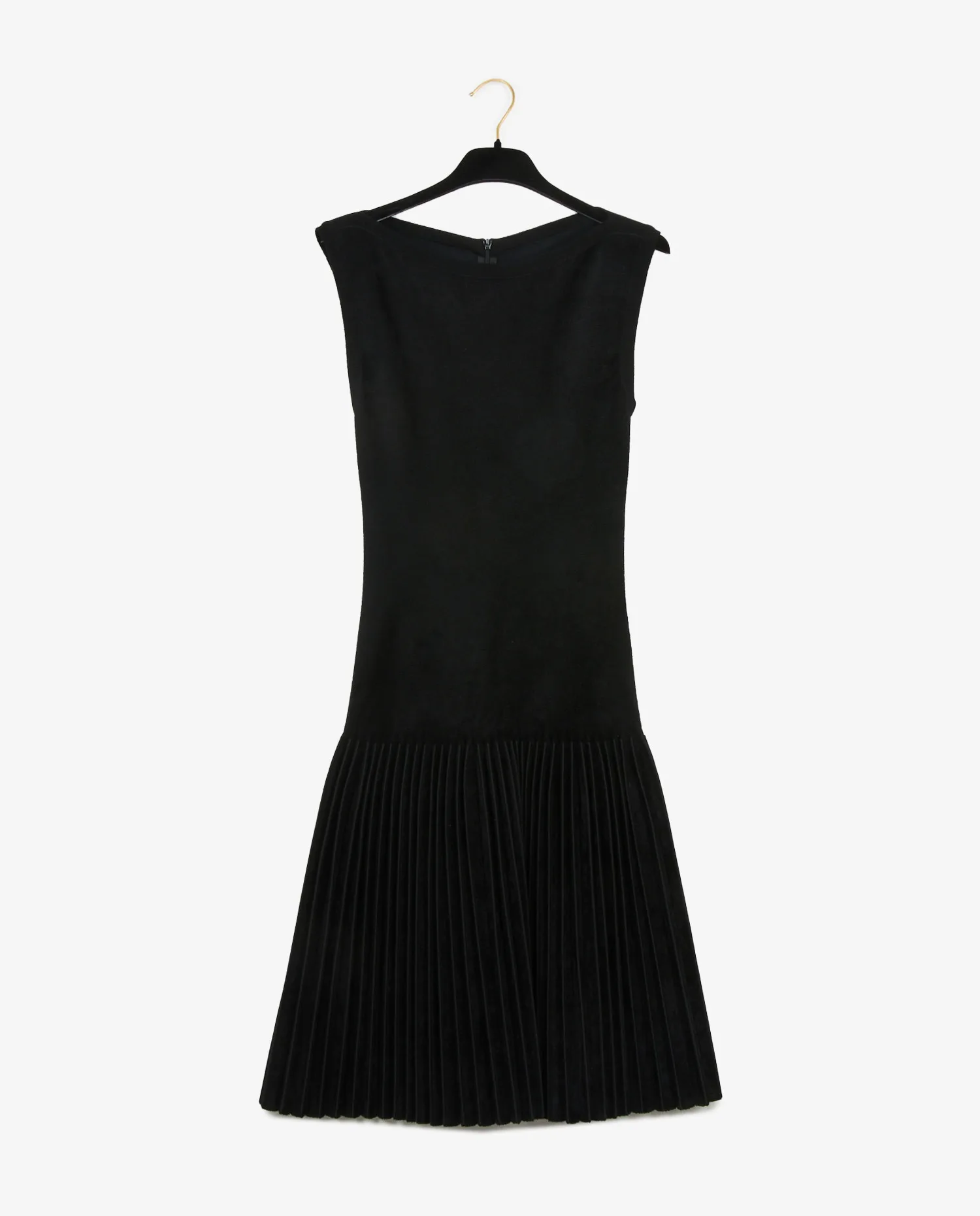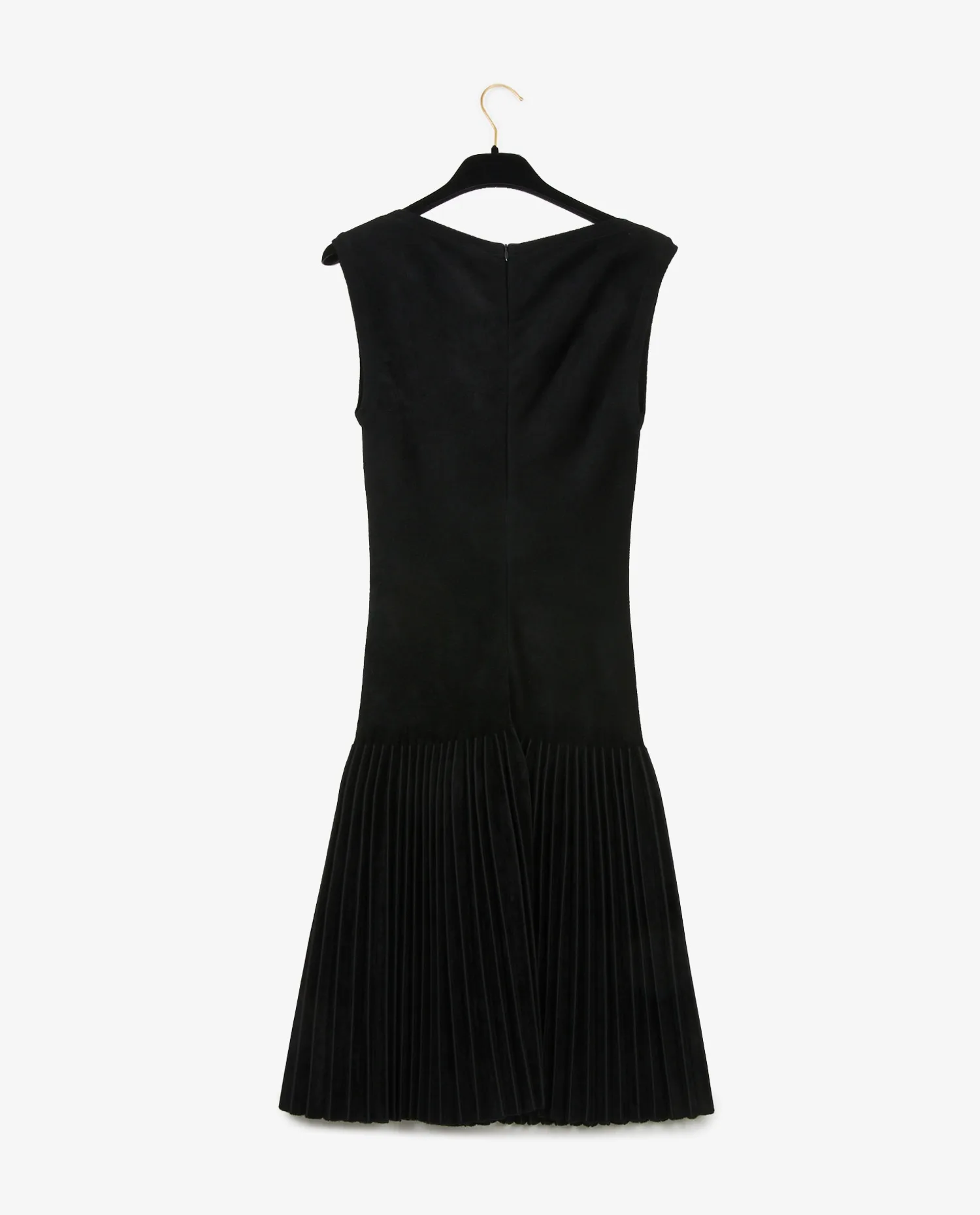 L’extérieur de la robe est réalisé en velours noir profond, offrant une surface légèrement brillante qui capte subtilement la lumière. Le haut présente une coupe ajustée et minimaliste avec une encolure bateau discrète et des emmanchures larges. À partir de la ligne des hanches, la robe se transforme en jupe plissée structurée qui apporte du mouvement et du volume à l’ensemble. Le contraste entre le buste lisse et la partie inférieure plissée crée une silhouette équilibrée. La fermeture éclair placée au centre du dos reste discrète et s’intègre parfaitement dans la ligne du vêtement.