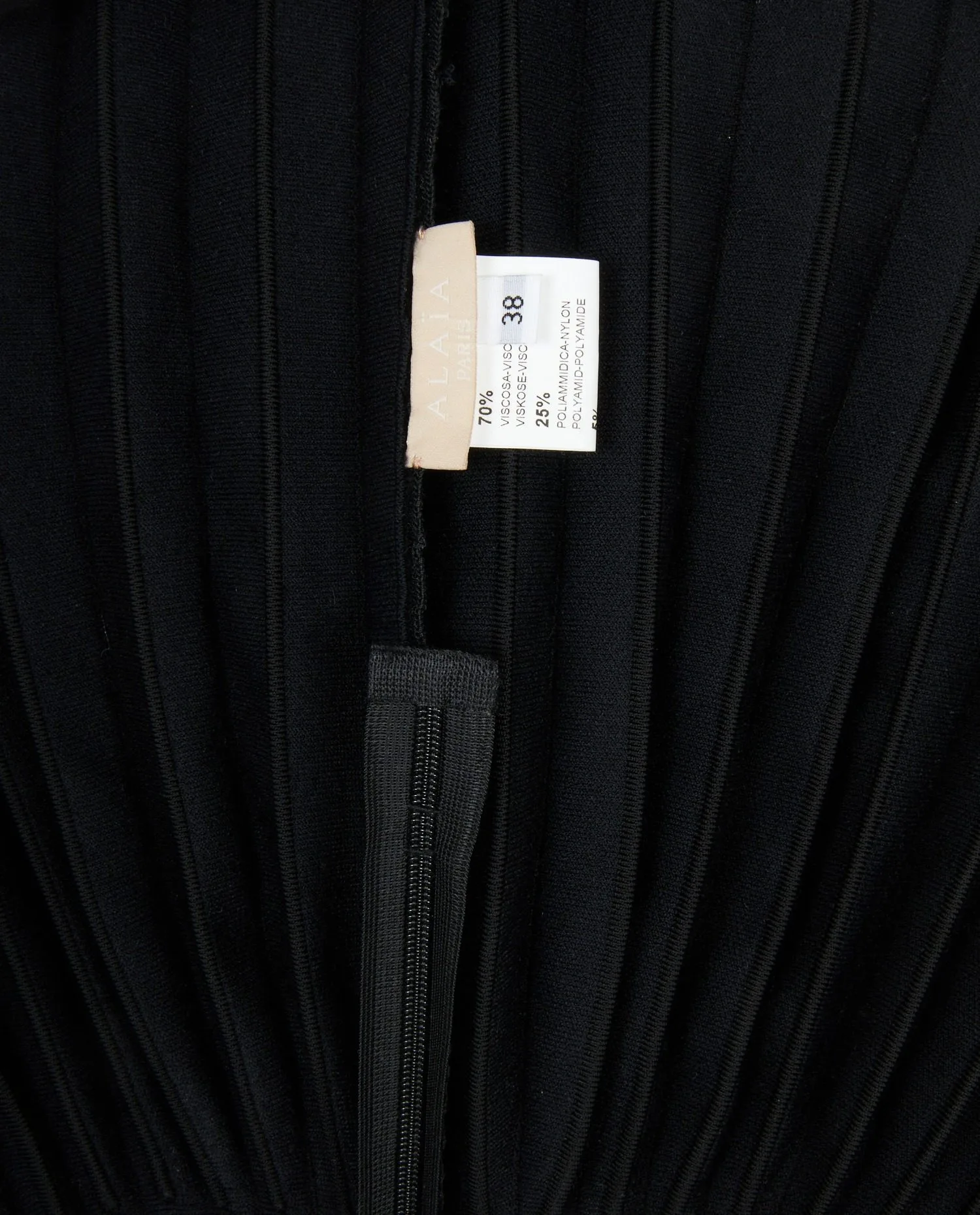 L’intérieur révèle une construction soignée, typique des vêtements de créateurs vintage. Le tissu principal mêlant viscose et soie assure à la fois souplesse, confort et bonne respirabilité. Les coutures internes sont propres et renforcées, garantissant la stabilité de la coupe ajustée. L’étiquette Alaïa ainsi que l’indication de taille 38 sont présentes, confirmant l’authenticité et la provenance de la pièce. L’absence de doublure épaisse permet au velours de conserver toute sa fluidité naturelle.