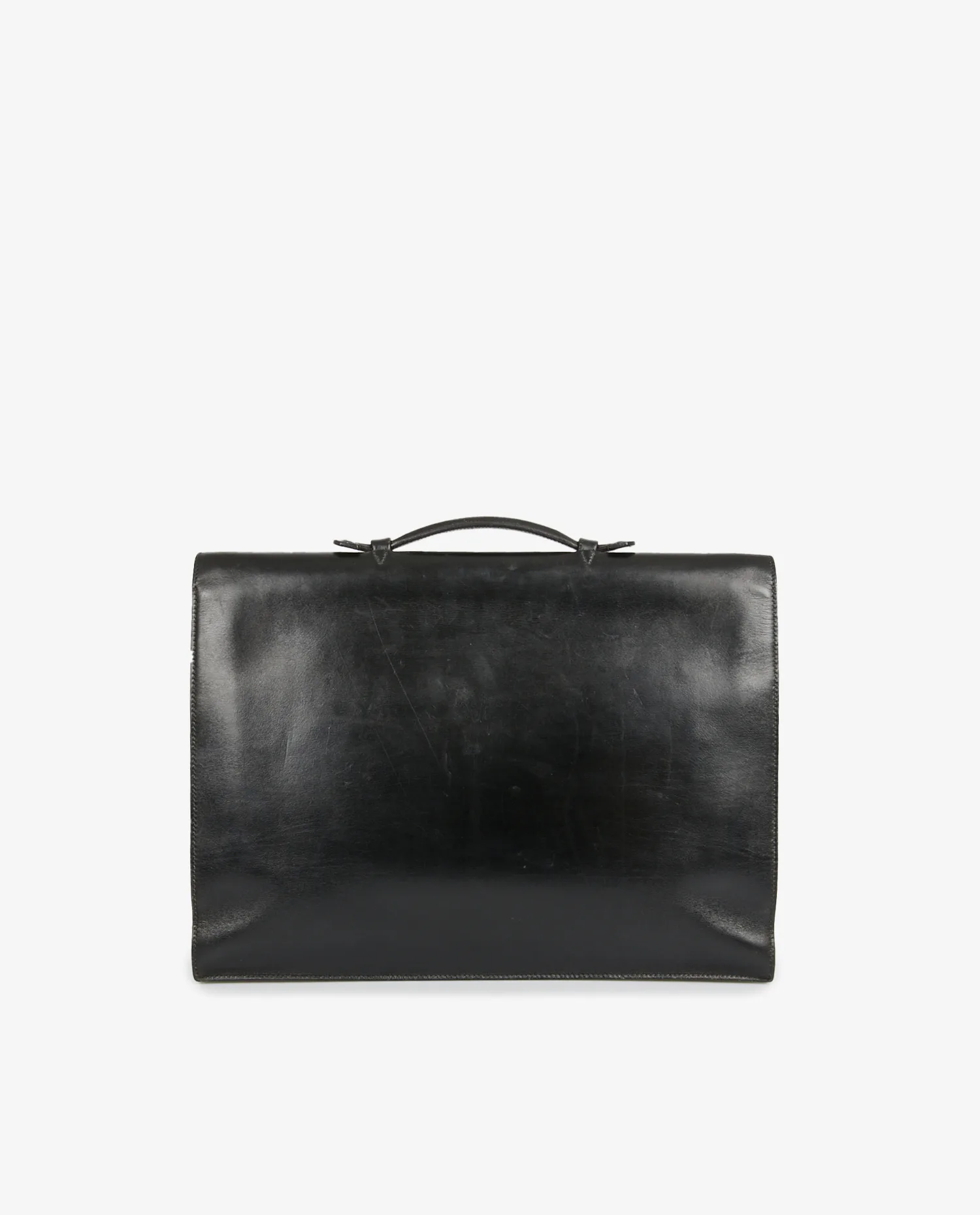 Sac à dépêches Hermès vintage en cuir box noir. L’intérieur est en suède gris. En très bon état. Quelques marques d’usures d’usage sur la languette du fermoir.