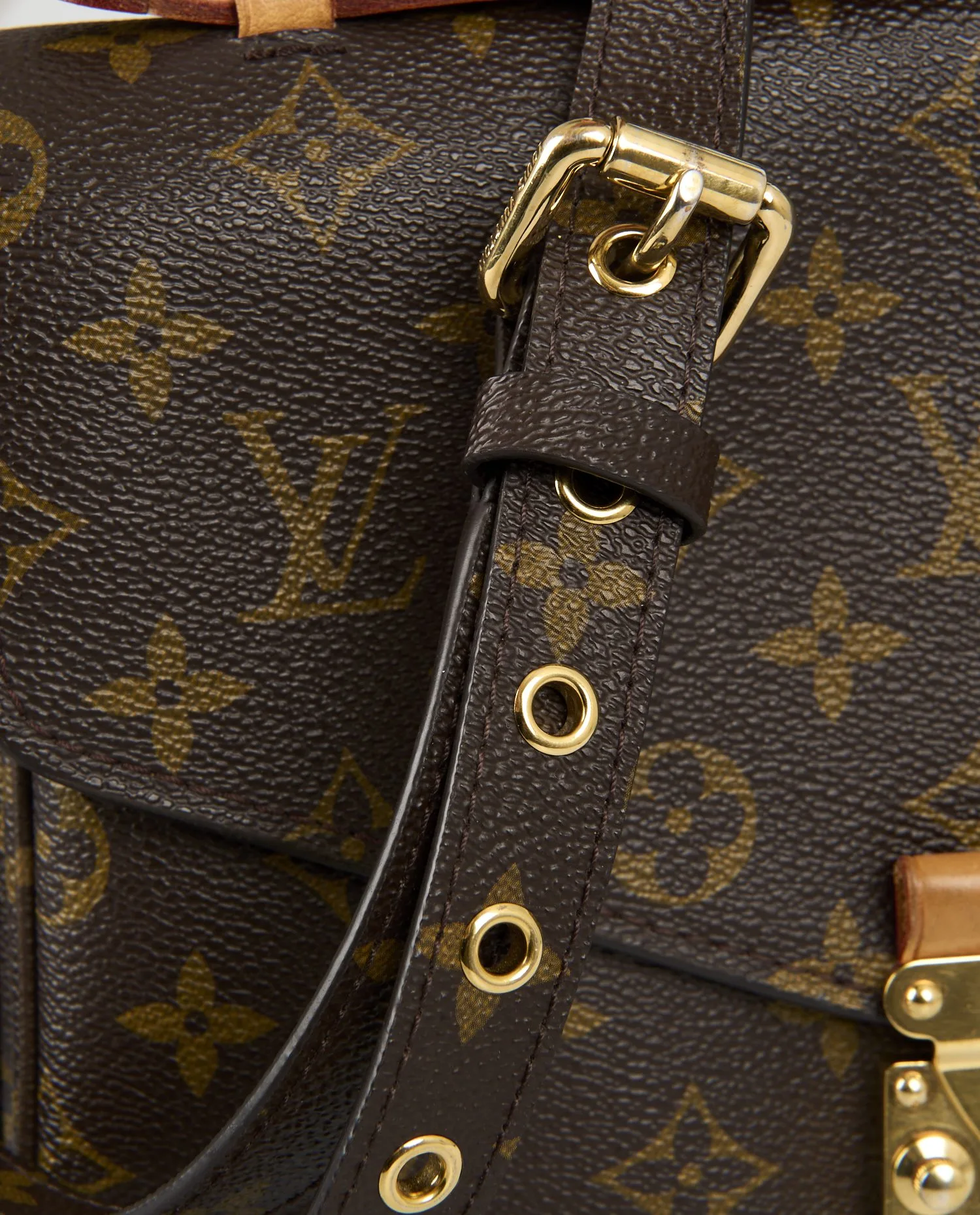 Le sac est confectionné en toile Monogram marron foncé, ornée du motif floral et du monogramme LV en teinte ocre. Il est structuré autour d’un rabat à fermoir S-lock doré, accentué par une patte en cuir naturel. Les bords sont renforcés pour une bonne tenue, et les finitions en laiton poli complètent l’ensemble. Une poche zippée figure au dos pour un accès rapide aux objets essentiels. La bandoulière ajustable en toile monogrammée, dotée d’œillets dorés et d’une boucle en laiton, permet de l’adapter à différents styles de port.