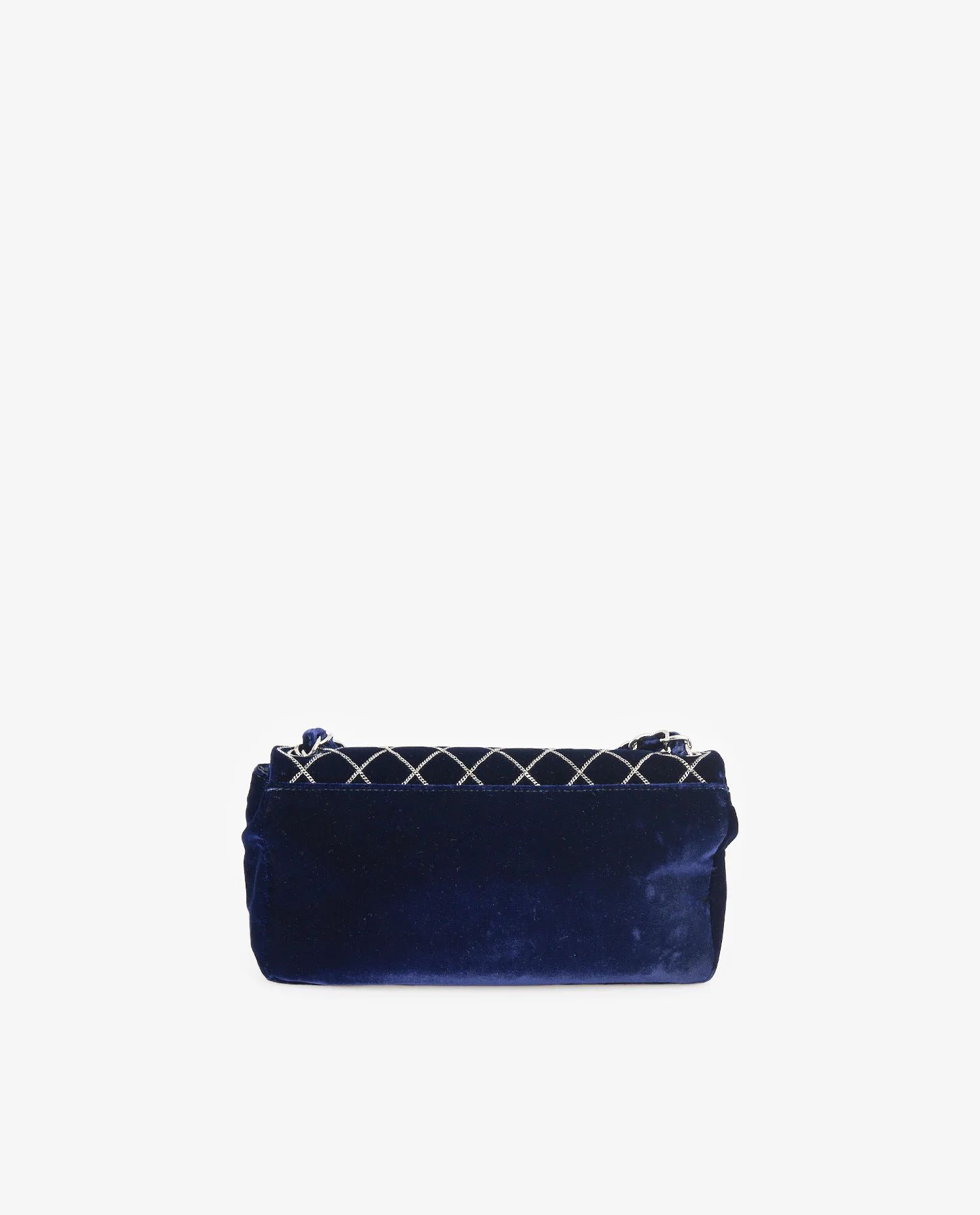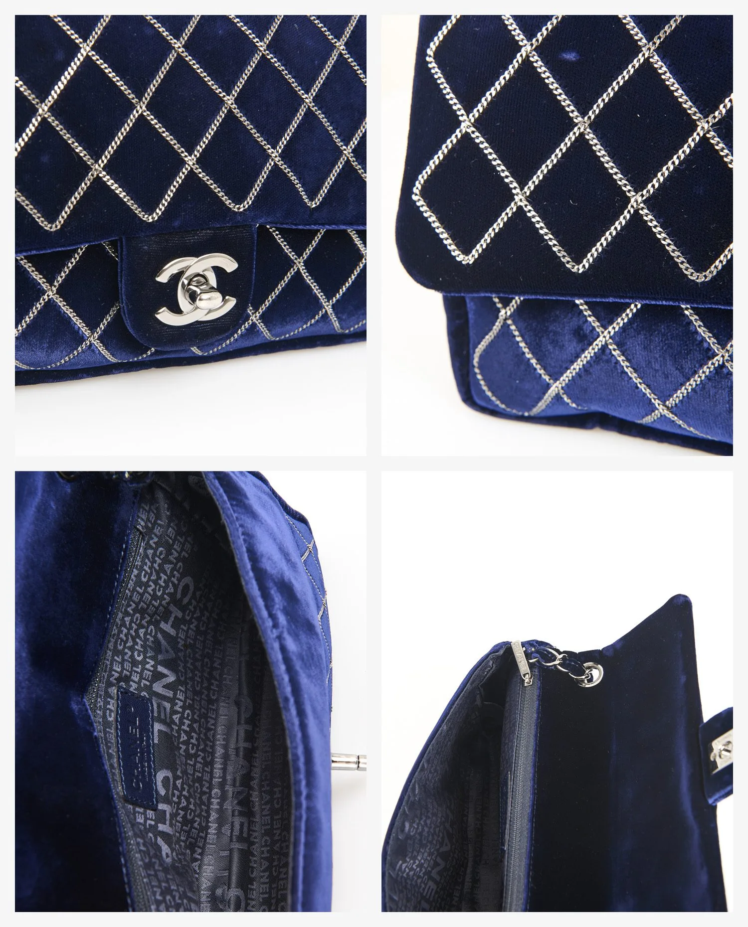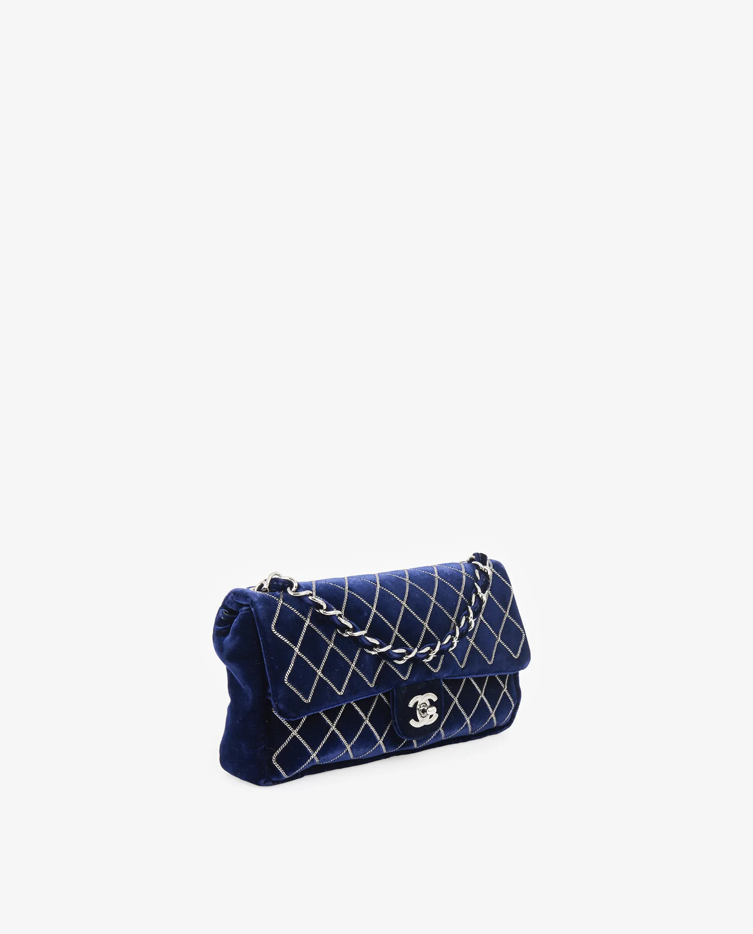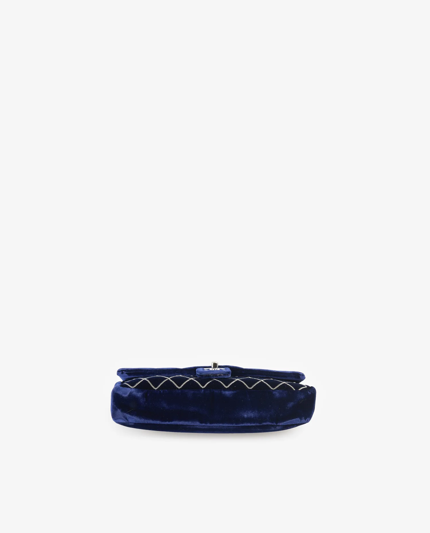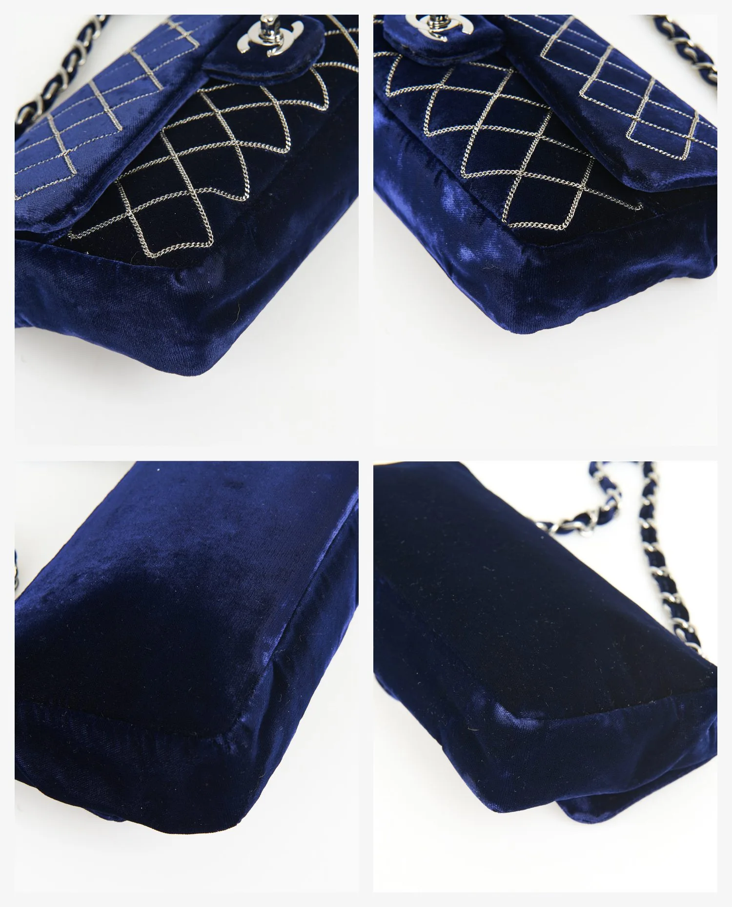 Le velours violet présente un fini lustré et dense, jouant avec la lumière selon l’angle de vue. Le matelassage en losanges est accentué par un fil en chaîne argentée, brodé avec régularité. La fermeture se fait par un rabat muni du fermoir iconique double C tournant, en métal argenté poli. La bandoulière courte permet un porté épaule. Le dos du sac est plus épuré, avec une surface lisse sans motif, mettant en valeur la richesse du velours. Les dimensions sont compactes, idéales pour une utilisation en soirée ou pour transporter l’essentiel au quotidien.