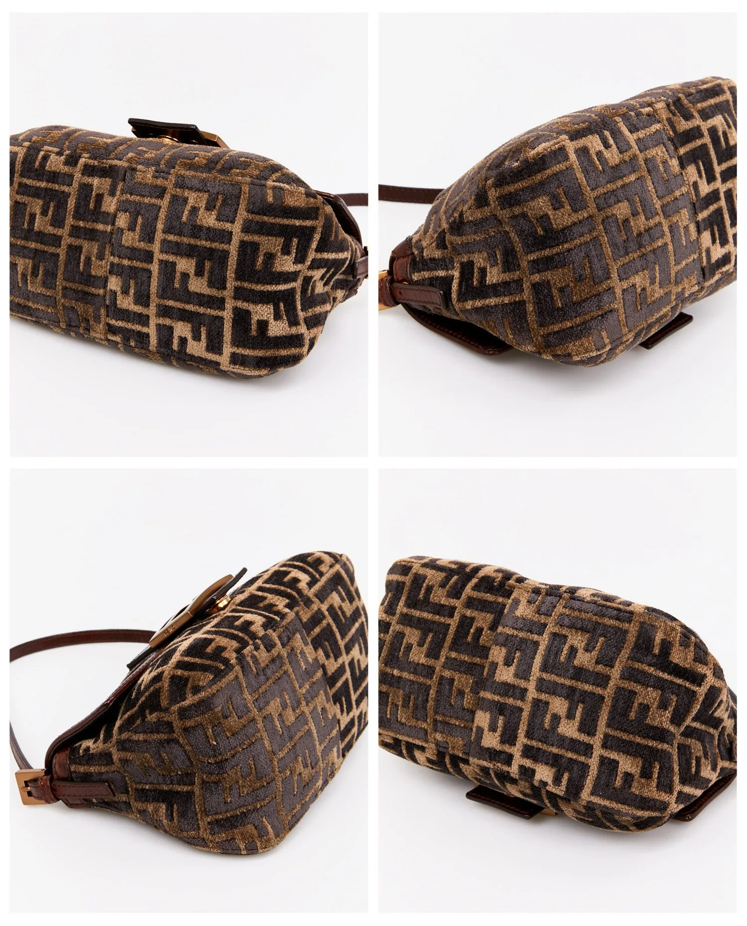 Le velours présente un toucher dense et soyeux, avec une texture légèrement côtelée soulignant le motif FF en ton sur ton brun. Le jeu de lumière sur la matière crée une profondeur visuelle qui varie selon l’angle, apportant du relief à l’ensemble. Les finitions en cuir brun lisse, visibles sur le rabat, les extrémités et la bandoulière, ajoutent de la structure et prolongent la durée de vie du sac. La boucle FF en métal bronze est placée sur le rabat. La bandoulière en cuir est ajustable, permettant un porté épaule près du corps.