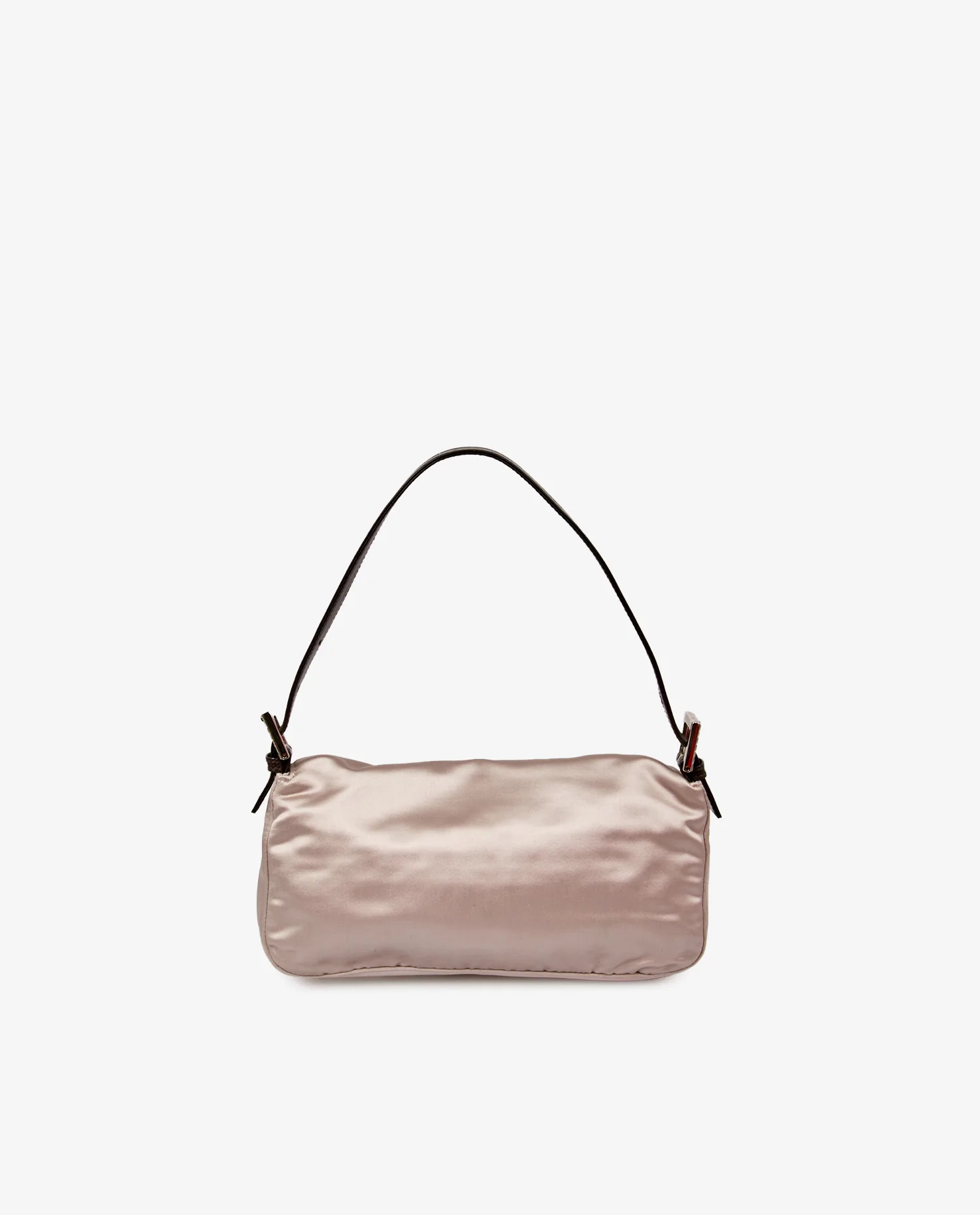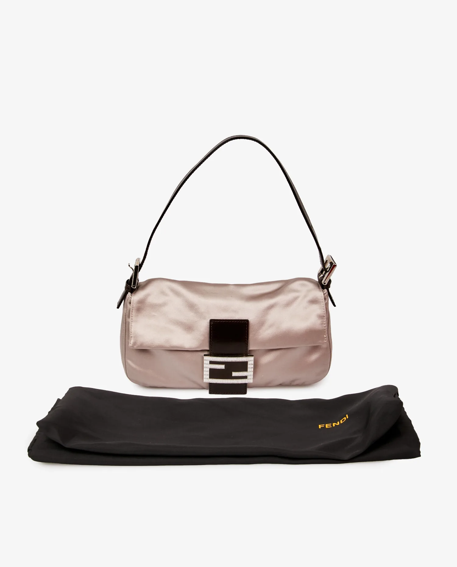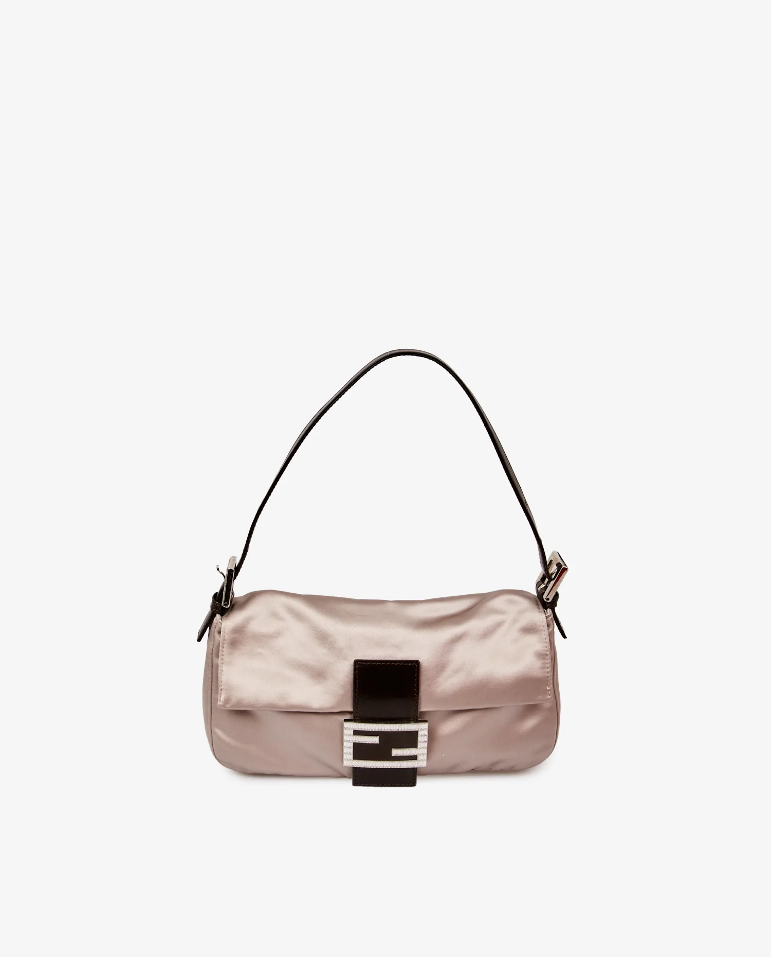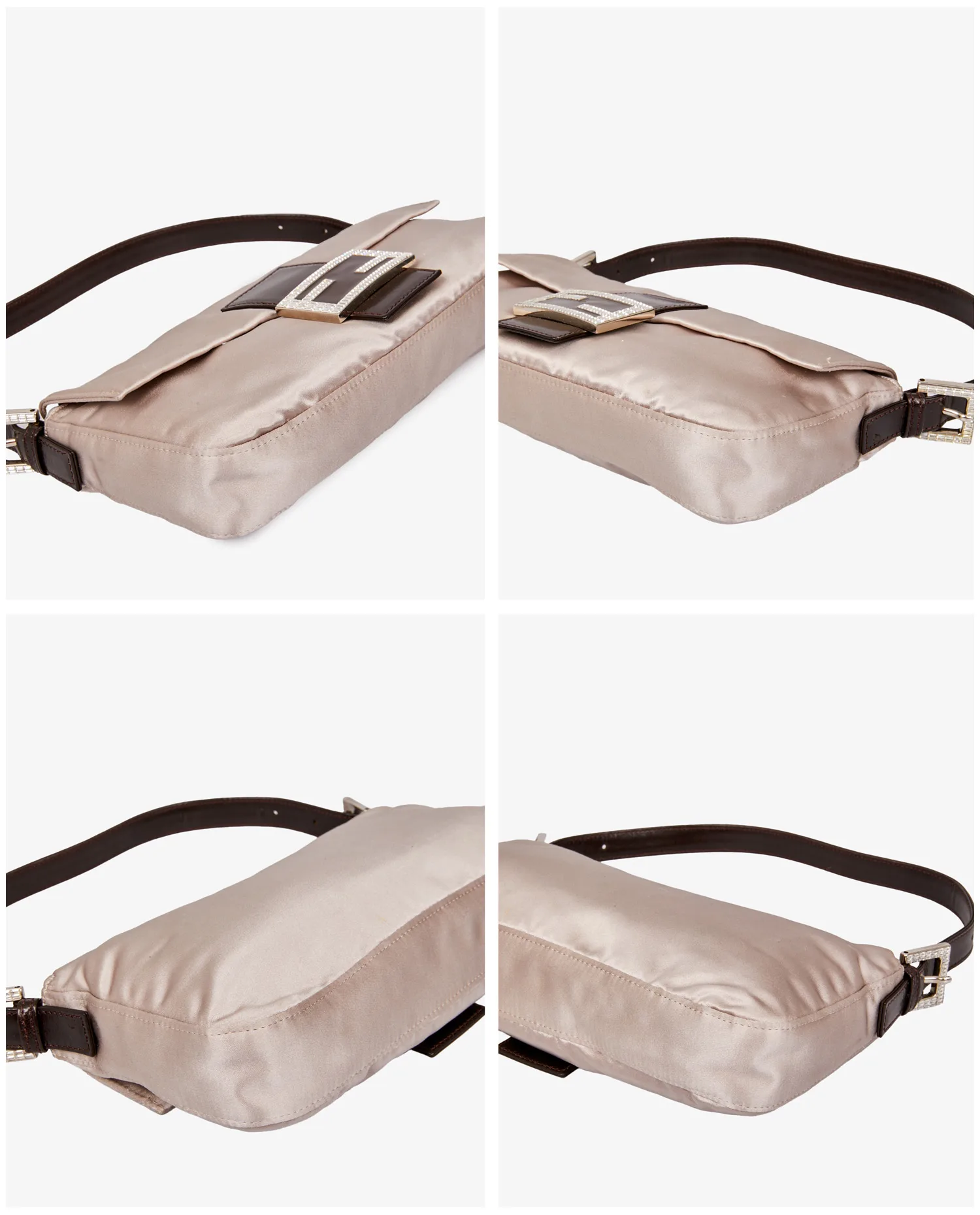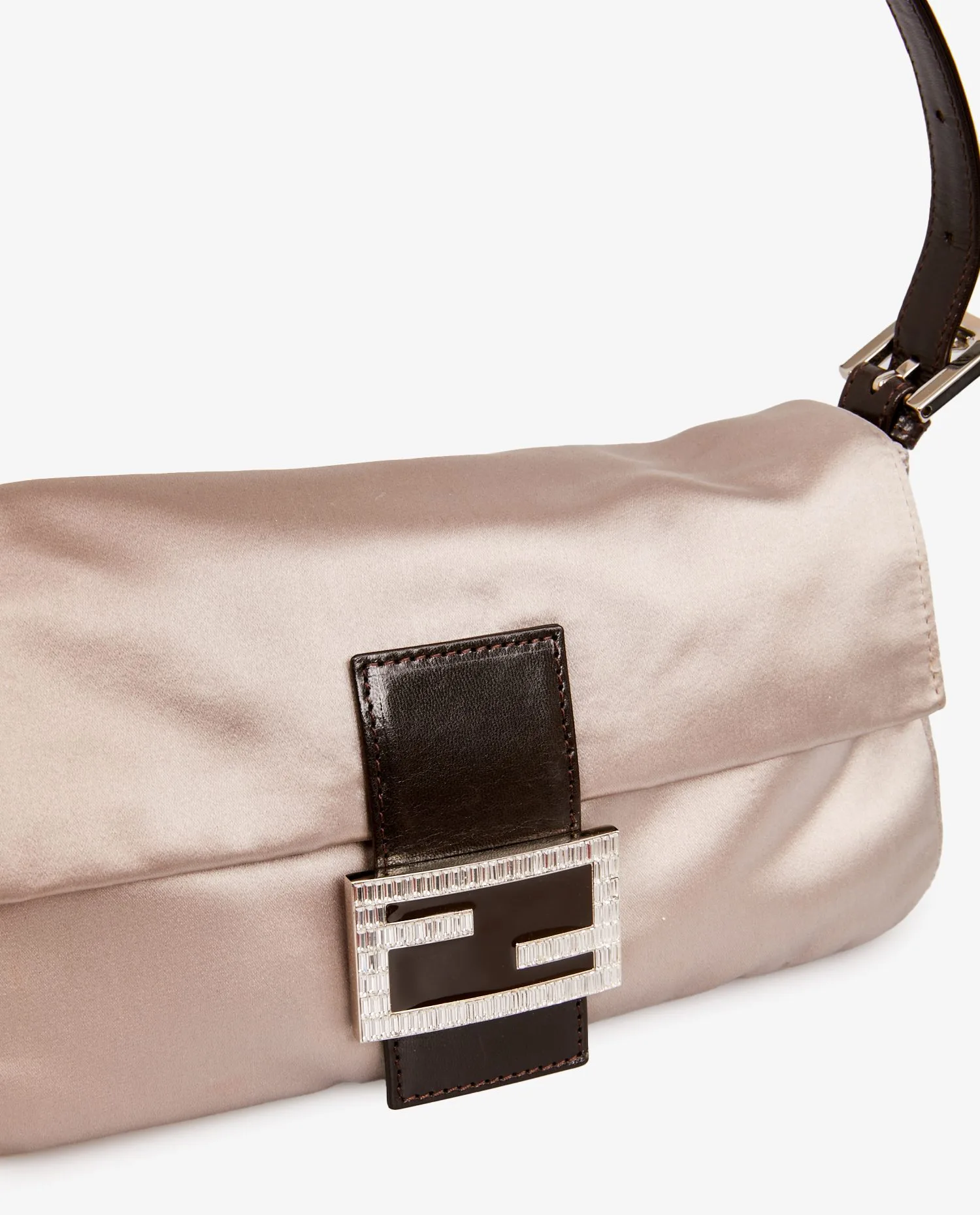 Sac Baguette Fendi vintage en satin gris clair avec sa boucle en strass Swarovski. Les finitions sont en cuir marron. L’intérieur est en satin marron brillant avec une poche zippée. Porté épaule ou au bras. En très bon état. Il sera livré dans son dustbag Fendi.