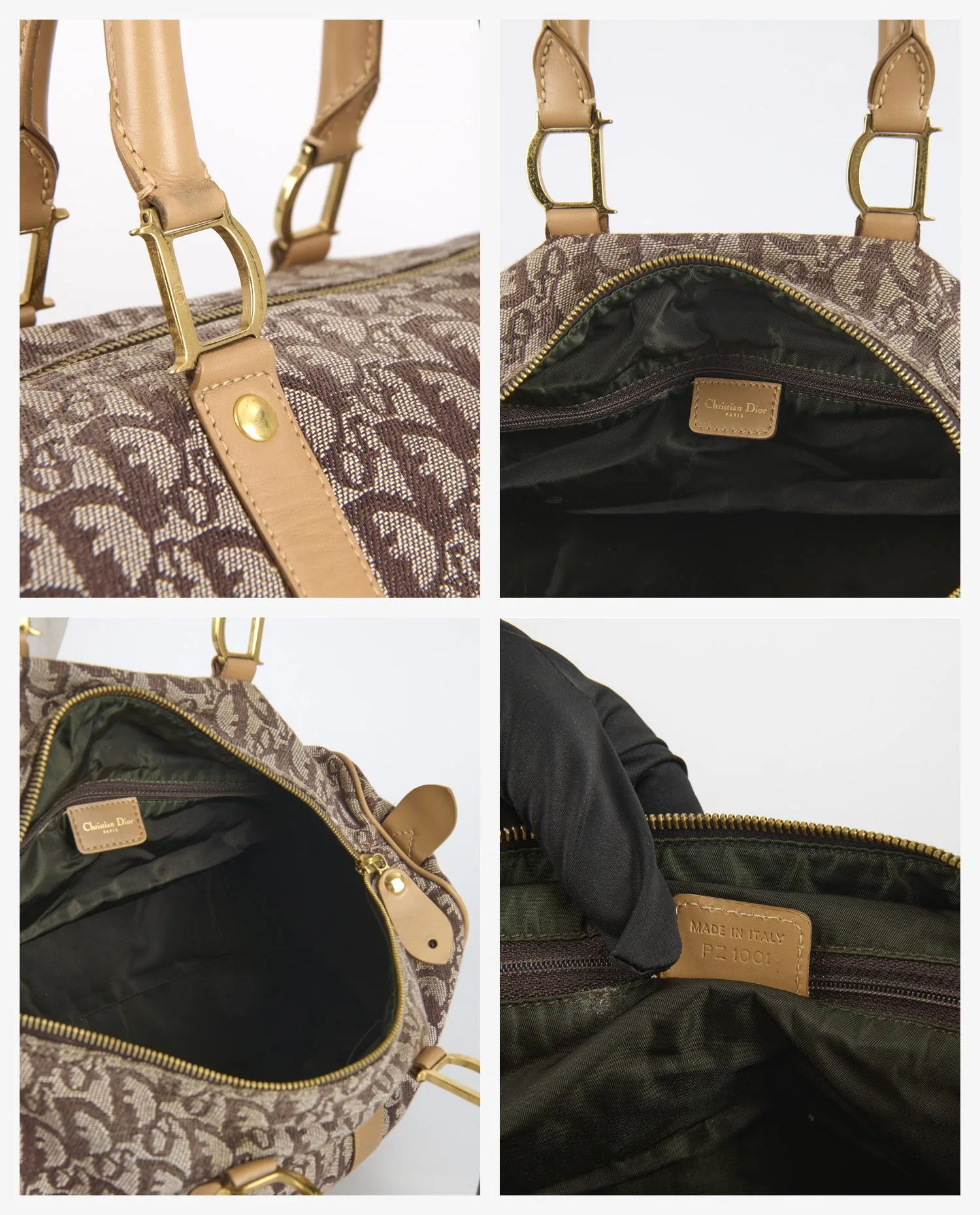 L’intérieur est entièrement doublé de toile synthétique noire. Il comporte une poche zippée latérale, idéale pour les petits objets. L’étiquette en cuir cousue à l’intérieur porte la mention “Christian Dior” et le marquage “Made in Italy”, avec un numéro de série estampé au dos, confirmant l’authenticité de la pièce. L’espace principal est spacieux, adapté aux essentiels du quotidien ou aux courts déplacements.