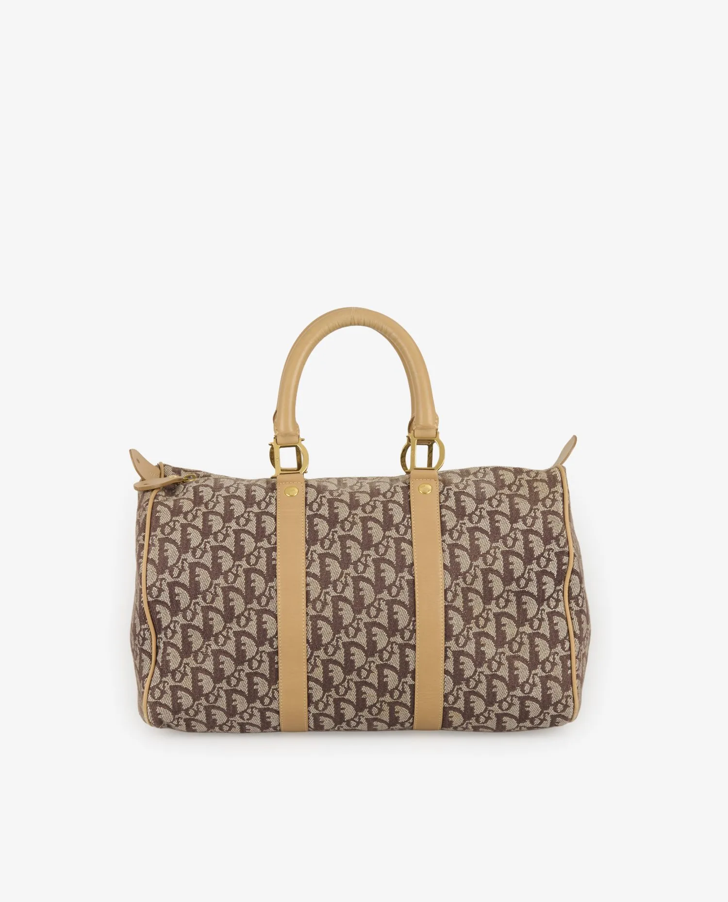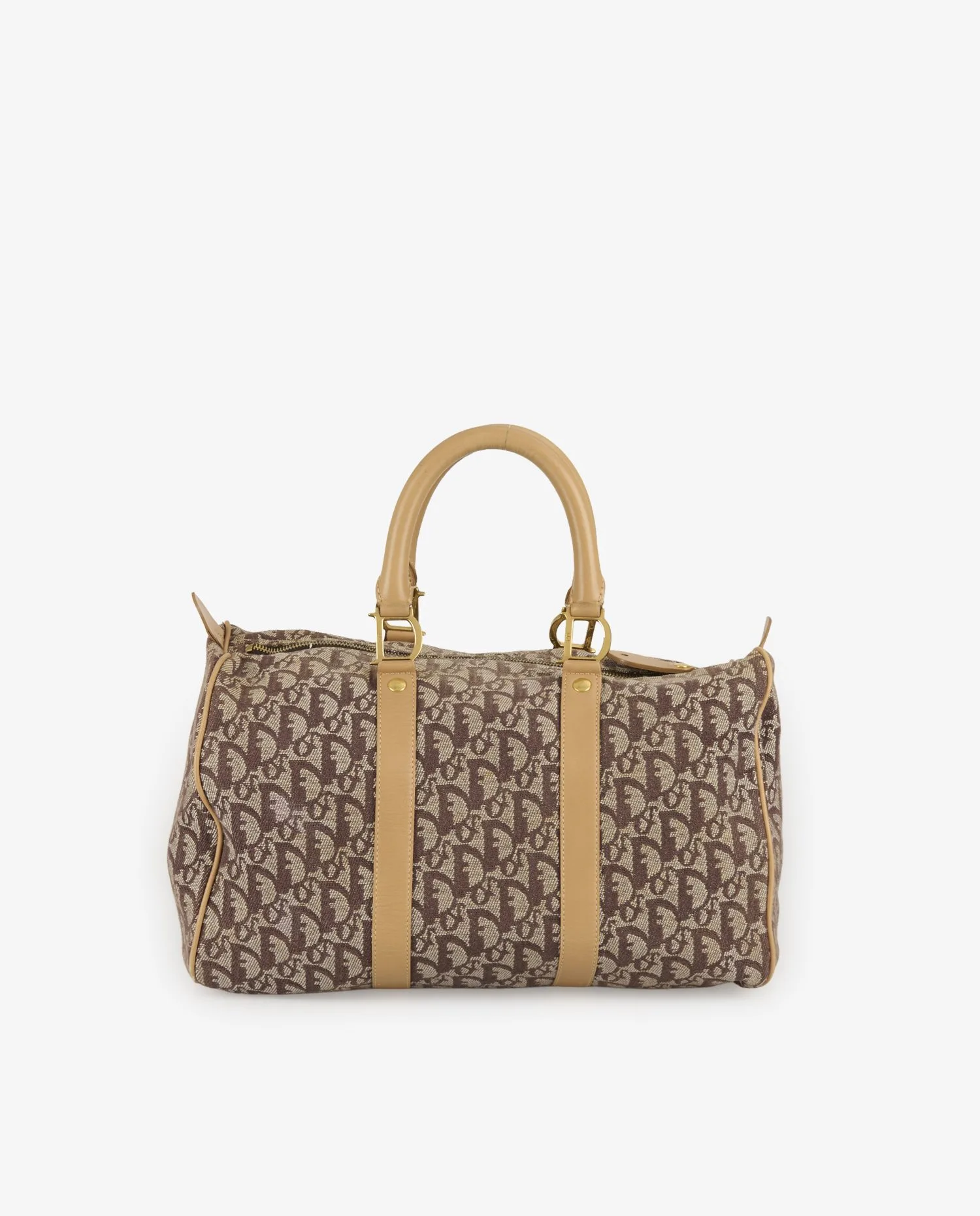Ce sac bowling Christian Dior de l’année 2001 est réalisé en toile monogram beige et marron, arborant le motif emblématique “Dior Oblique” en all-over. Il est structuré par des renforts et poignées en cuir lisse camel, avec des finitions métalliques dorées. De format moyen, ce modèle est conçu pour une utilisation quotidienne ou comme sac de week-end léger. La fermeture zippée sécurise l’ensemble, et l’intérieur est doublé de toile noire. En bon état général, il présente une patine modérée cohérente avec son âge.