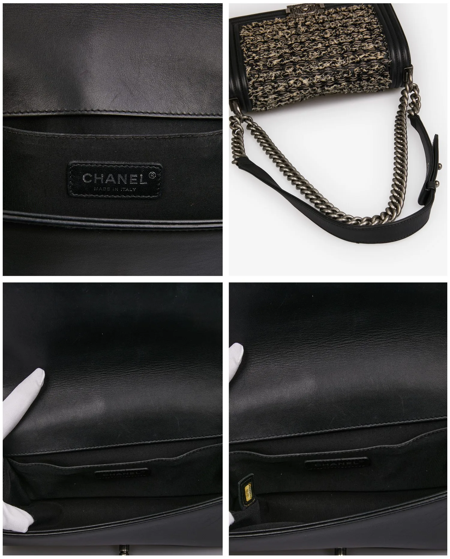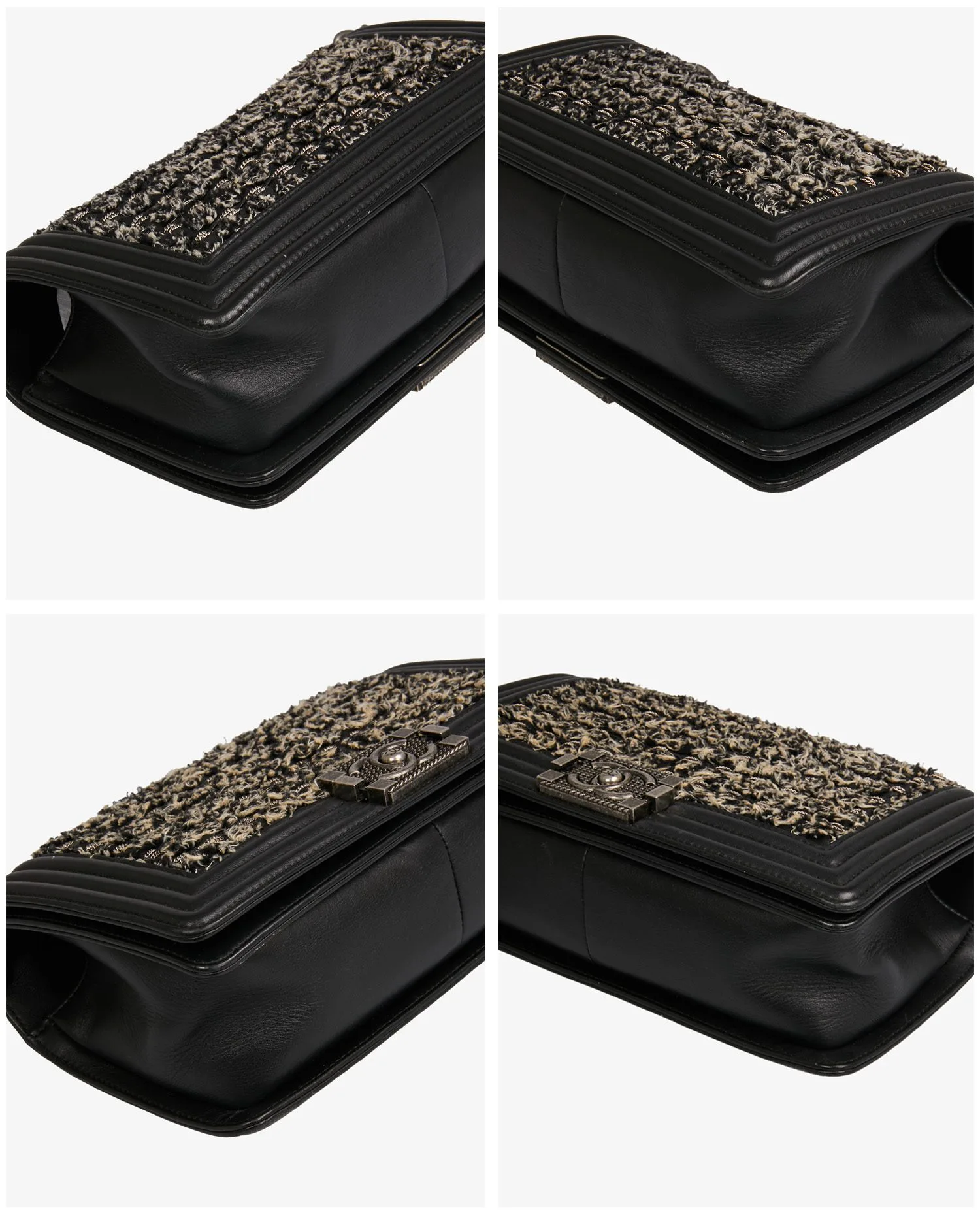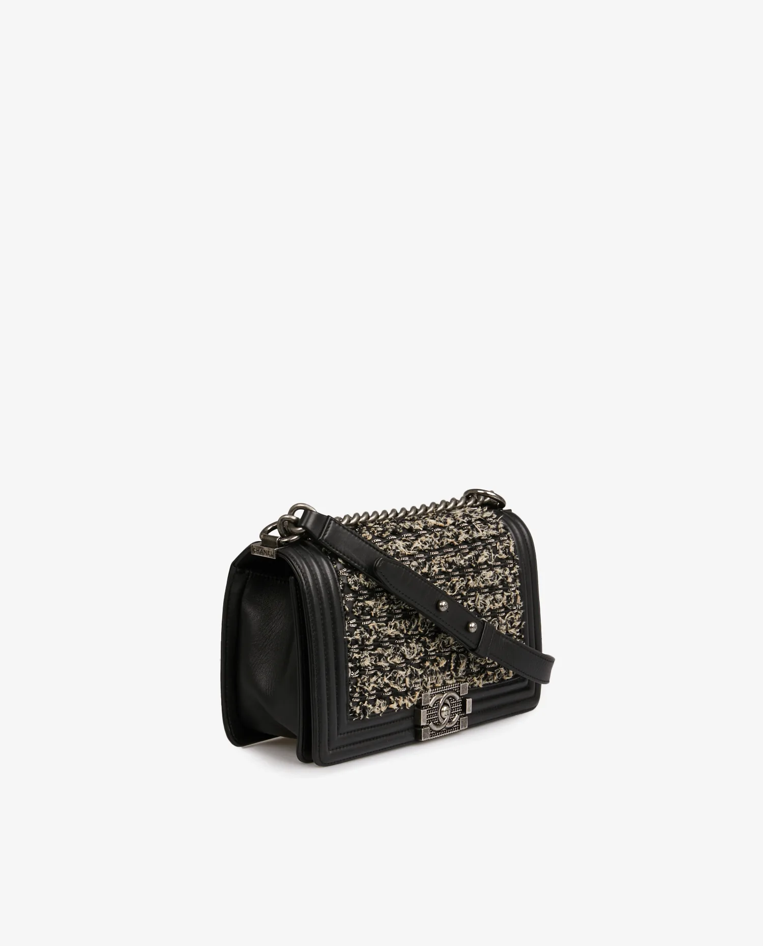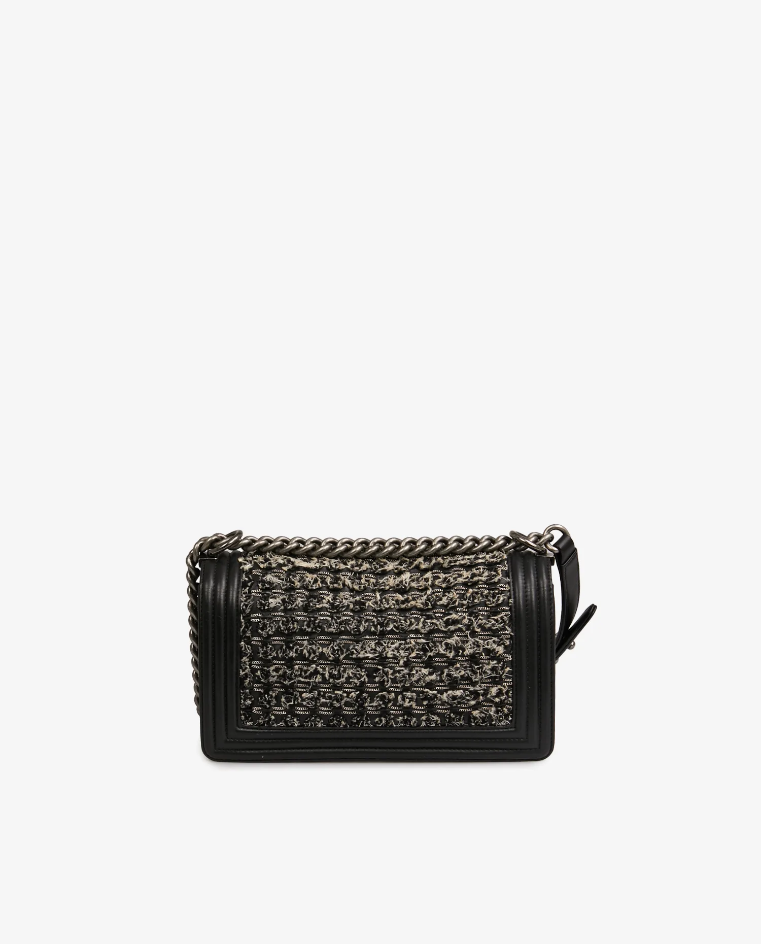 Sac Boy Médium Chanel en cuir d’agneau noir tweed gris avec des chaines argentées entremêlées. La bijouterie est en métal argenté vieilli. L’intérieur est en tissu noir avec une poche plaquée. Porté épaule en double ou en bandoulière. En très bon état.