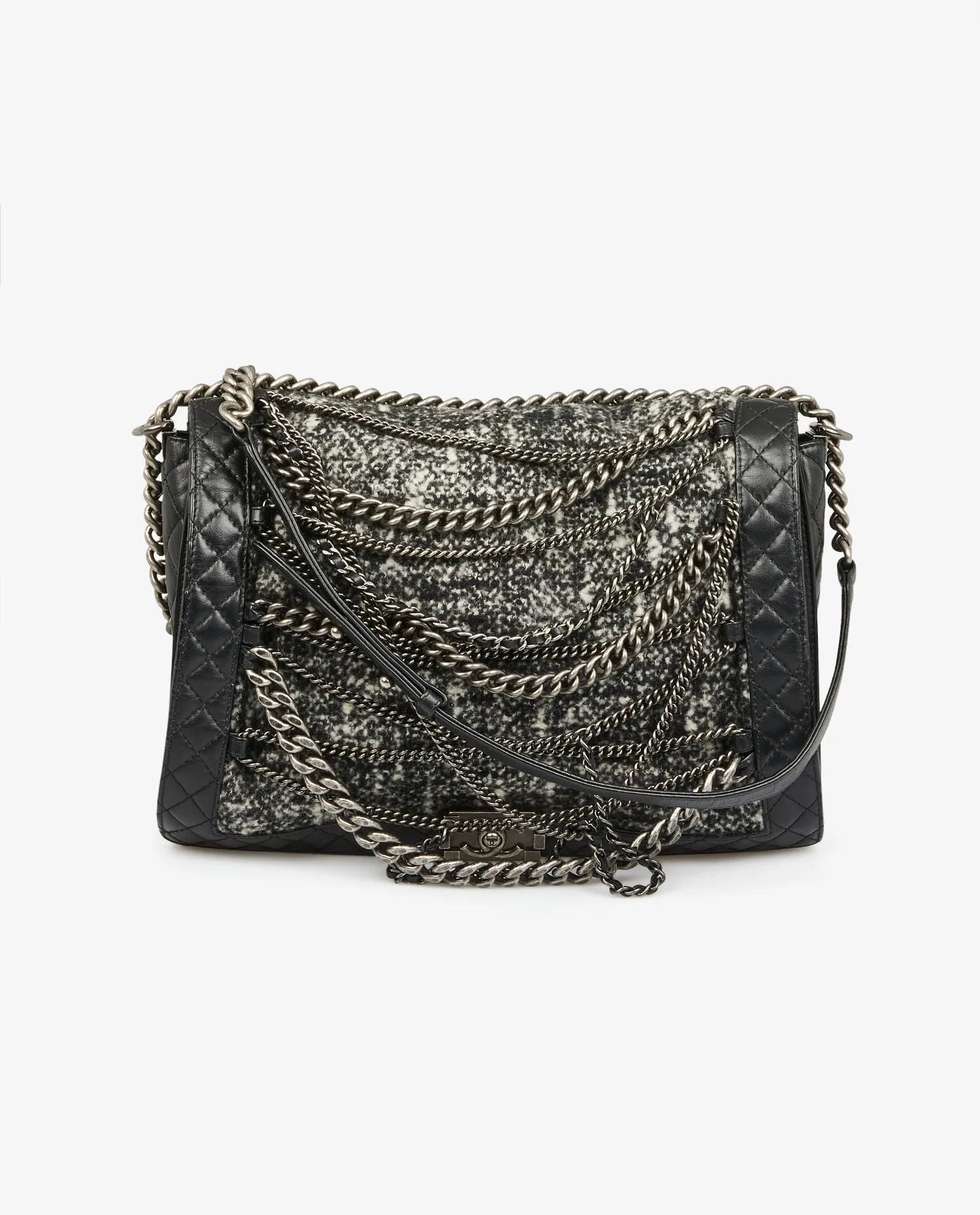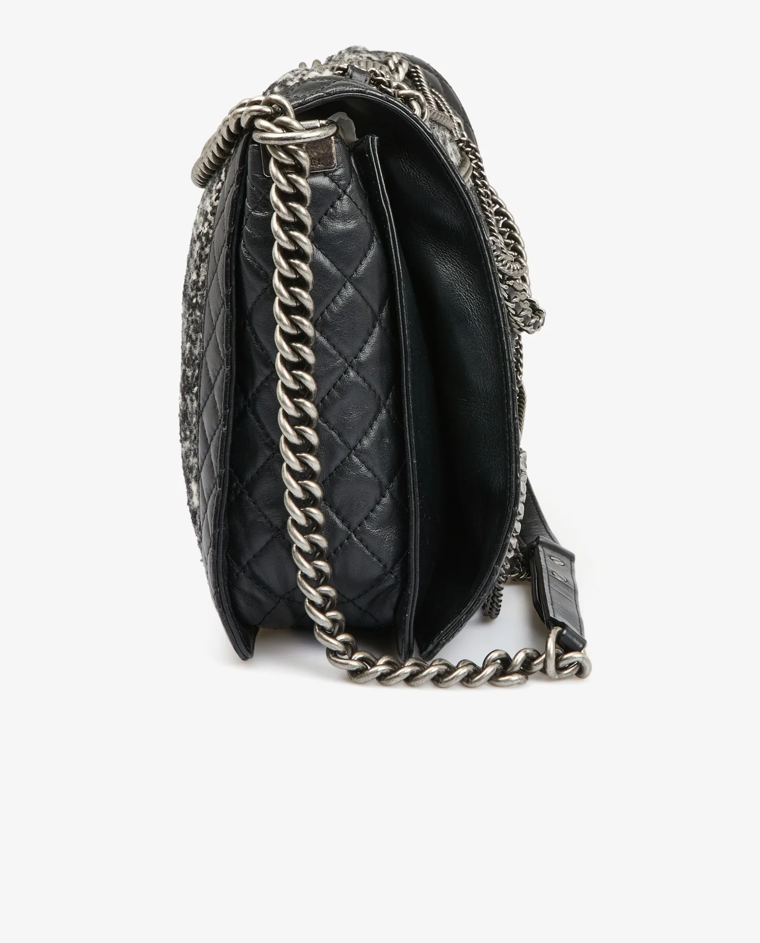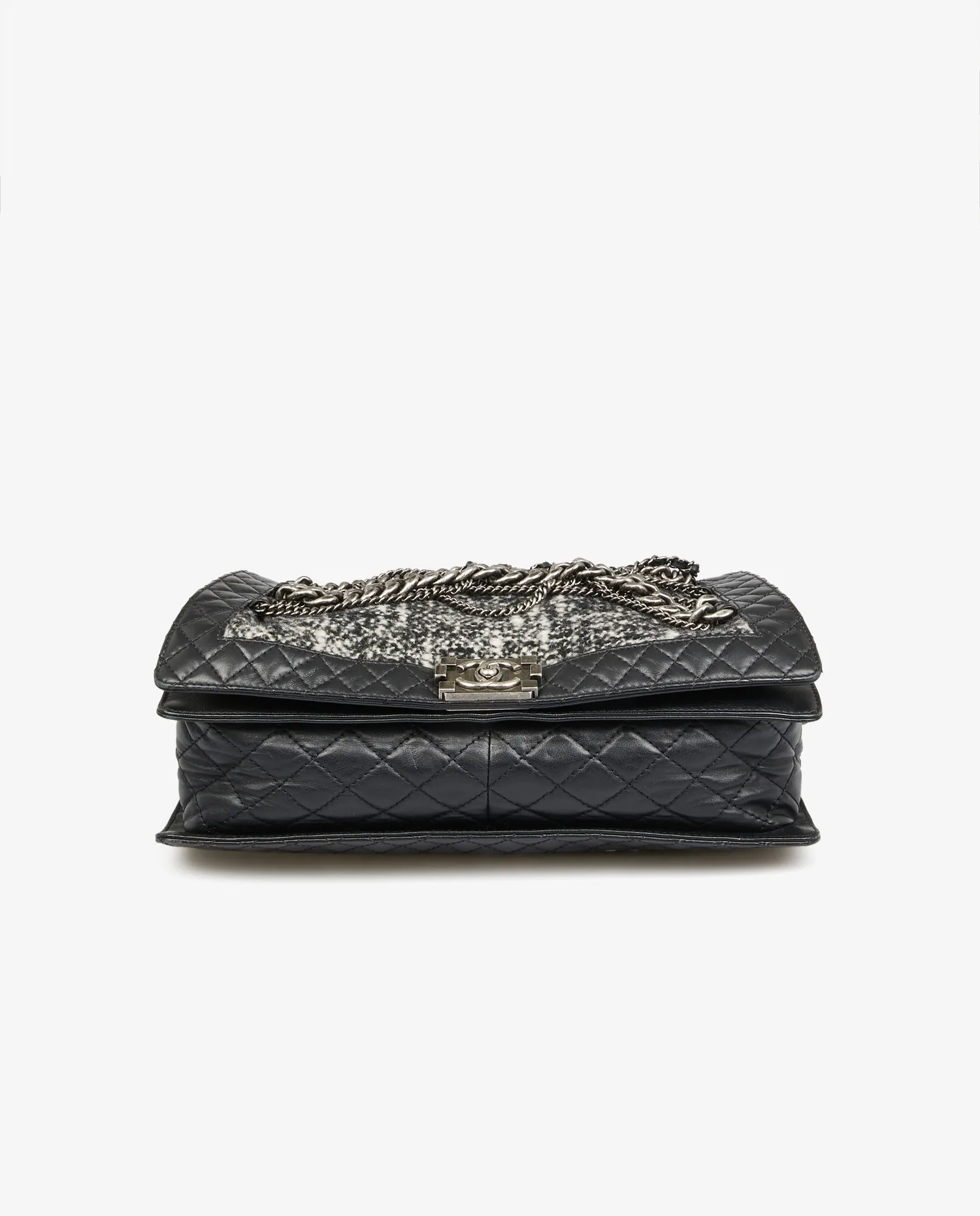 Sac Boy Chanel GM en tweed gris et cuir noir. Bijouterie argent vieilli. L’intérieur est en tissu noir. Porté épaule ou en bandoulière qui mesure 98cm. En très bon état.