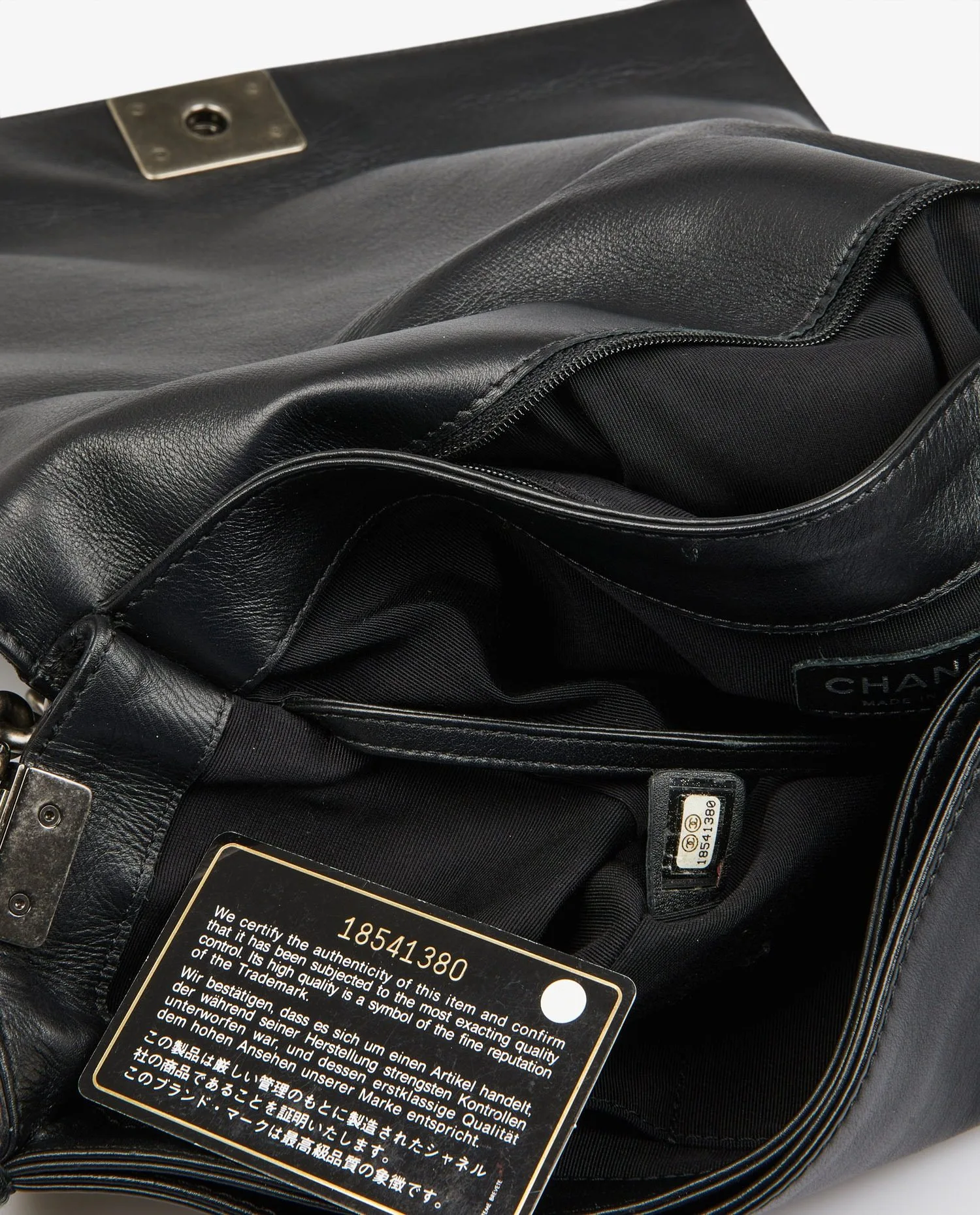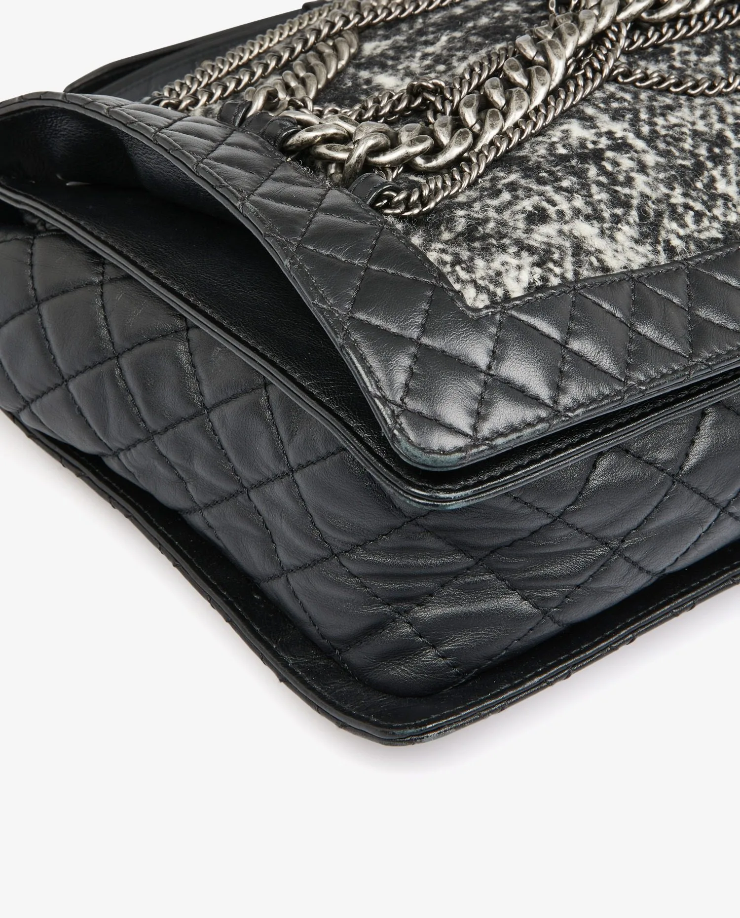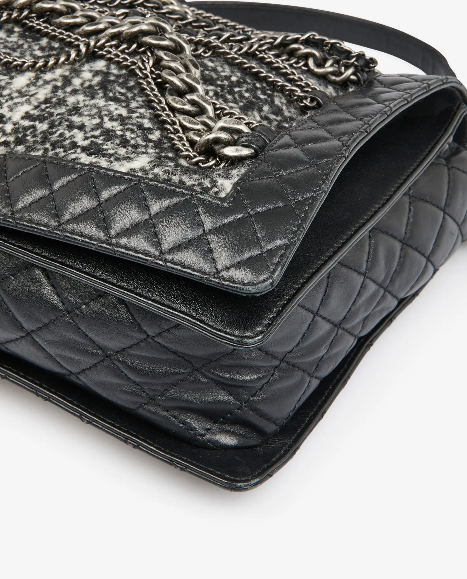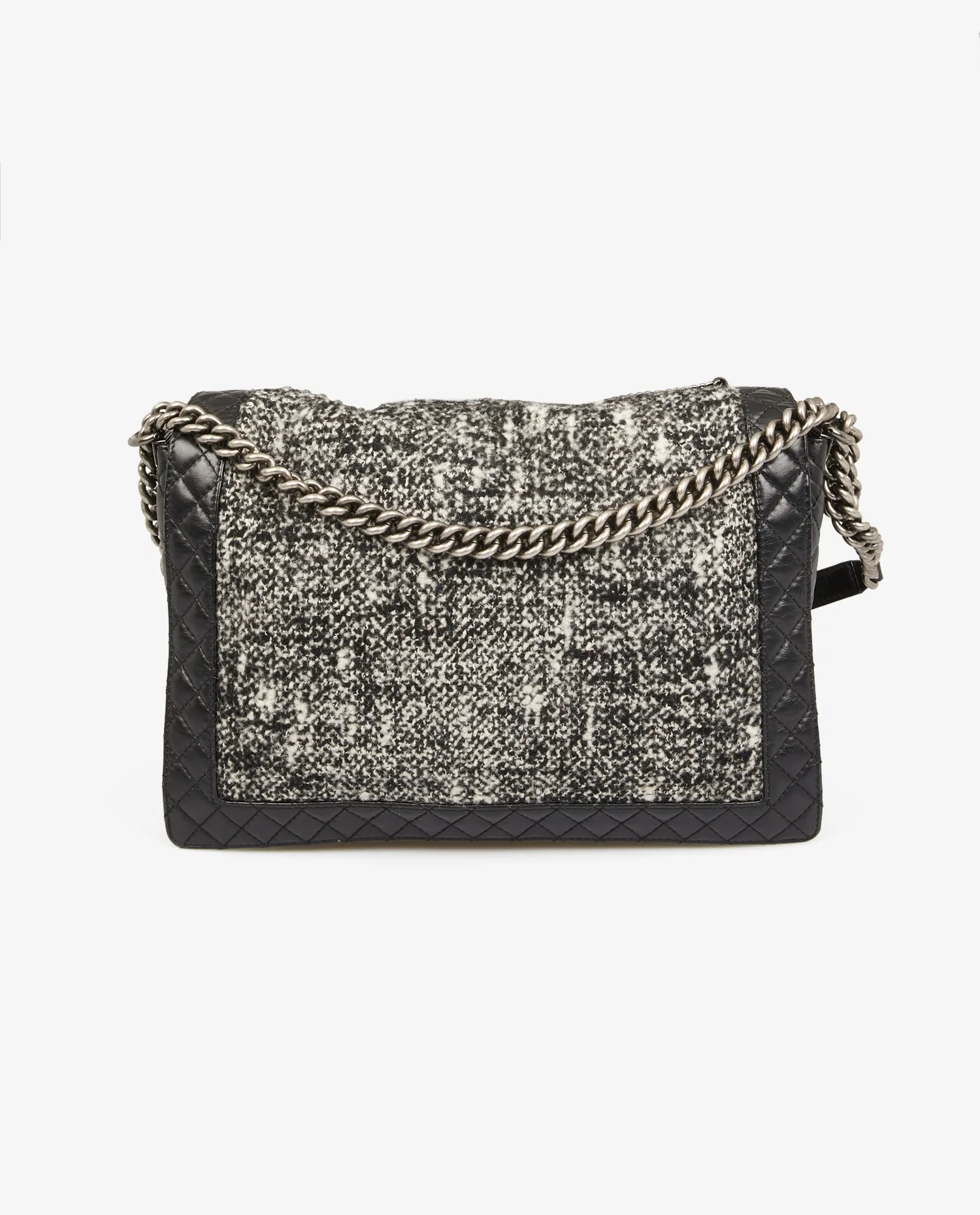 Sac Boy Chanel GM en tweed gris et cuir noir. Bijouterie argent vieilli. L’intérieur est en tissu noir. Porté épaule ou en bandoulière qui mesure 98cm. En très bon état.